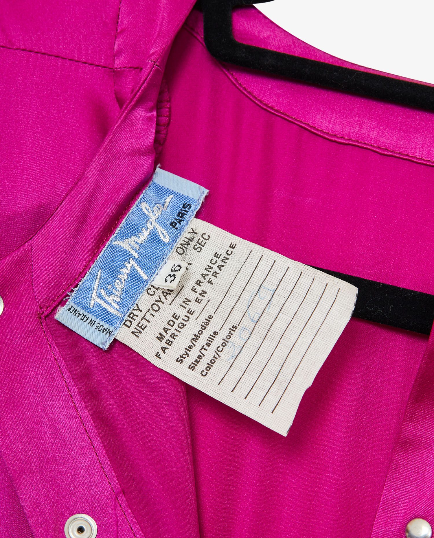 Cette robe Thierry Mugler vintage en soie fuchsia est une pièce rare pour les collectionneurs de mode et les amateurs de vêtements signature des années 80. Son jeu de volumes et sa couleur vibrante incarnent une esthétique forte et sophistiquée. Grâce à sa coupe travaillée et sa matière noble, elle offre une présence marquante sans artifice, fidèle à l’esprit Mugler. Une robe idéale pour les occasions spéciales ou comme pièce maîtresse d’une garde-robe vintage.