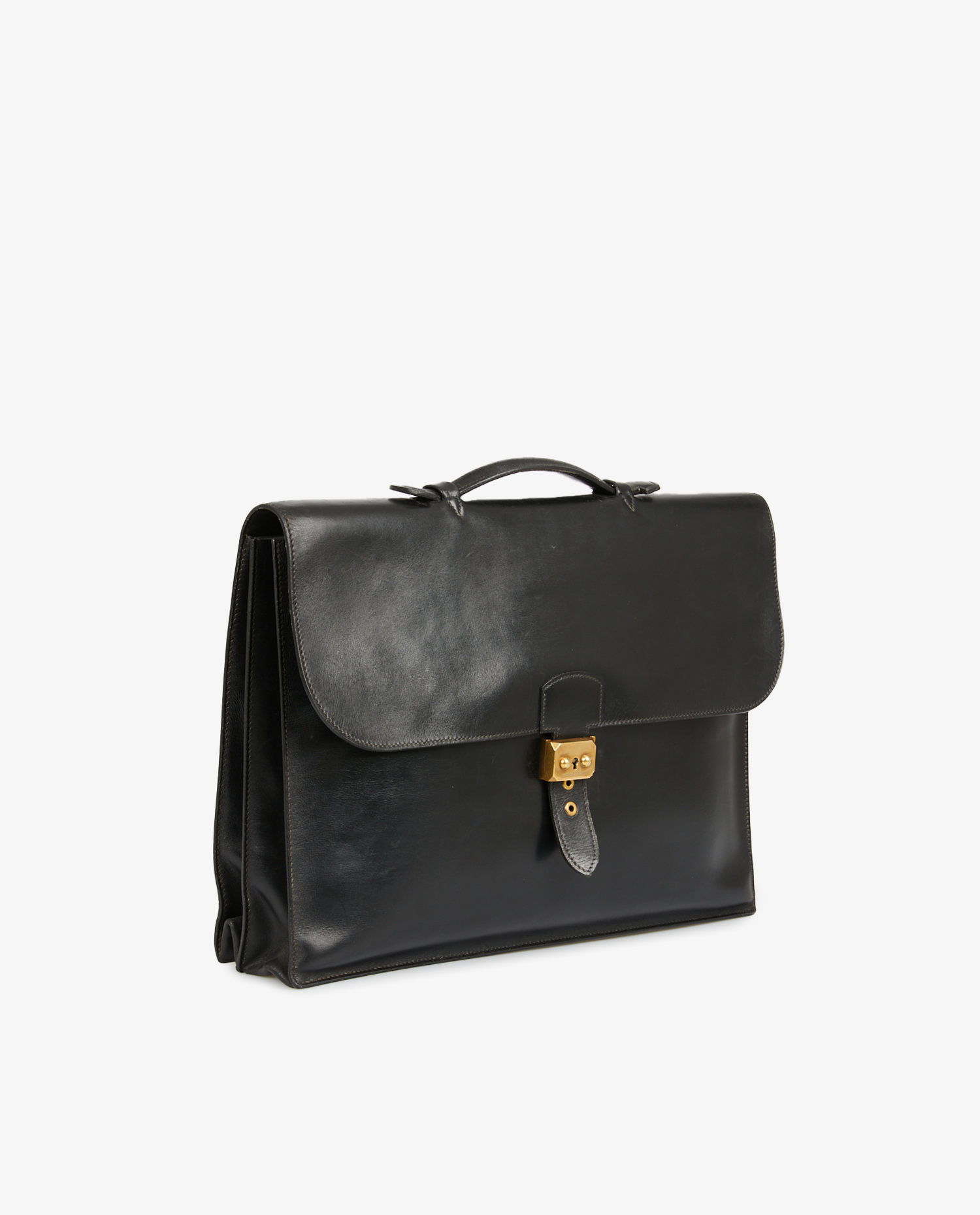 Sac à dépêches Hermès vintage en cuir box noir. L’intérieur est en suède gris. En très bon état. Quelques marques d’usures d’usage sur la languette du fermoir.
