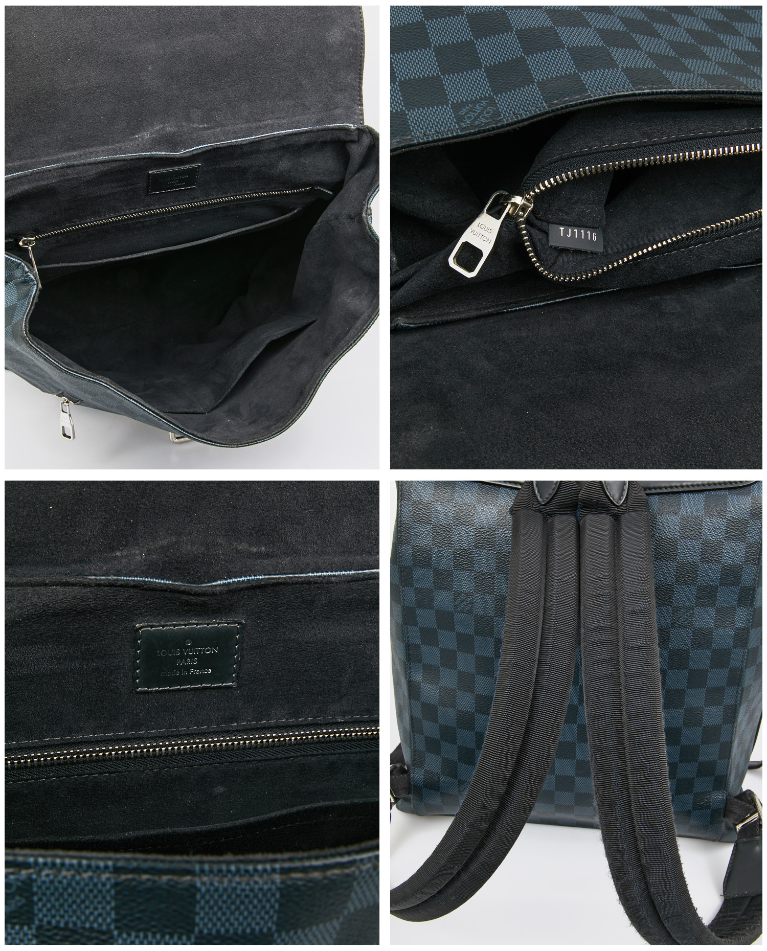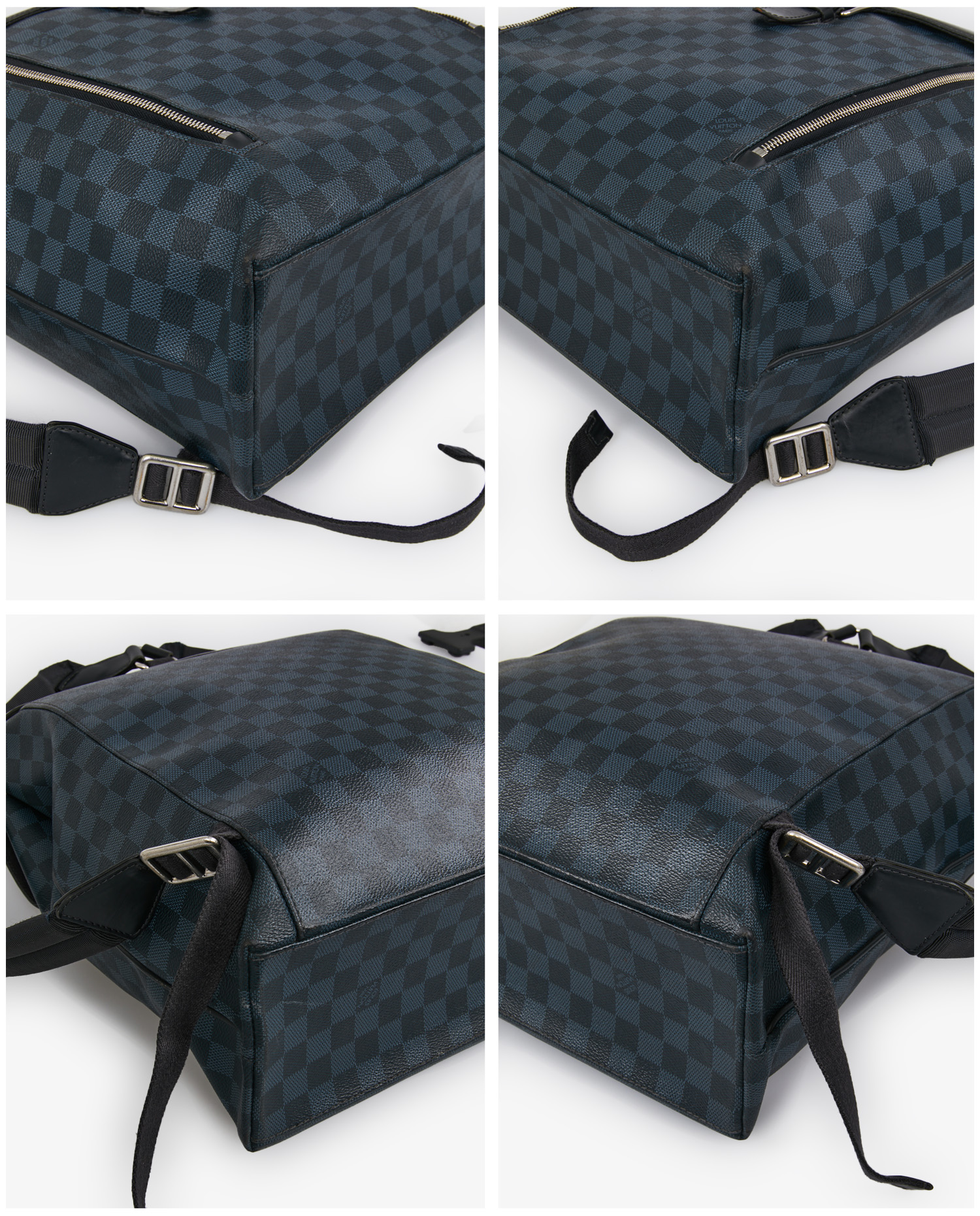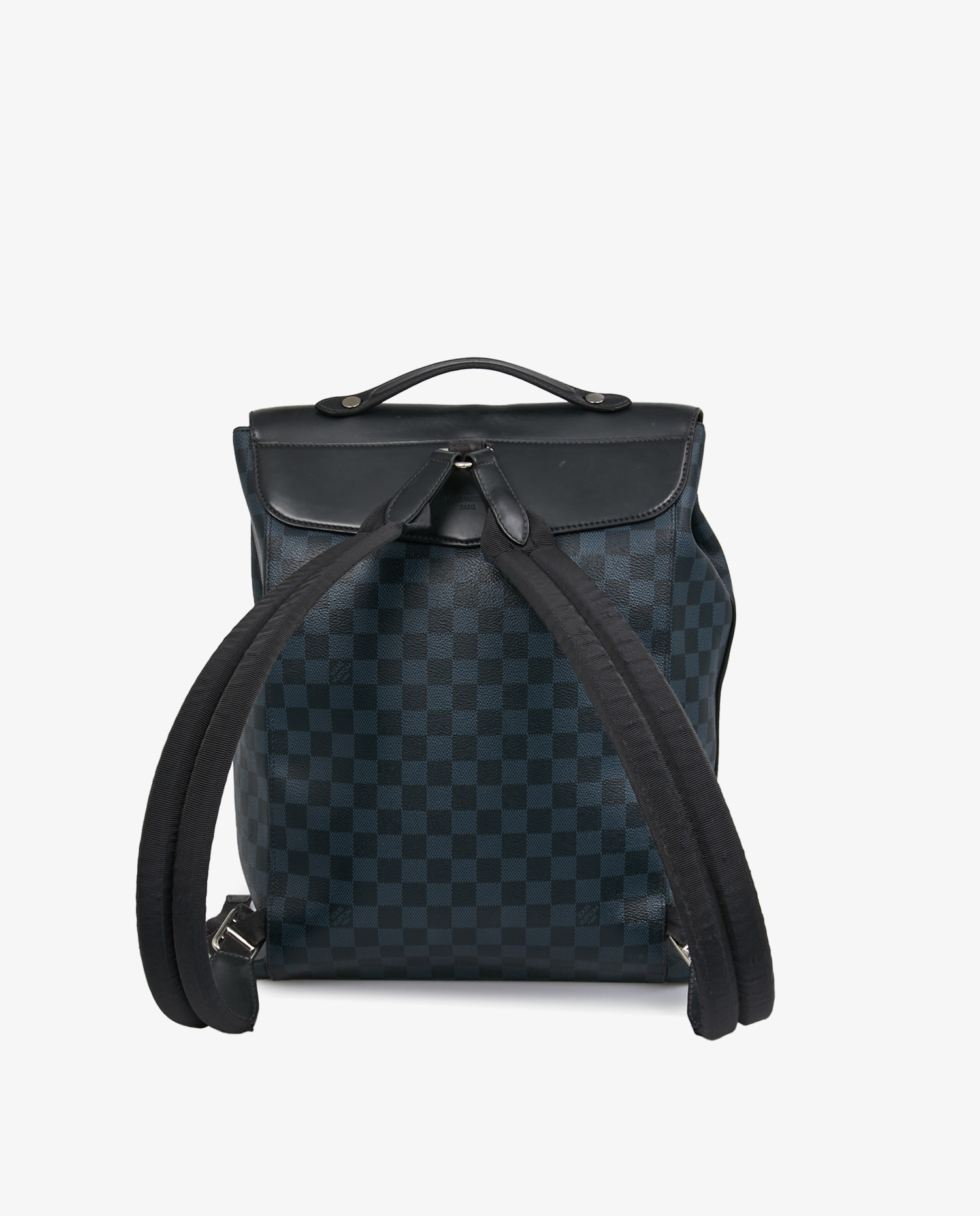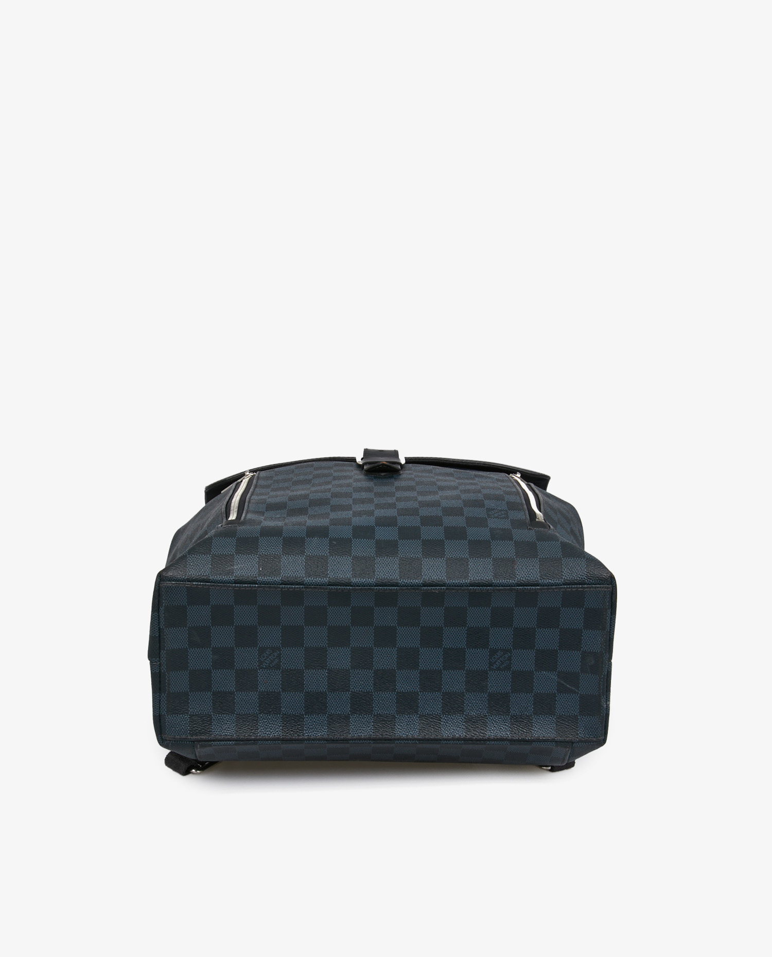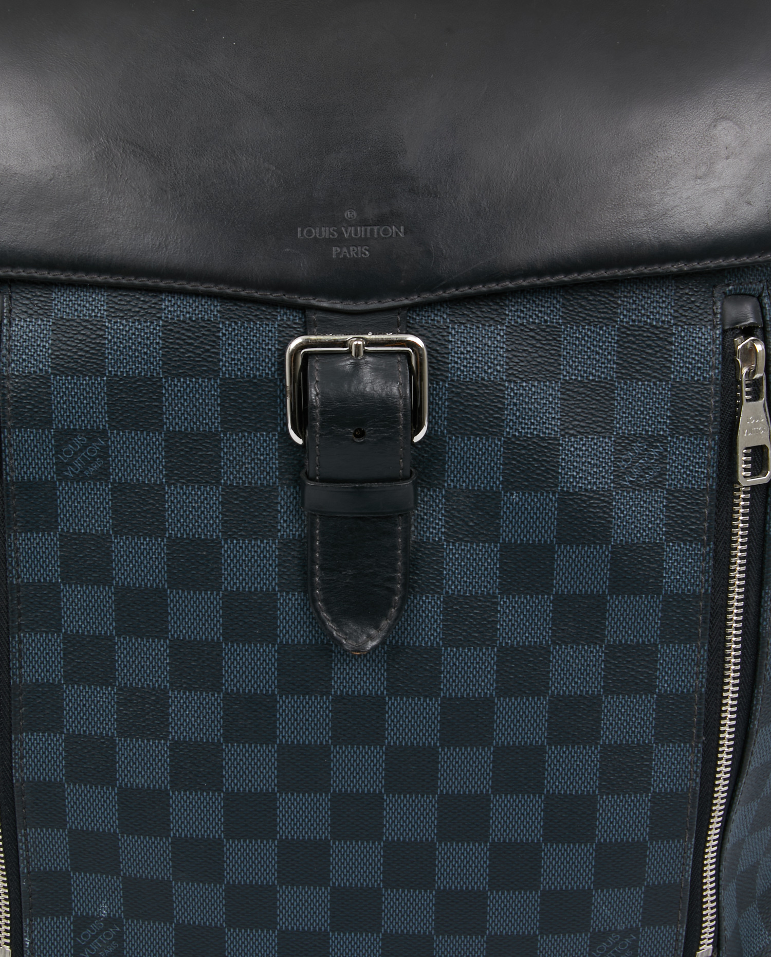 La toile enduite Damier Graphite se distingue par son quadrillage noir et gris aux reflets discrets. Le rabat supérieur en cuir lisse noir porte un marquage Louis Vuitton Paris embossé. Les poches frontales zippées, les boucles en métal argenté et les bretelles ajustables en toile technique avec renforts en cuir complètent l’ensemble.