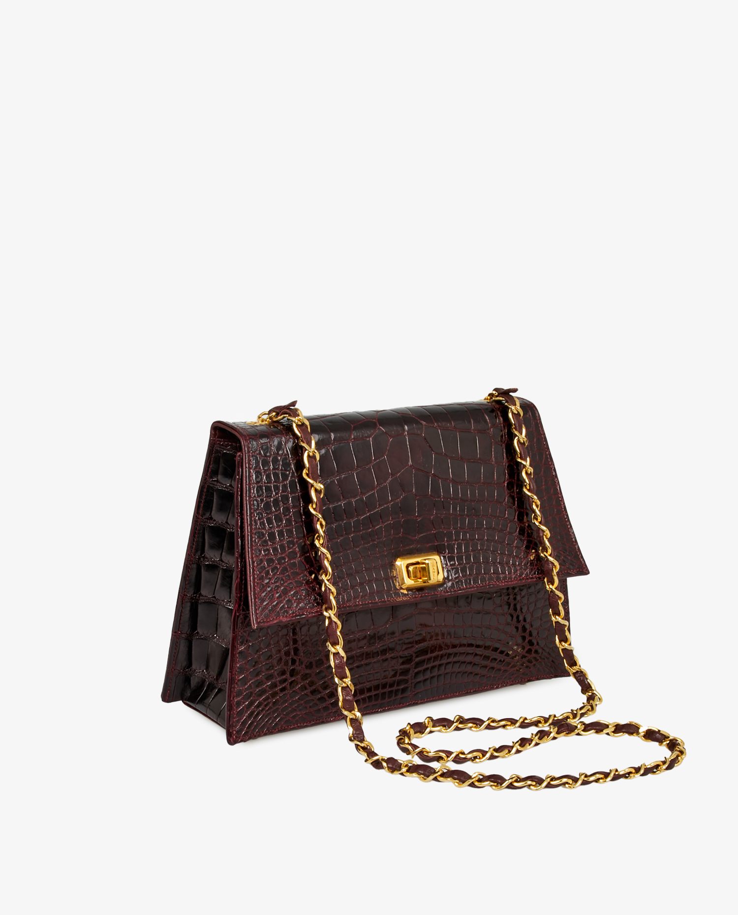 La peau de crocodile présente un relief naturel élégant, avec des écailles uniformes au fini brillant. La couleur bordeaux profonde accentue le caractère luxueux du sac tout en restant sobre et polyvalente. La chaîne dorée à maillons est entrelacée de cuir bordeaux, assurant un porté confortable à l’épaule ou en croisé. Le rabat rigide et les finitions soignées soulignent la précision artisanale du modèle. Les coutures sont parfaitement exécutées.
