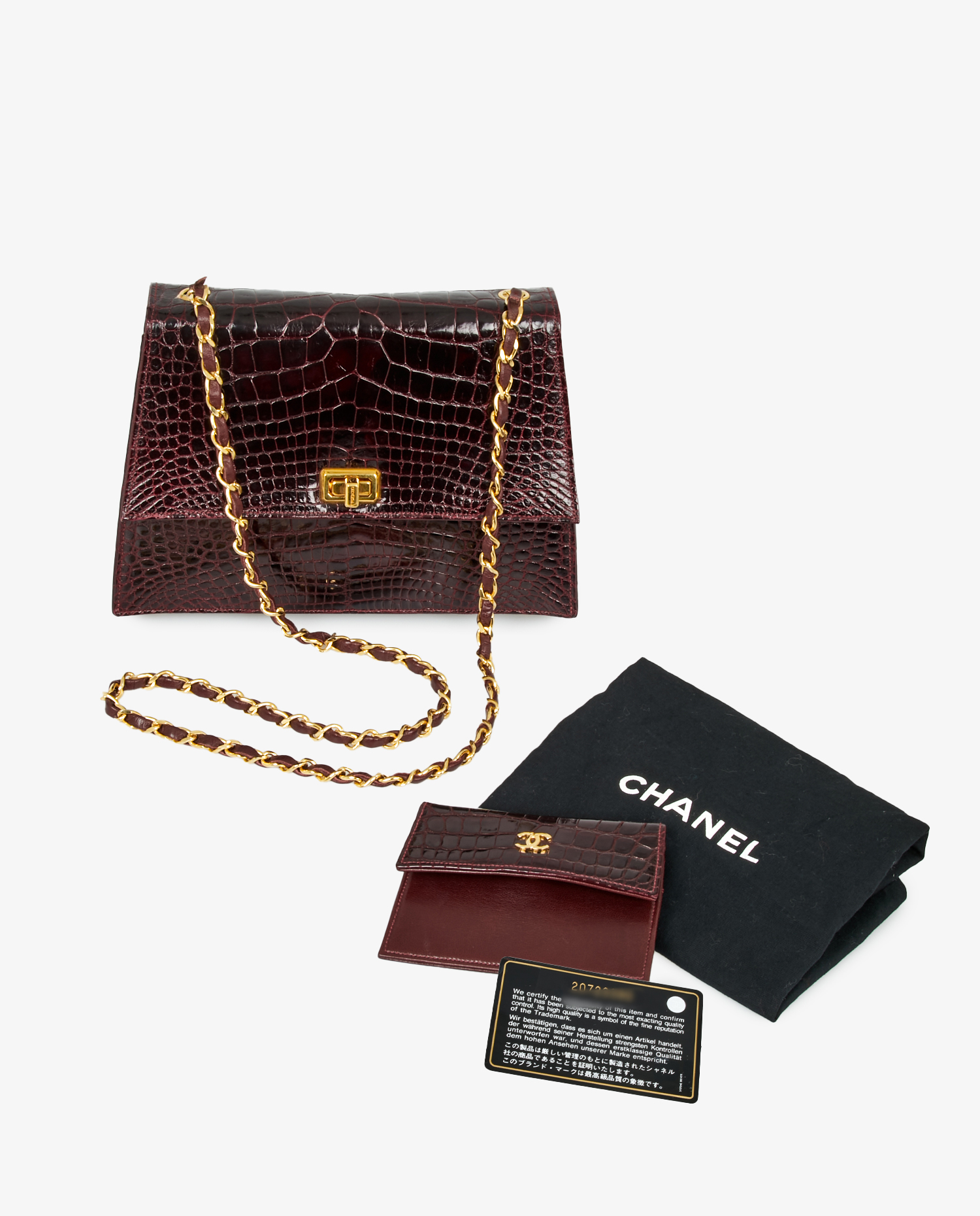 L’intérieur est doublé de cuir d’agneau bordeaux, souple et lisse au toucher. Ce cuir noble, à la finition légèrement satinée, confère au sac une continuité esthétique et un confort à l’usage. Le compartiment principal est accompagné d’une poche plaquée, suffisamment grande pour accueillir des objets essentiels. Le sac est livré avec un petit porte-monnaie assorti en crocodile bordeaux, comprenant un compartiment intérieur dans lequel est soigneusement rangée la carte d’identité du produit. Les marquages Chanel et “Made in France” sont embossés à chaud, soulignant l’authenticité du modèle.