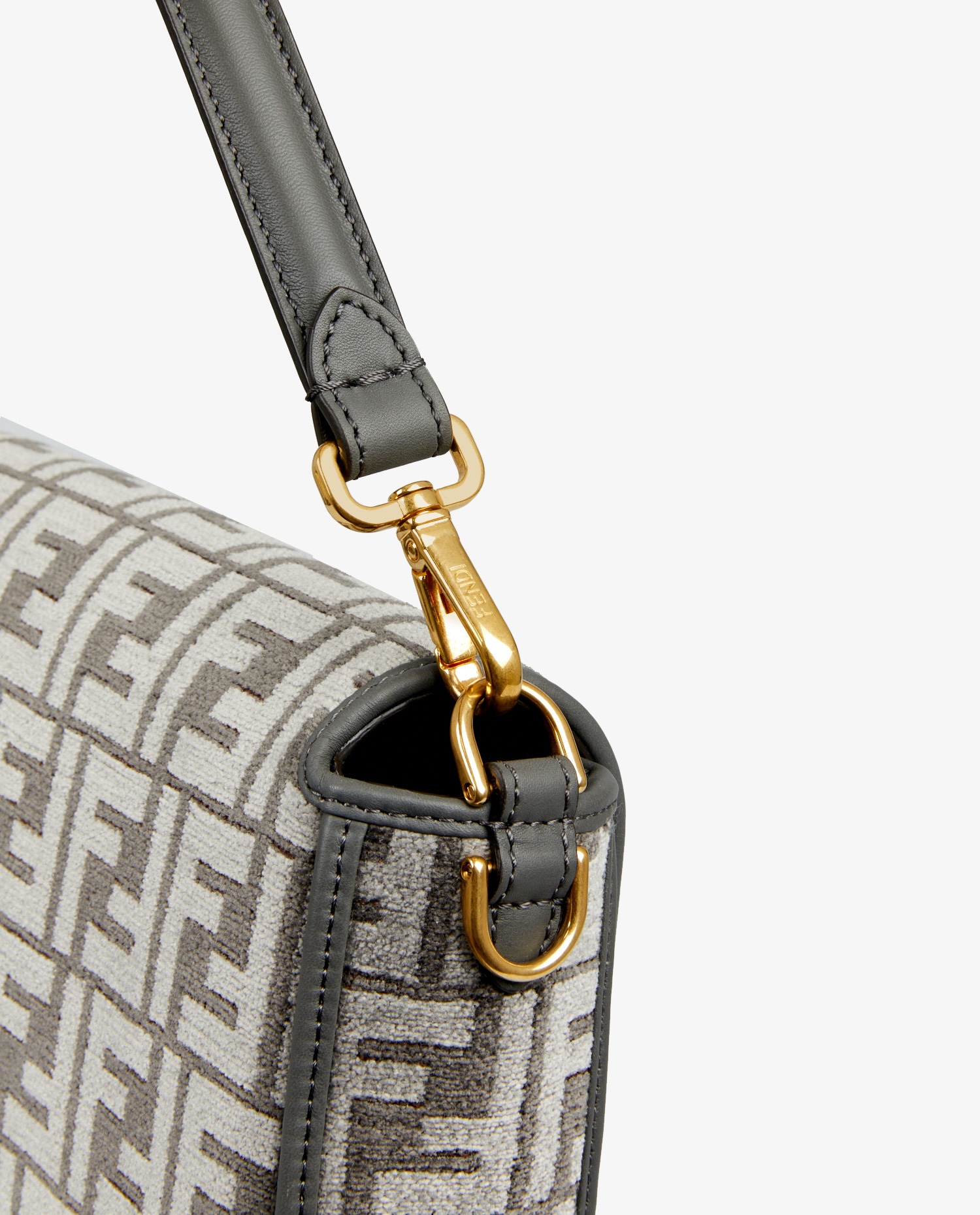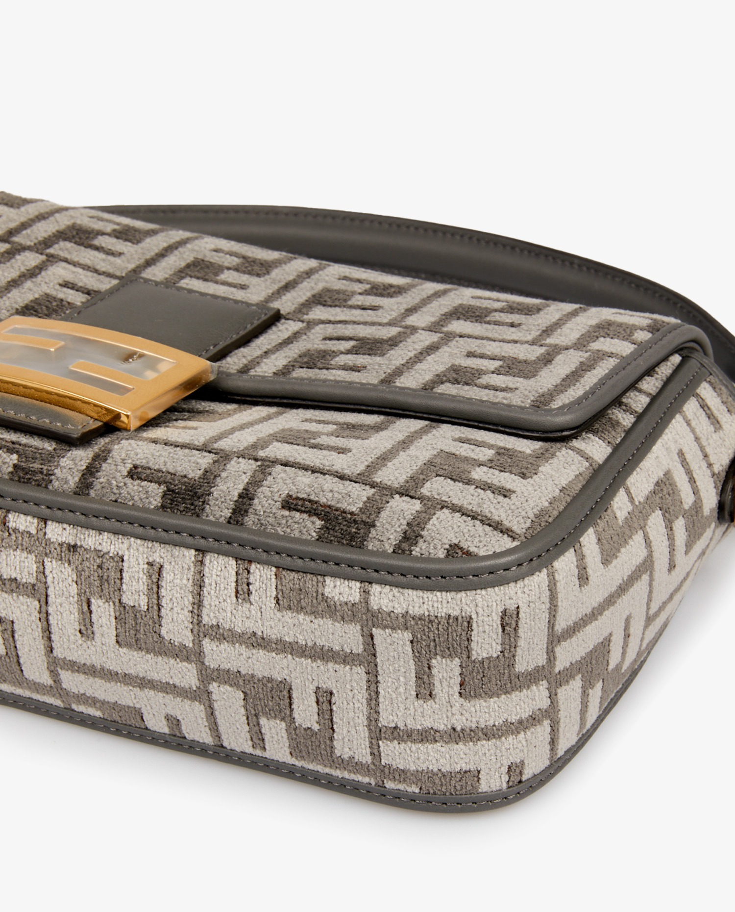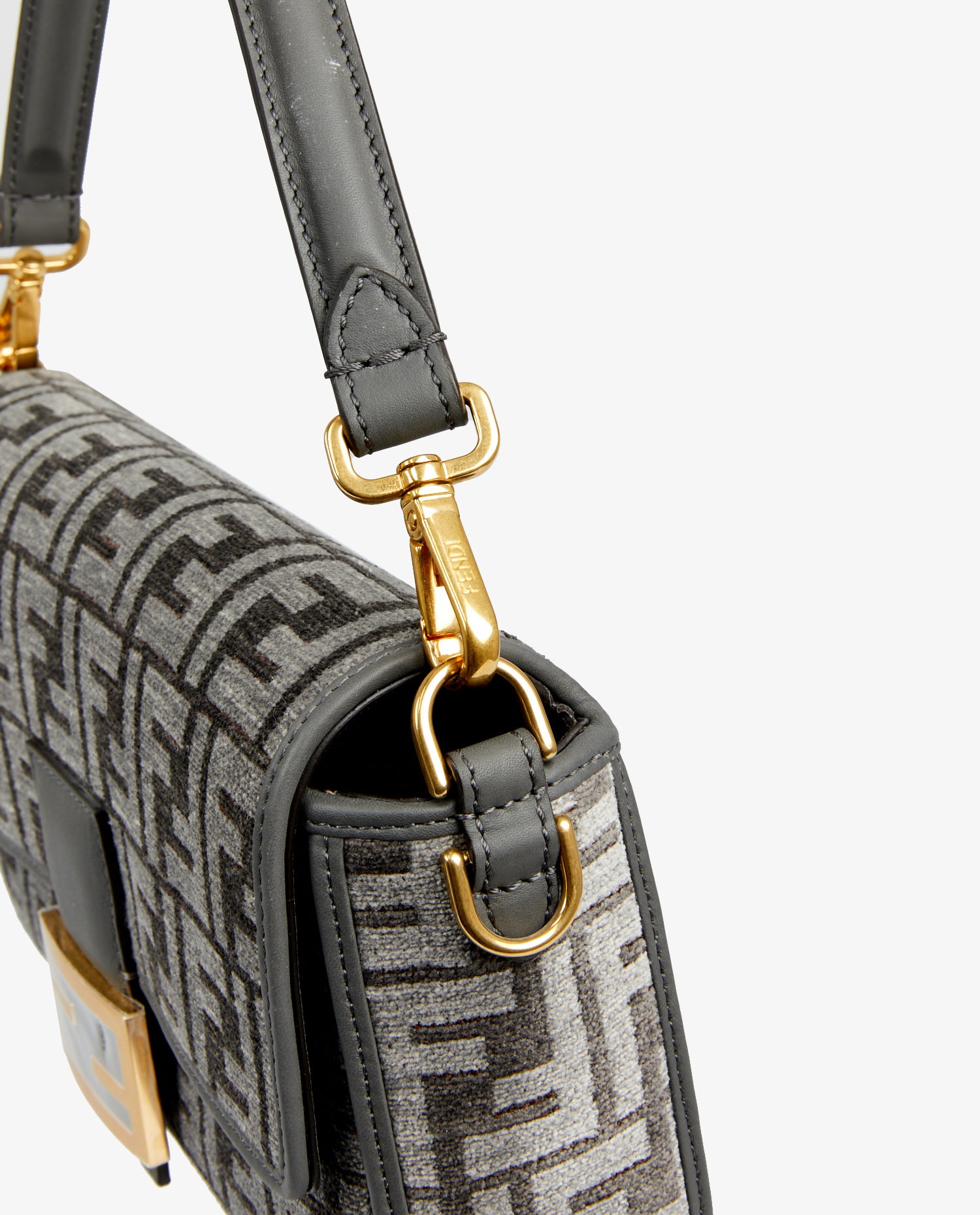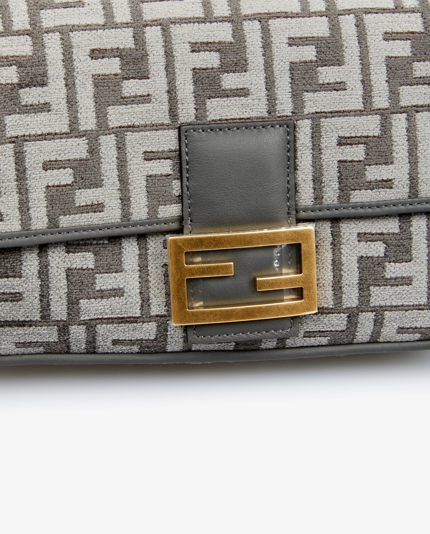 Le tissu Ciniglia présente un monogramme FF en relief, au rendu légèrement satiné, qui capte la lumière avec subtilité. Les bords et le rabat sont encadrés de cuir gris foncé, créant un contraste élégant. La boucle métallique FF dorée, encore protégée par son plastique d’origine, vient fermer le rabat frontal. La bandoulière en cuir, fixée par des anneaux en métal doré, permet un porté épaule ajusté. L’ensemble reste compact et structuré, fidèle à l’esprit du design initial.