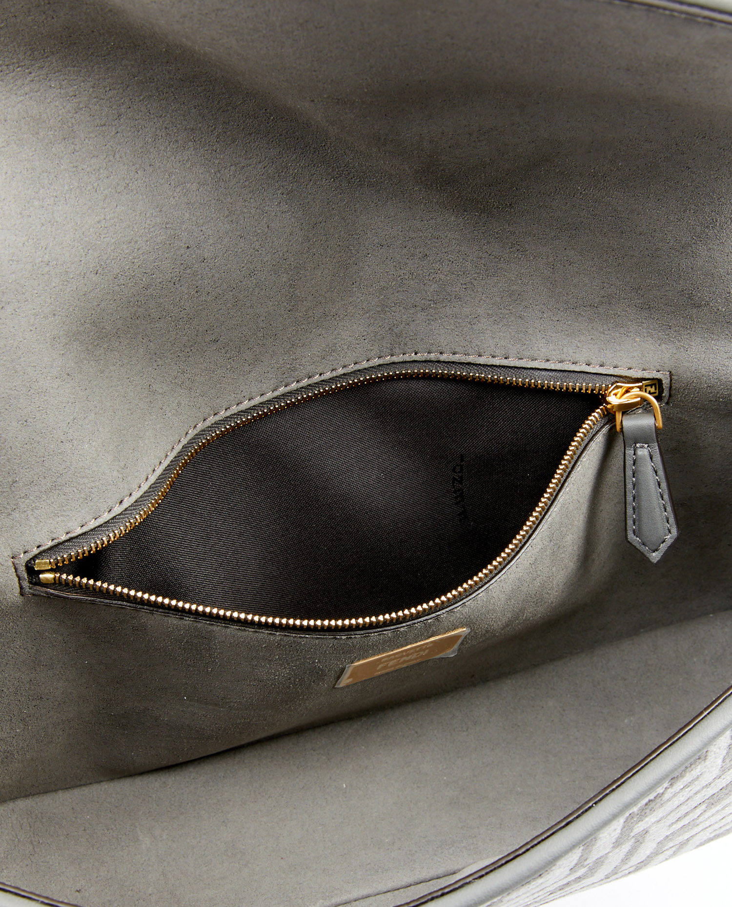L’intérieur du sac est doublé d’un suède gris doux, avec une poche zippée plaquée sur la face arrière. Une plaque en métal doré gravée “Fendi Baguette – Made in Italy” est apposée sous la fermeture, assurant l’authenticité de la pièce. L’ouverture large permet un accès aisé au contenu malgré la taille relativement compacte du sac.