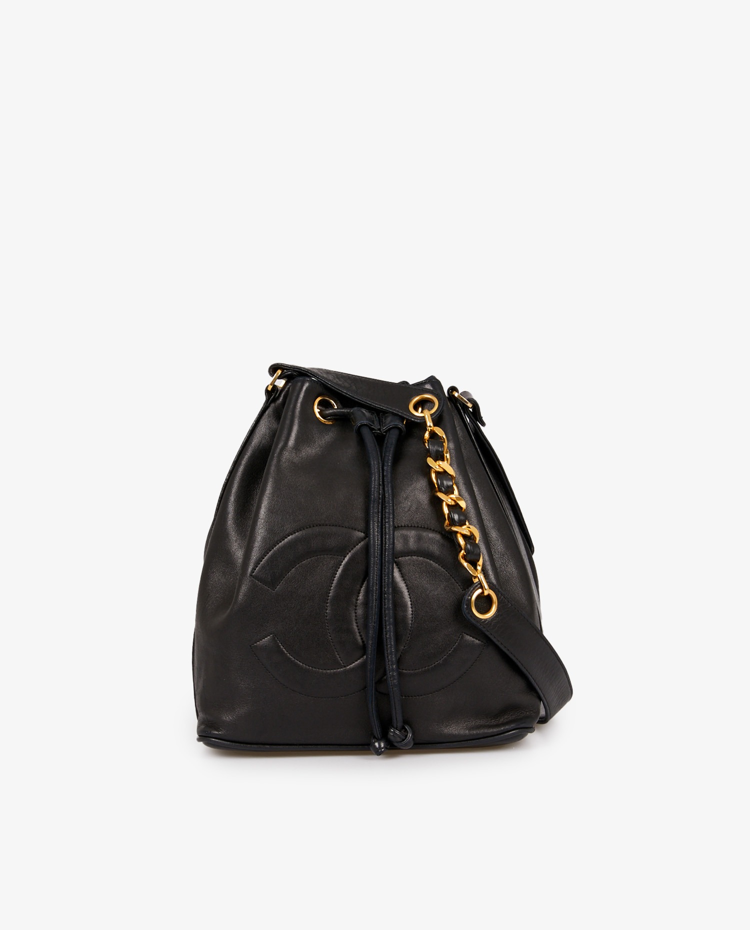 Sac Bourse Chanel vintage en cuir d’agneau noir. Porté épaule ou en bandoulière (101cm). En très bon état.