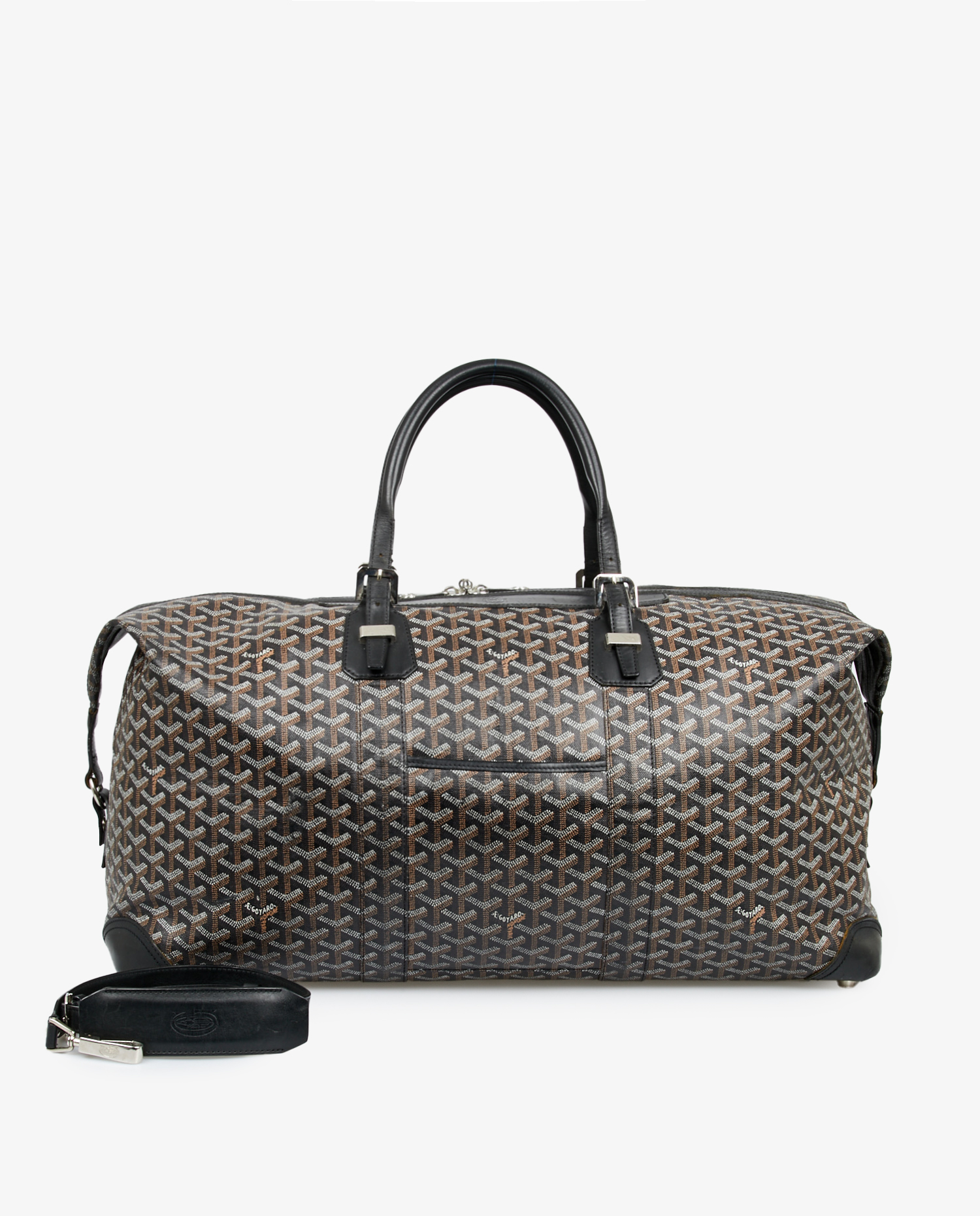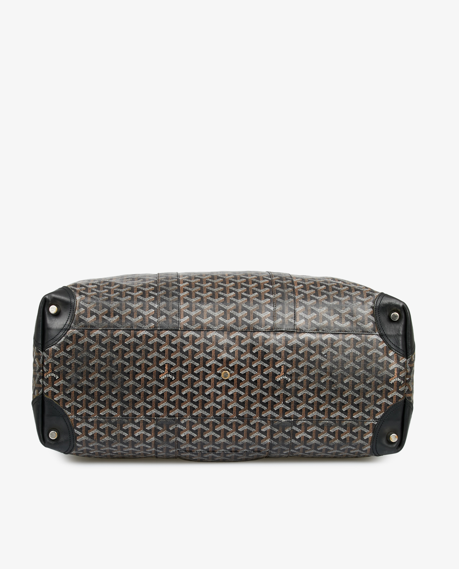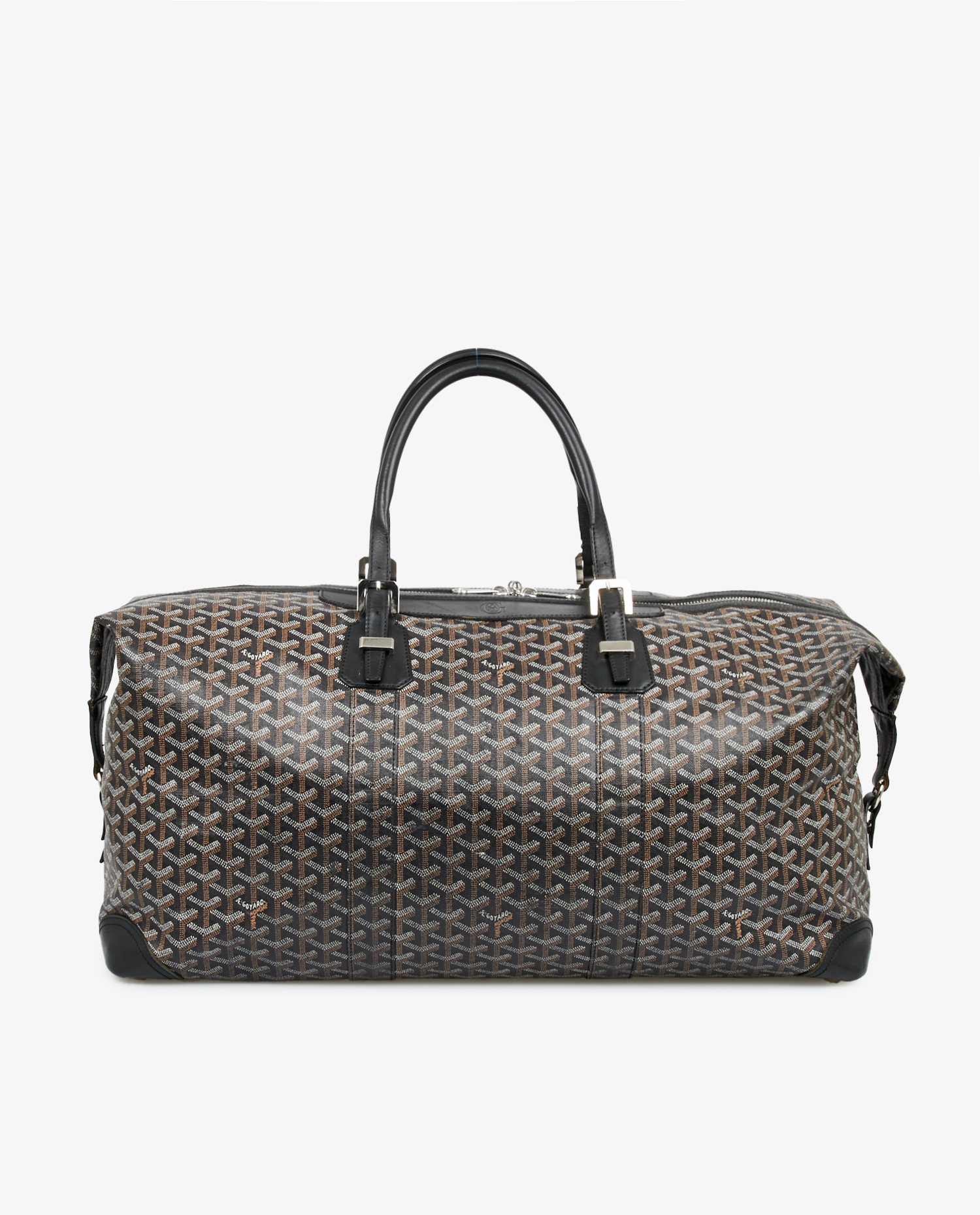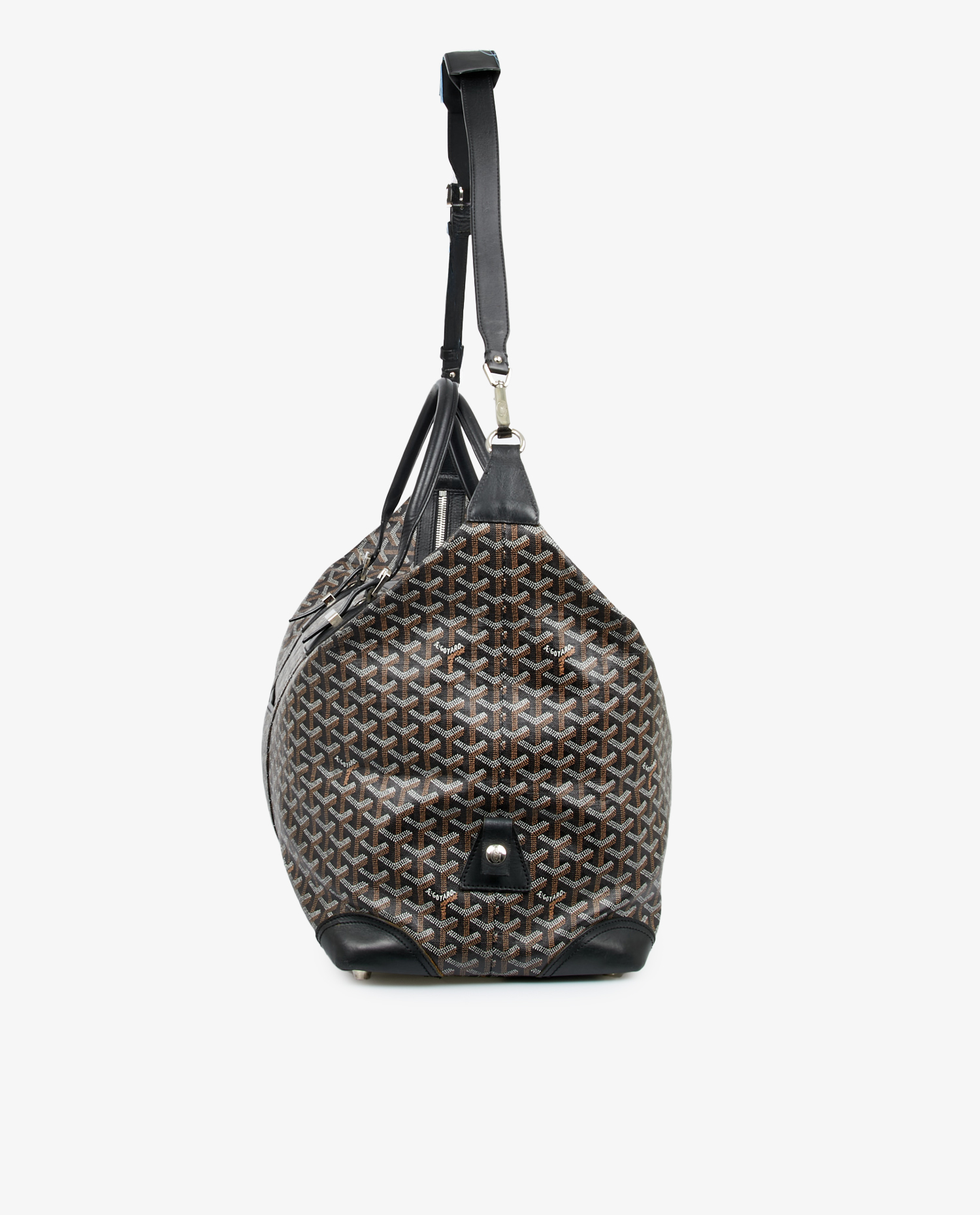 Sac Bowling Goyard en toile monogramme et finitions en cuir noir. Porté à la main à l’aide deux poignées et à l’épaule ou en crossbody. L’intérieur est en tissu jaune emblématique de la marque. Fermeture zippée. En très bon état. Prix public 4295 euros.