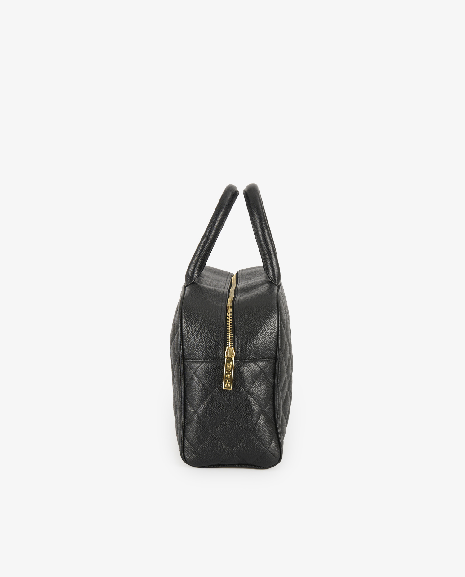 Le sac bowling Chanel, apparu dans les années 2000, s’inscrit dans la volonté de la maison de proposer des modèles à la fois élégants et pratiques, adaptés aux besoins d’une clientèle moderne. Le cuir caviar, introduit dès les années 90, devient rapidement un matériau emblématique pour sa résistance et sa texture grainée. Ce modèle revisite les lignes sport-chic des sacs de voyage dans une version plus compacte, reprenant les codes classiques de Chanel — matelassage, logo oversize et finitions métalliques dorées — tout en offrant une nouvelle silhouette.