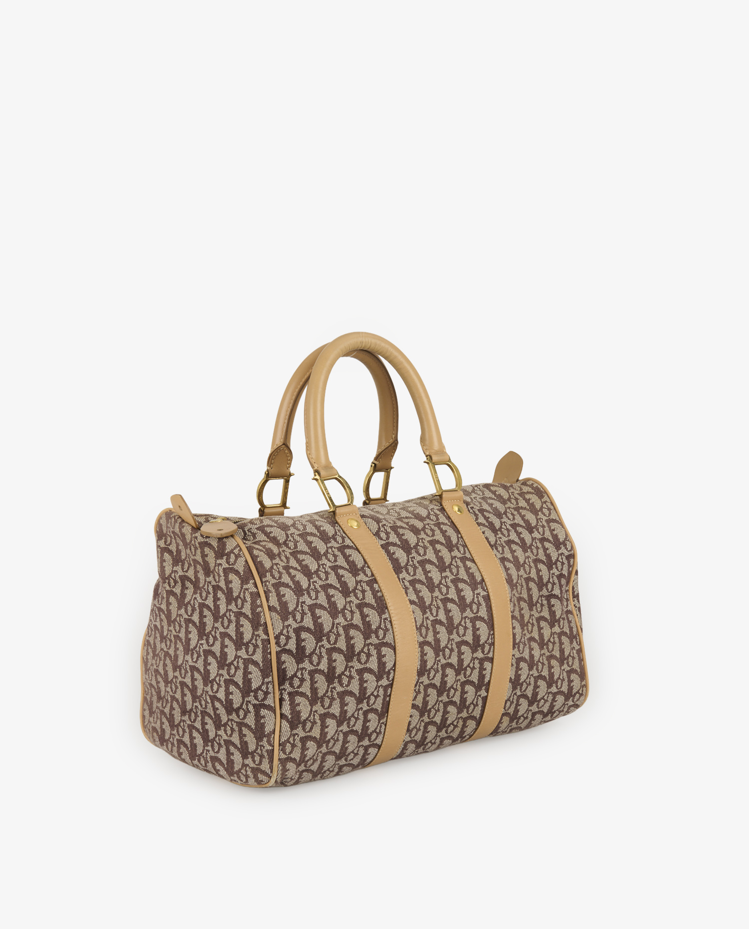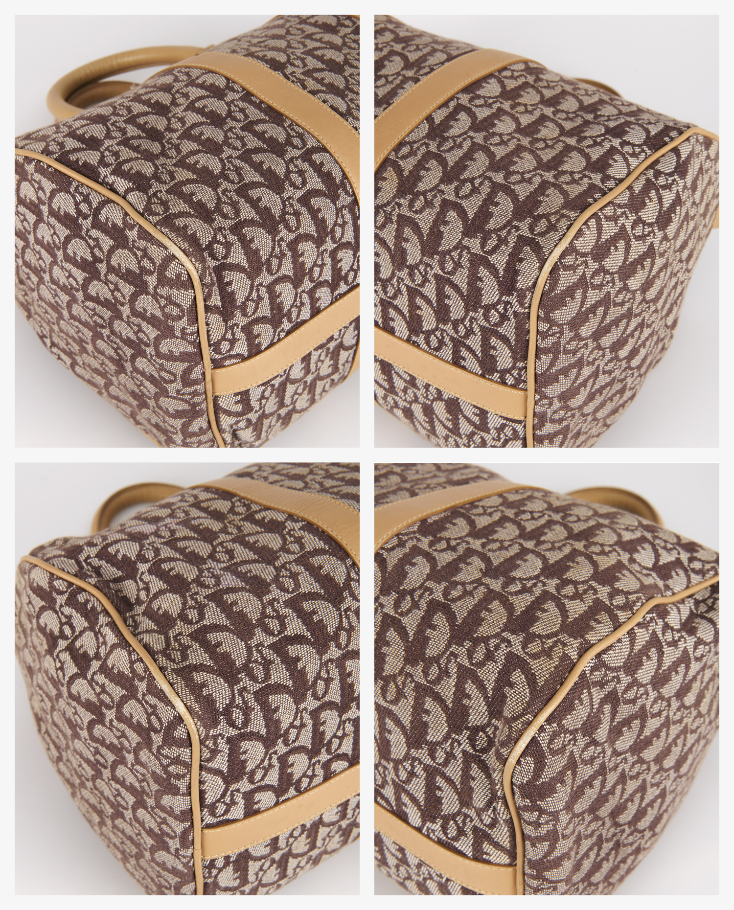 Le sac présente une structure rectangulaire arrondie sur les côtés, avec une base rigide renforcée. La toile jacquard arbore le motif Dior Oblique dans des tons marron et beige. Deux larges bandes de cuir camel parcourent le sac verticalement sur les faces avant et arrière, apportant du contraste et de la stabilité. Les poignées en cuir gainé, attachées par des anneaux en laiton doré, permettent un porté main confortable. Les coutures sont nettes, et le cuir conserve sa souplesse malgré quelques légères marques d’usage visibles à la base.