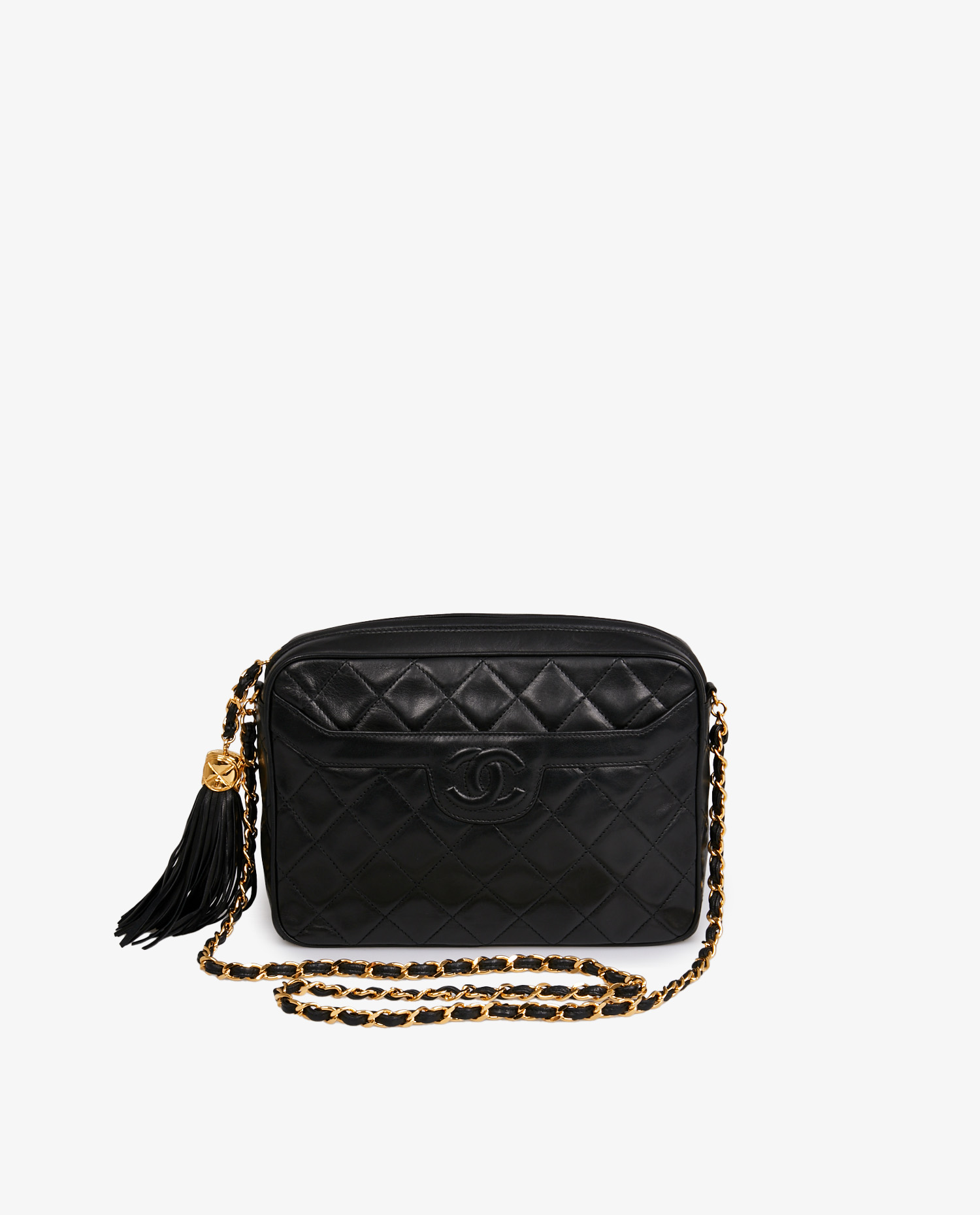 Sac Caméra Chanel vintage en cuir d’agneau matelassé noir. Fermeture zippée. Porté épaule ou en crossbody. L’intérieur est en cuir noir avec une poche zippée. Idéal pour tous les jours. En très bon état. Livré avec sa carte d’authenticité et son dustbag Old Fashioned Club.