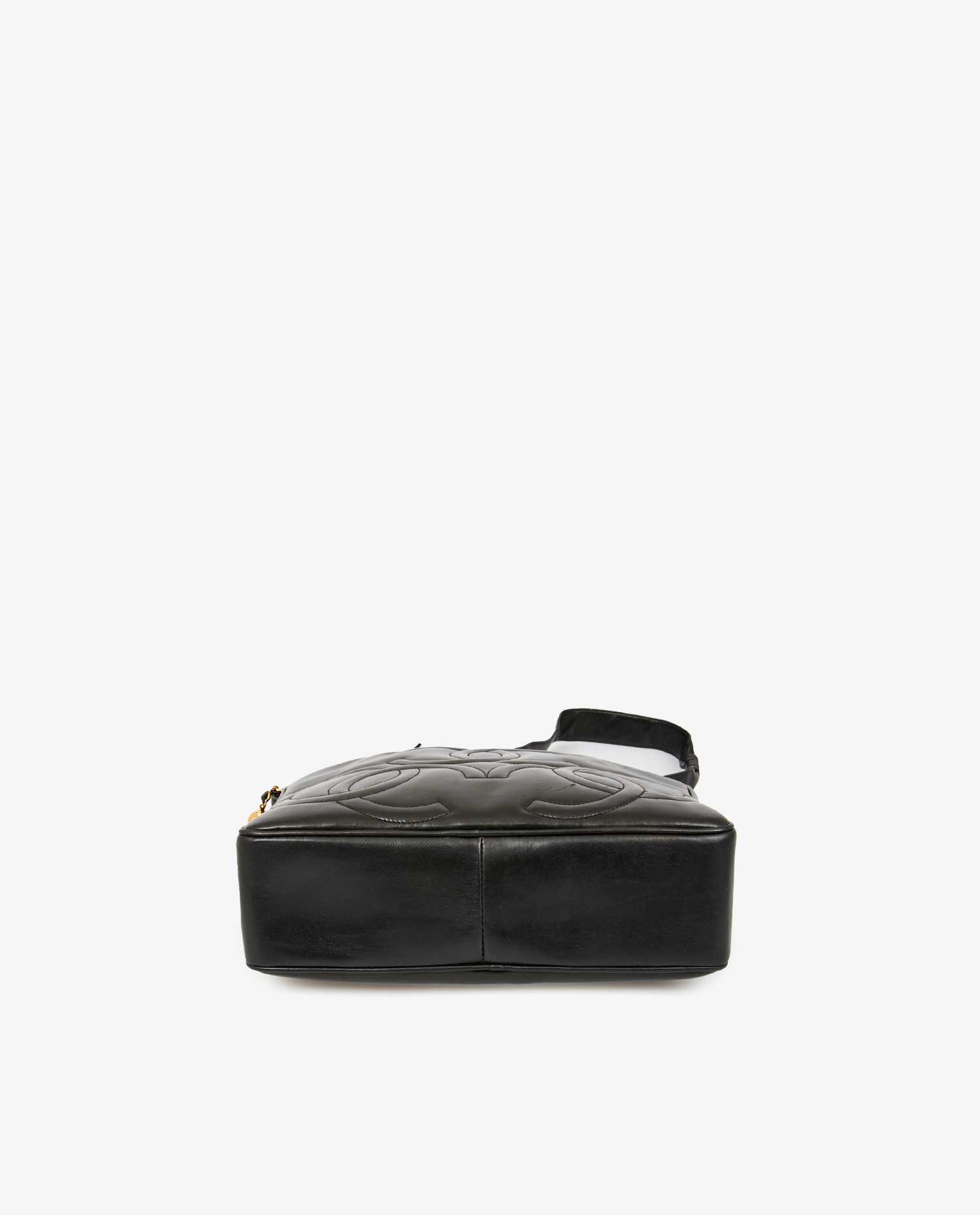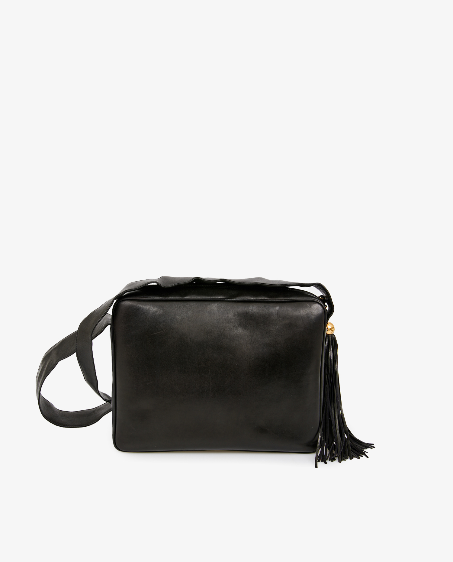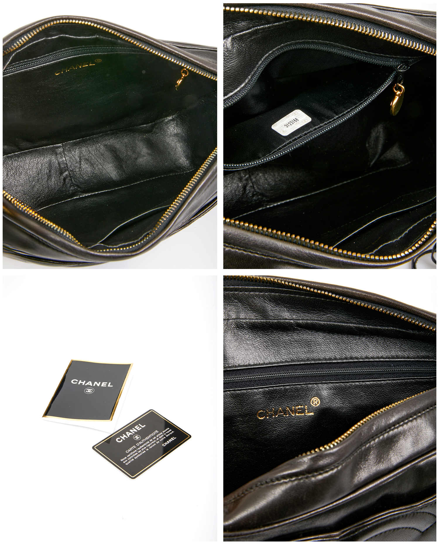 Grand sac Camera Chanel en cuir d’agneau noir vintage. Fermeture zippée avec un fermoir à franges en cuir. Une grande poche plaquée à l’avant. Porté à l’épaule ou en bandoulière (112cm). Collection 1994/96. En très bon état.