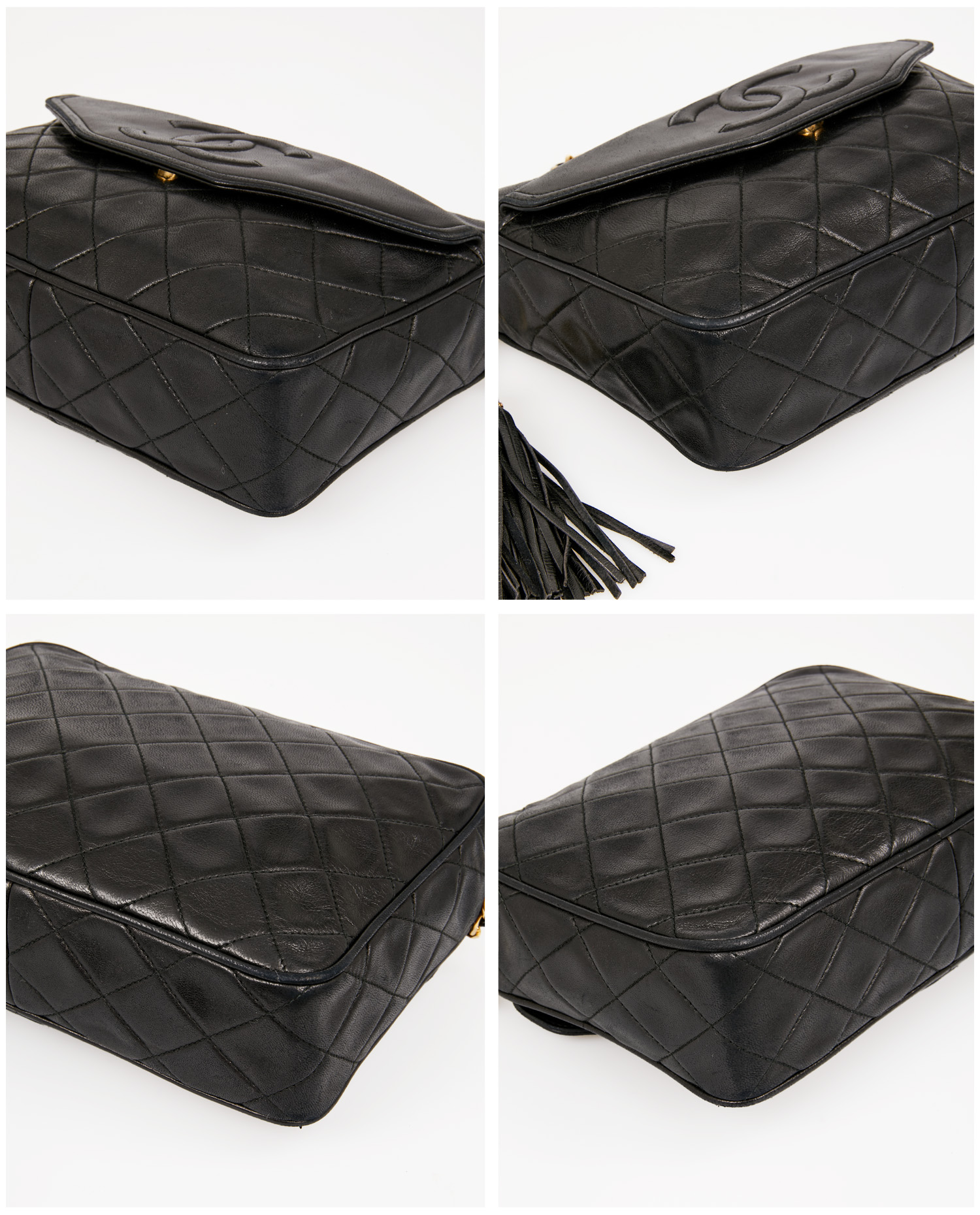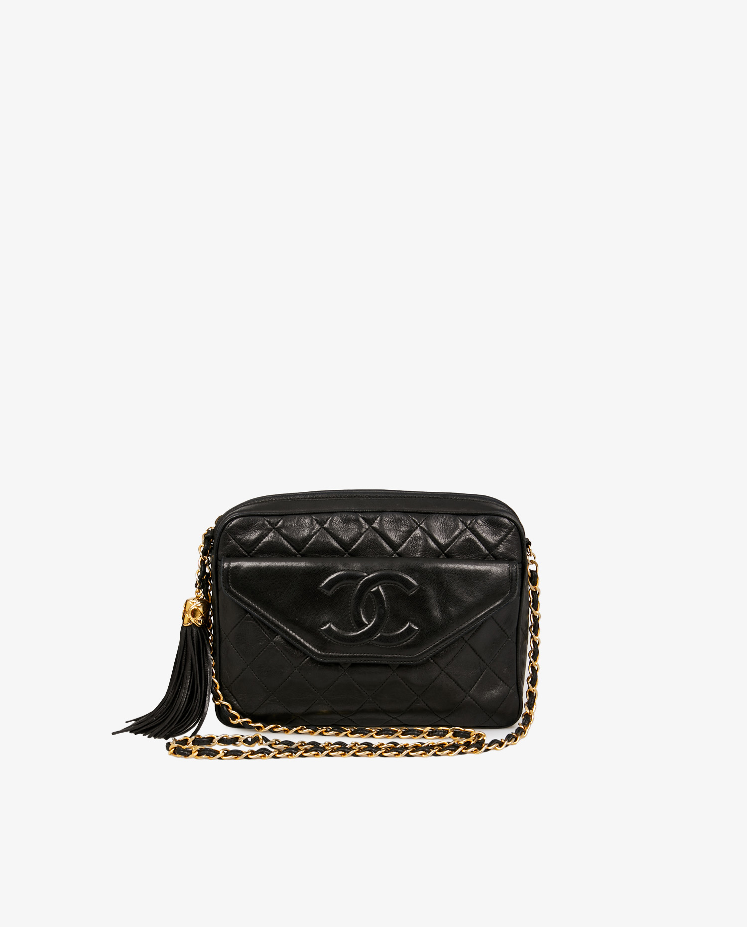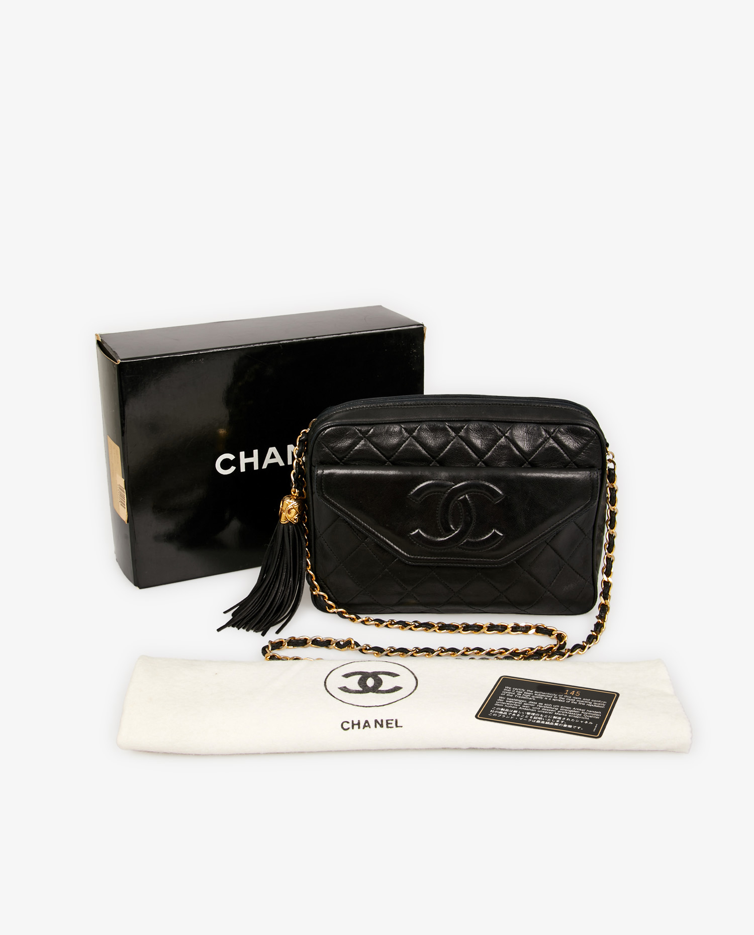 Sac vintage Chanel Camera en cuir d’agneau matelassé noir. Porté épaule ou en crossbody. La bijouterie est en plaqué or 24K. L’intérieur est en cuir lisse noir avec une poche plaquée et zippée. En très bon état. Il sera livré dans sa boite avec sa carte d’authenticité et son pochon d’origine.