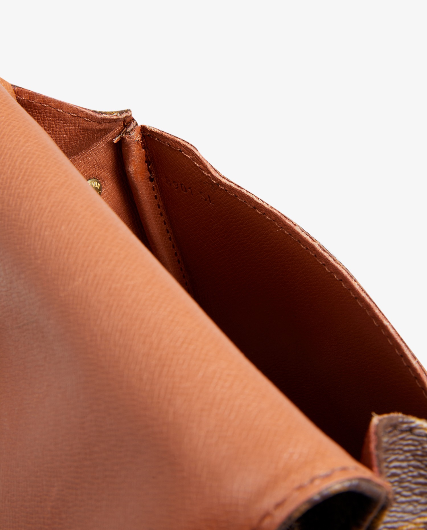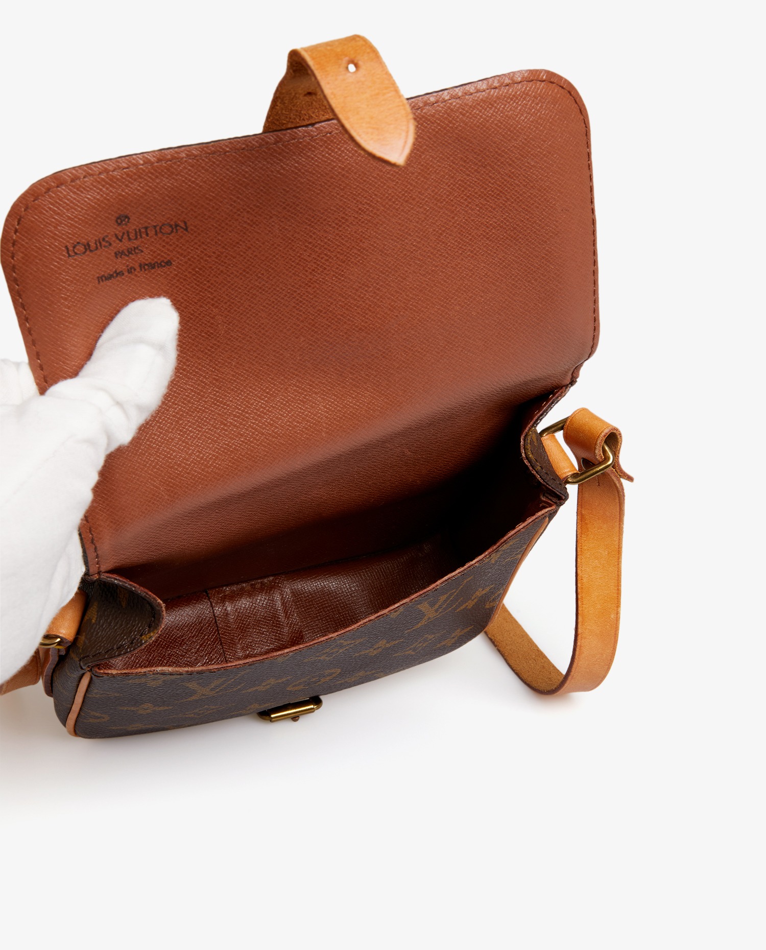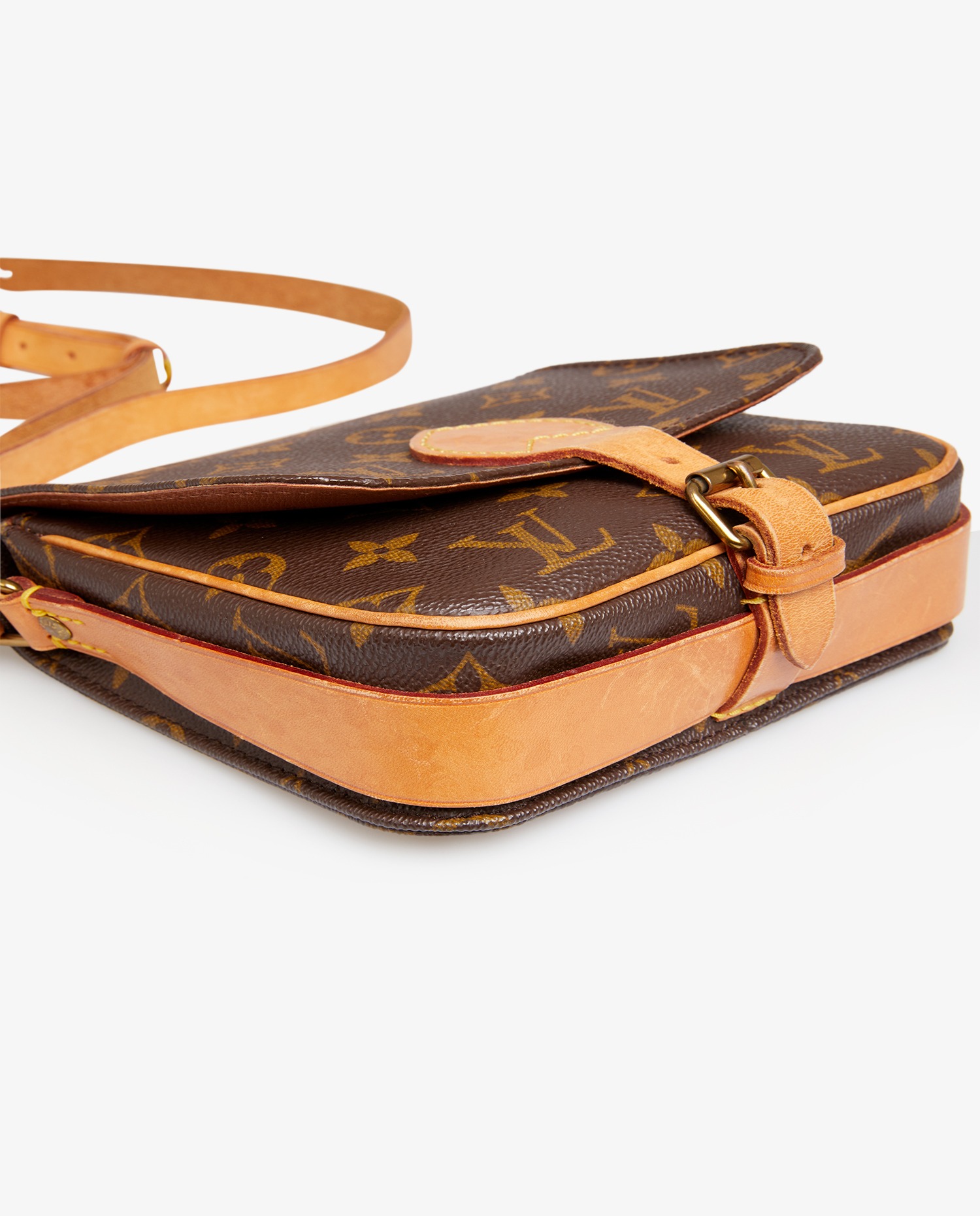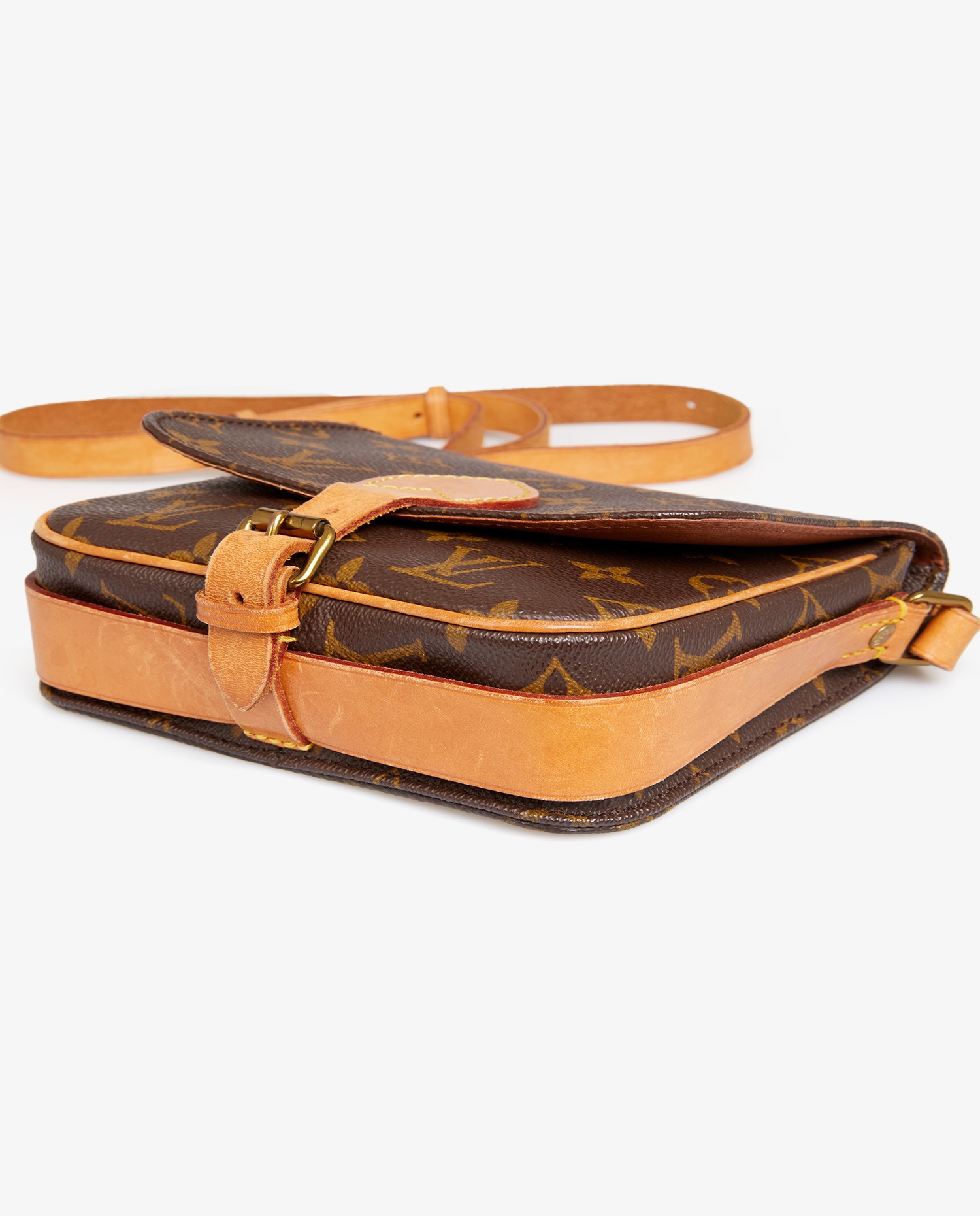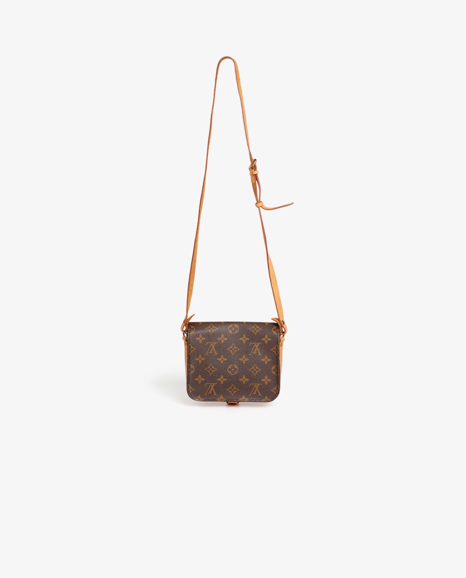Sac cartouchière Louis Vuitton en toile enduite monogram finitions en cuir de vachette naturel. Il se porte en crossbody avec une bandoulière réglable, qui mesure au plus court 112cm et au plus long 122cm. En très bon état. Le cuir est patiné, usure naturelle.
