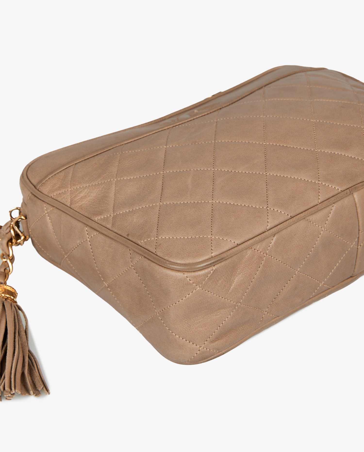 Sac Caméra Chanel vintage en cuir d’agneau matelassé beige. Fermeture zippée. Porté épaule ou en bandoulière (100cm). En bon état. Quelques traces d’usure naturelle. Voir photos.