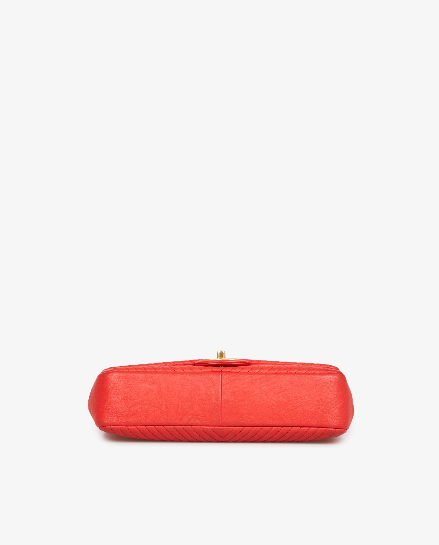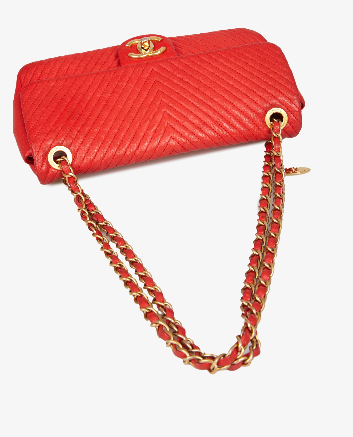Sac Chanel chevrons rouge. Fermoir CC doré. Porté épaule ou en bandoulière (107cm). L’intérieur est en tissu noir avec 1 poche zippée. En très bon état. Légère décoloration du doré du fermoir.