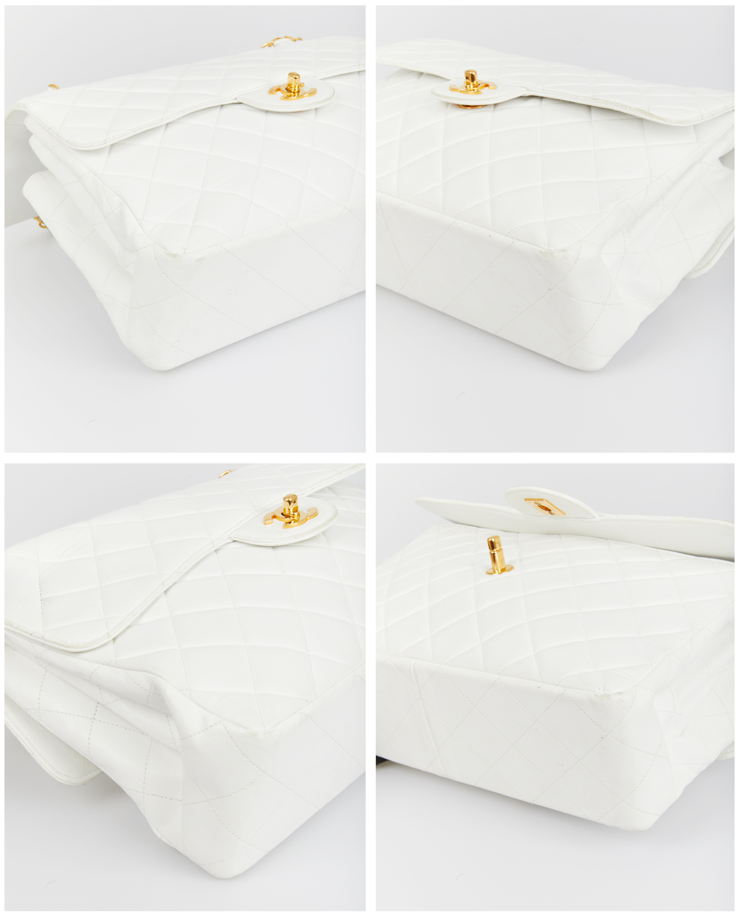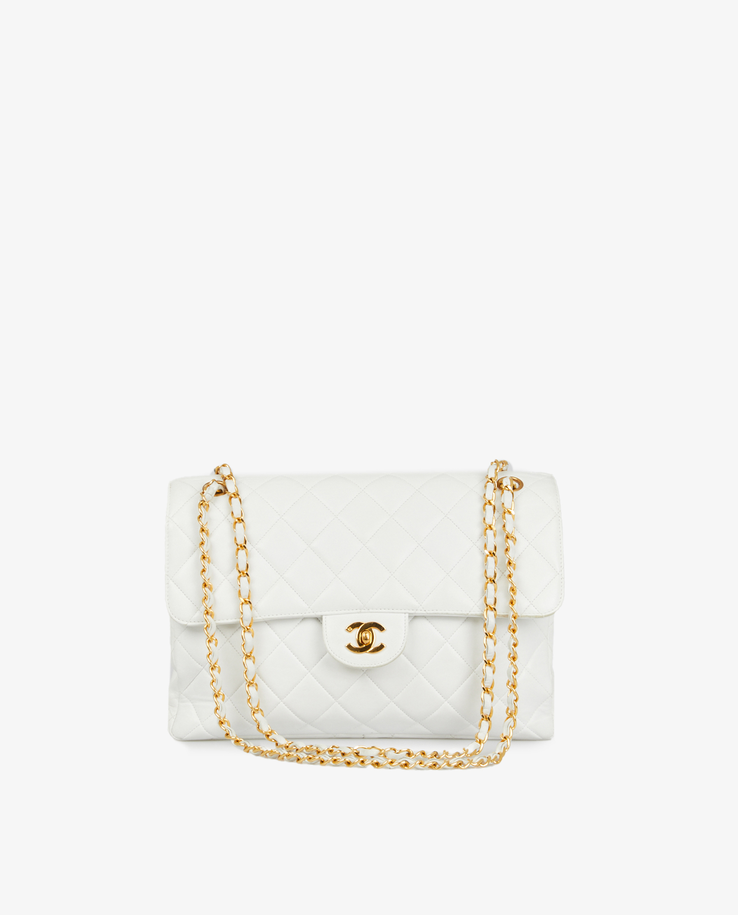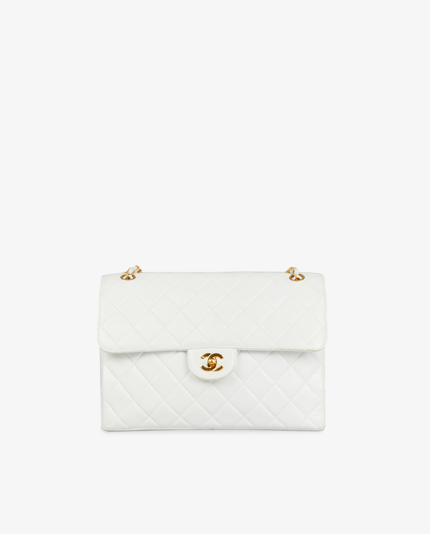 Sac Chanel Timeless à rabat en cuir d’agneau blanc. Double face. Les mêmes rangements de chaque côté du sac. Porté épaule. Bijouterie dorée. En très bon état. Légère usure des coins.