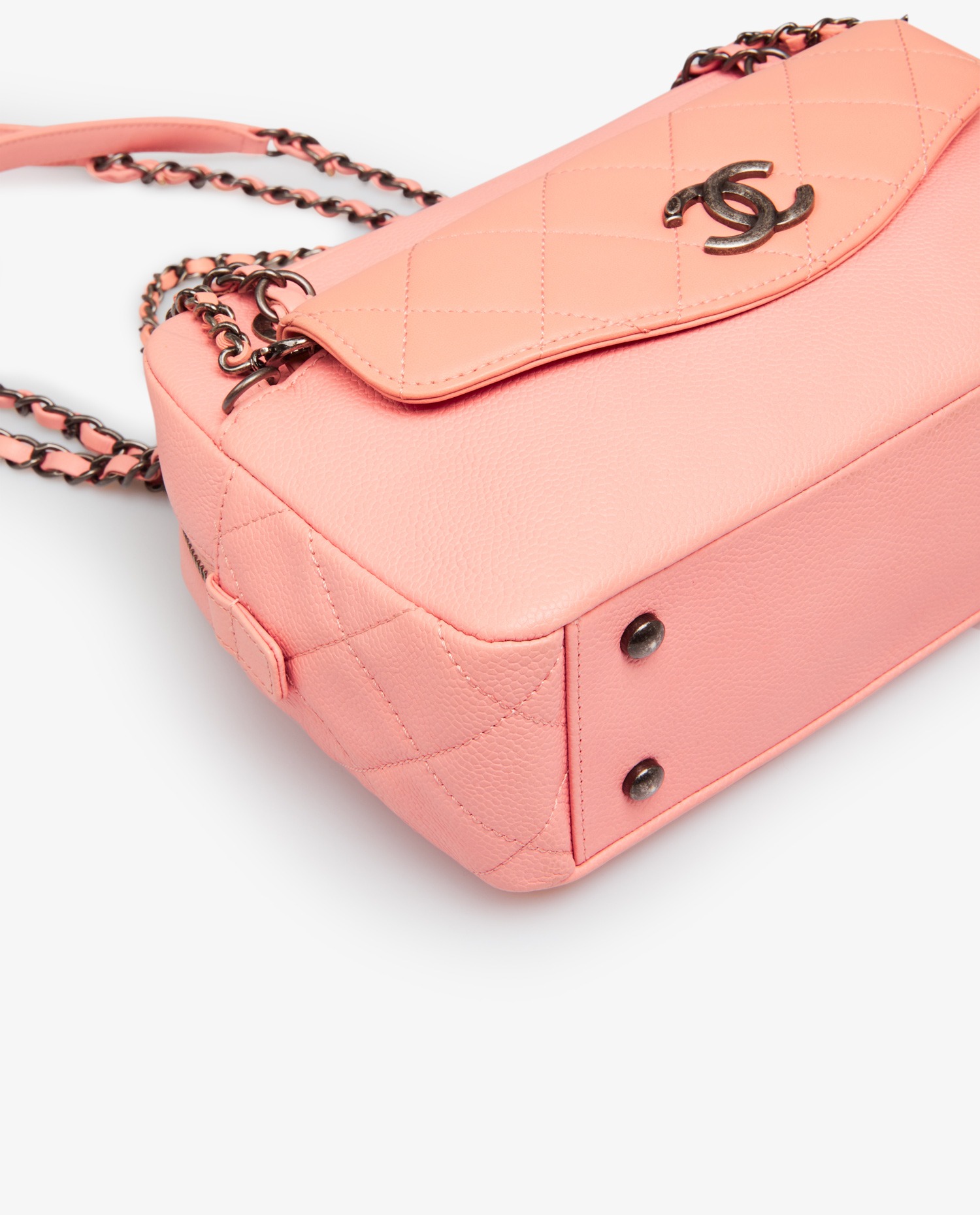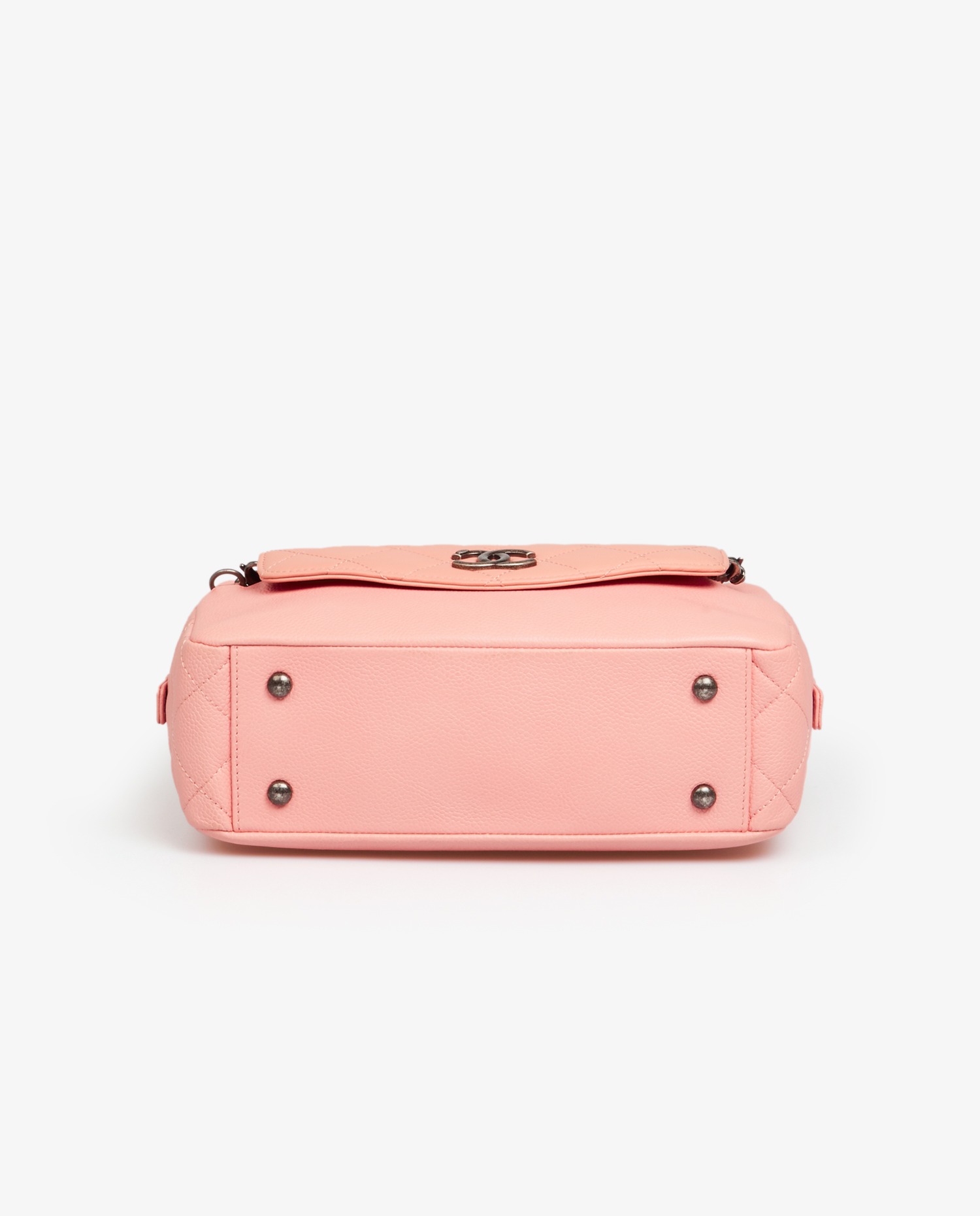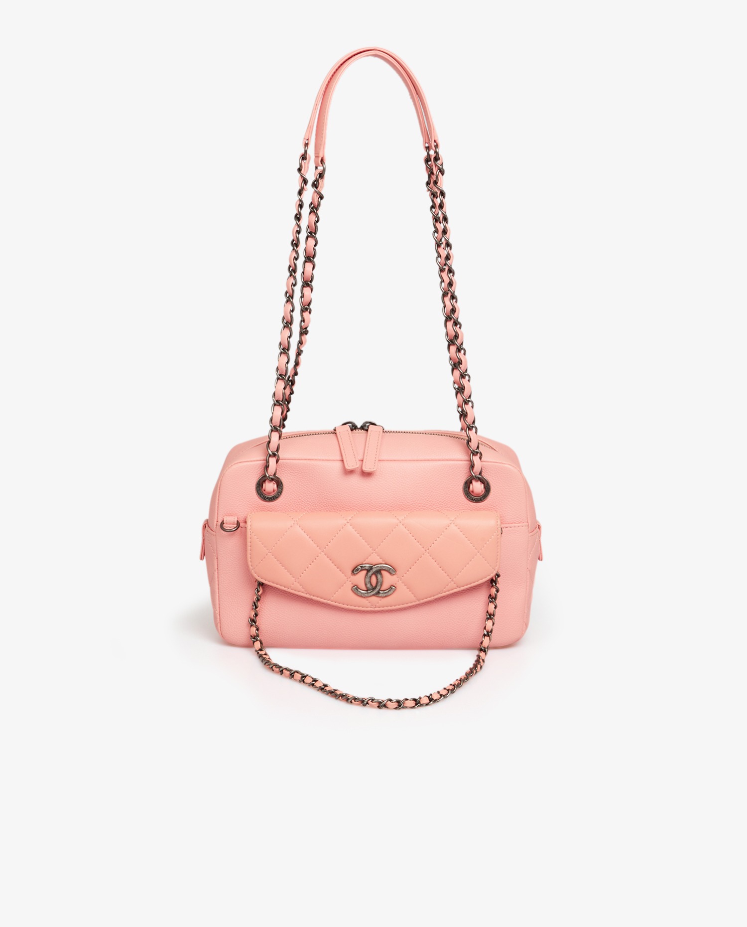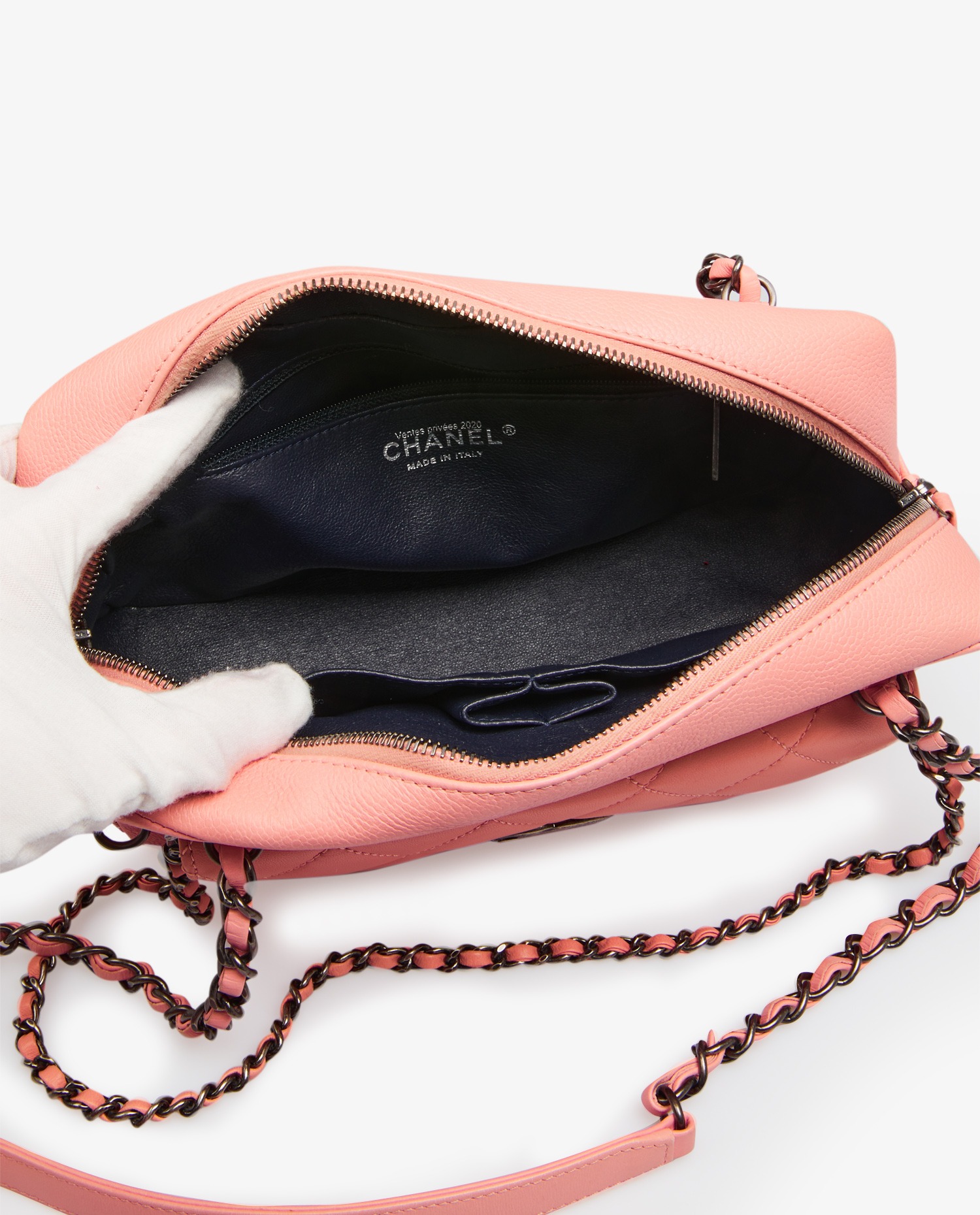 Sac Chanel en cuir grainé rose; Bijouterie en cuir argent vieilli. Fermeture zippée. Petite poche à l’avant. Porté épaule. L’intérieur est en cuir noir. Provient des ventes privées 2020. En très bon état.
