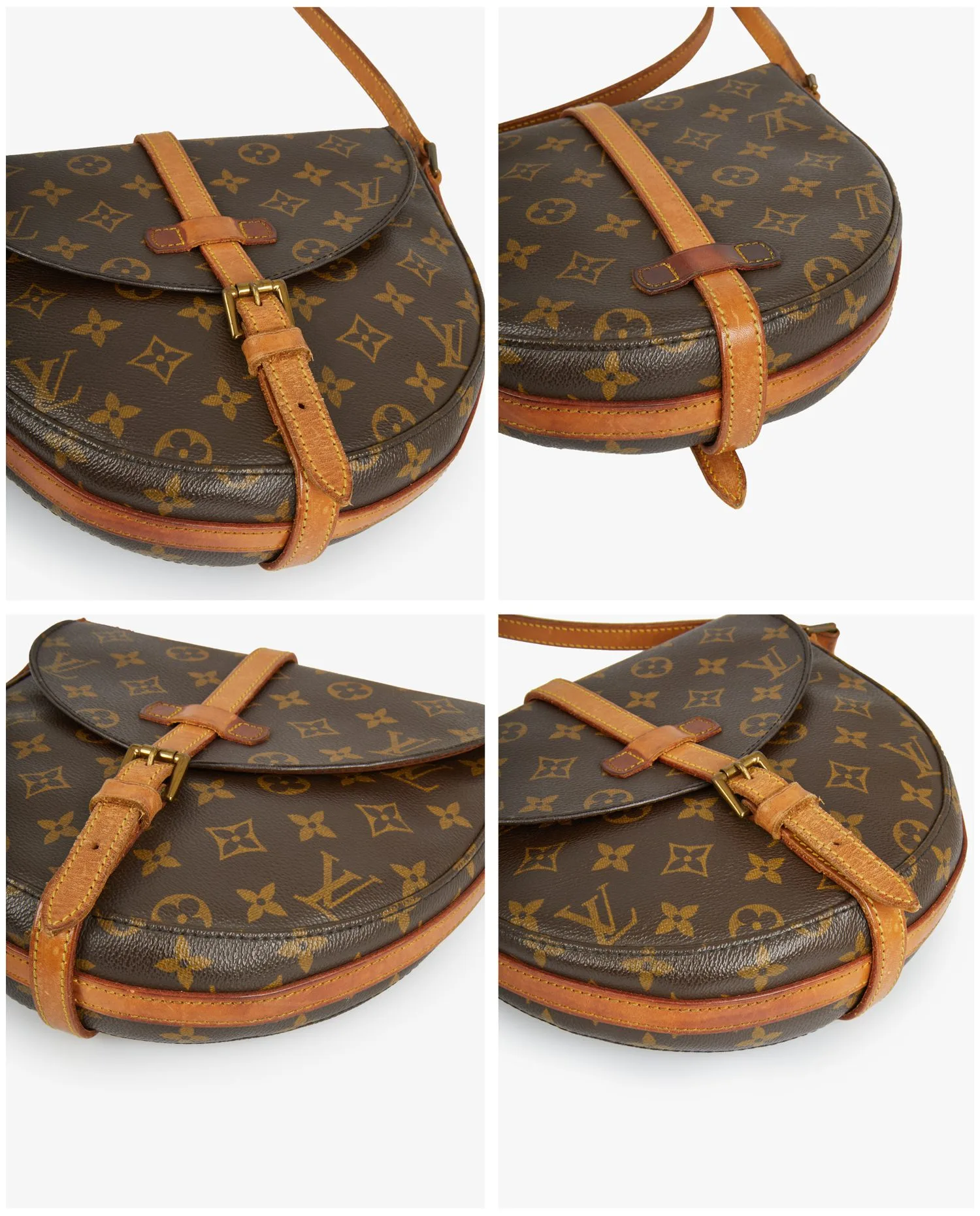 Sac Chantilly Louis Vuitton en toile monogramme et cuir de vache. Porté en bandoulière. En bon état d’usage. Quelques marques d’usure d’usage. Le cuir est patiné. Voir photos.