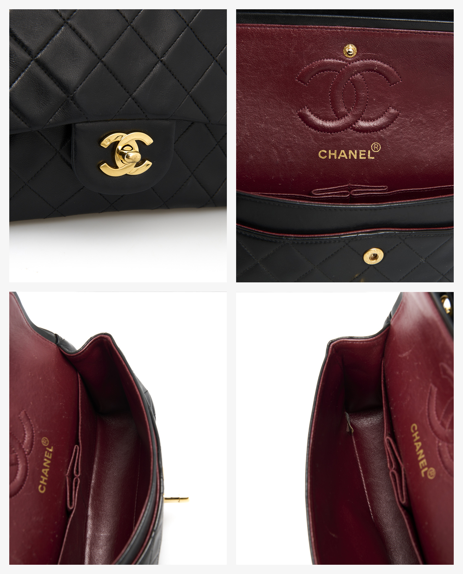 L’intérieur est doublé de cuir bordeaux, signature de la maison Chanel. On y trouve une poche à fermeture par bouton pression sous le rabat, ainsi qu’une poche plaquée au dos et deux petits compartiments intérieurs. Le logo Chanel est estampillé en doré à l’intérieur, avec le marquage “CHANEL®” et le double C embossé sur le rabat, caractéristiques de la période de production de la fin des années 90.