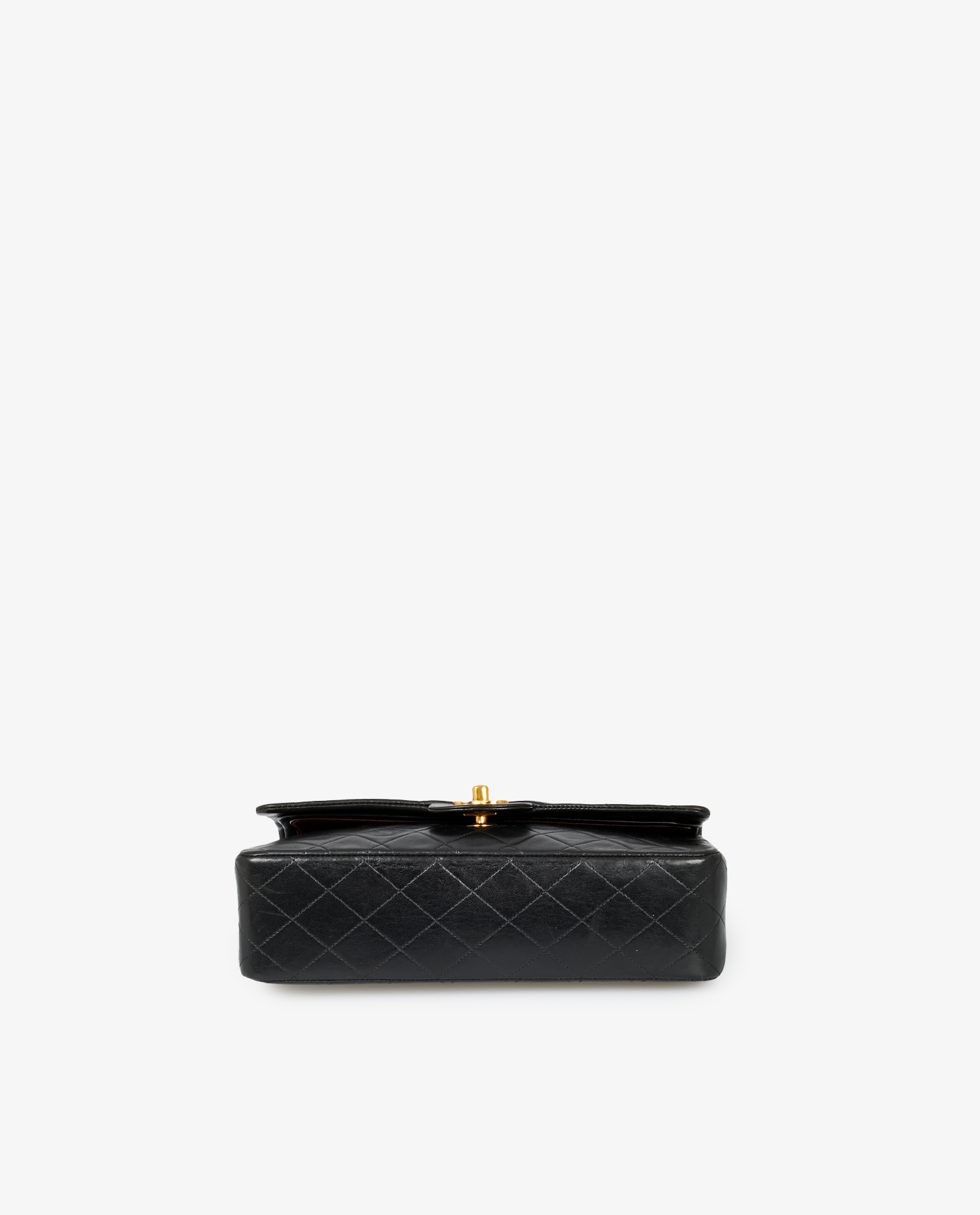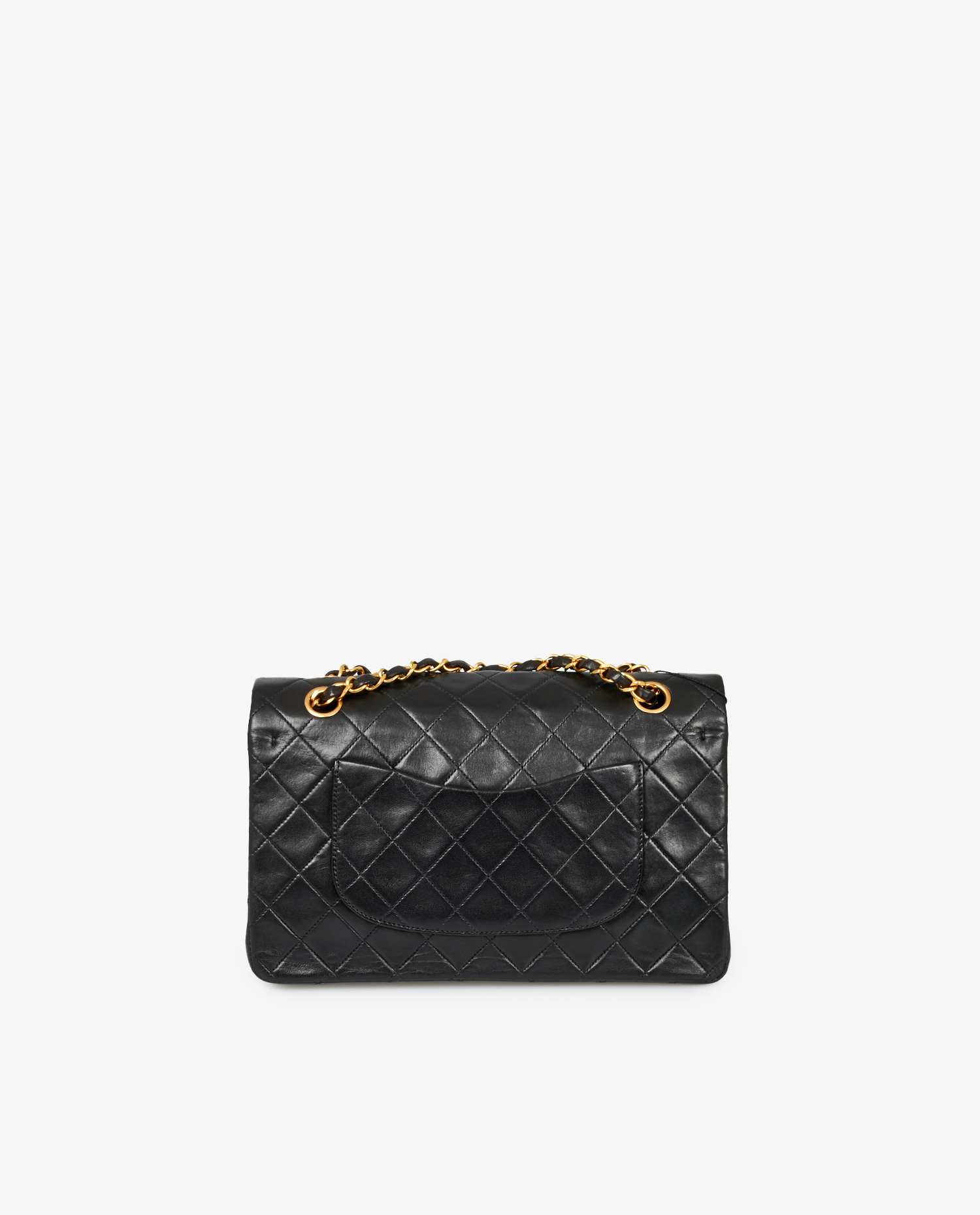 Sac Classique Chanel 25cm en cuir d’agneau noir vintage. Porté épaule, 90cm. En très bon état.
