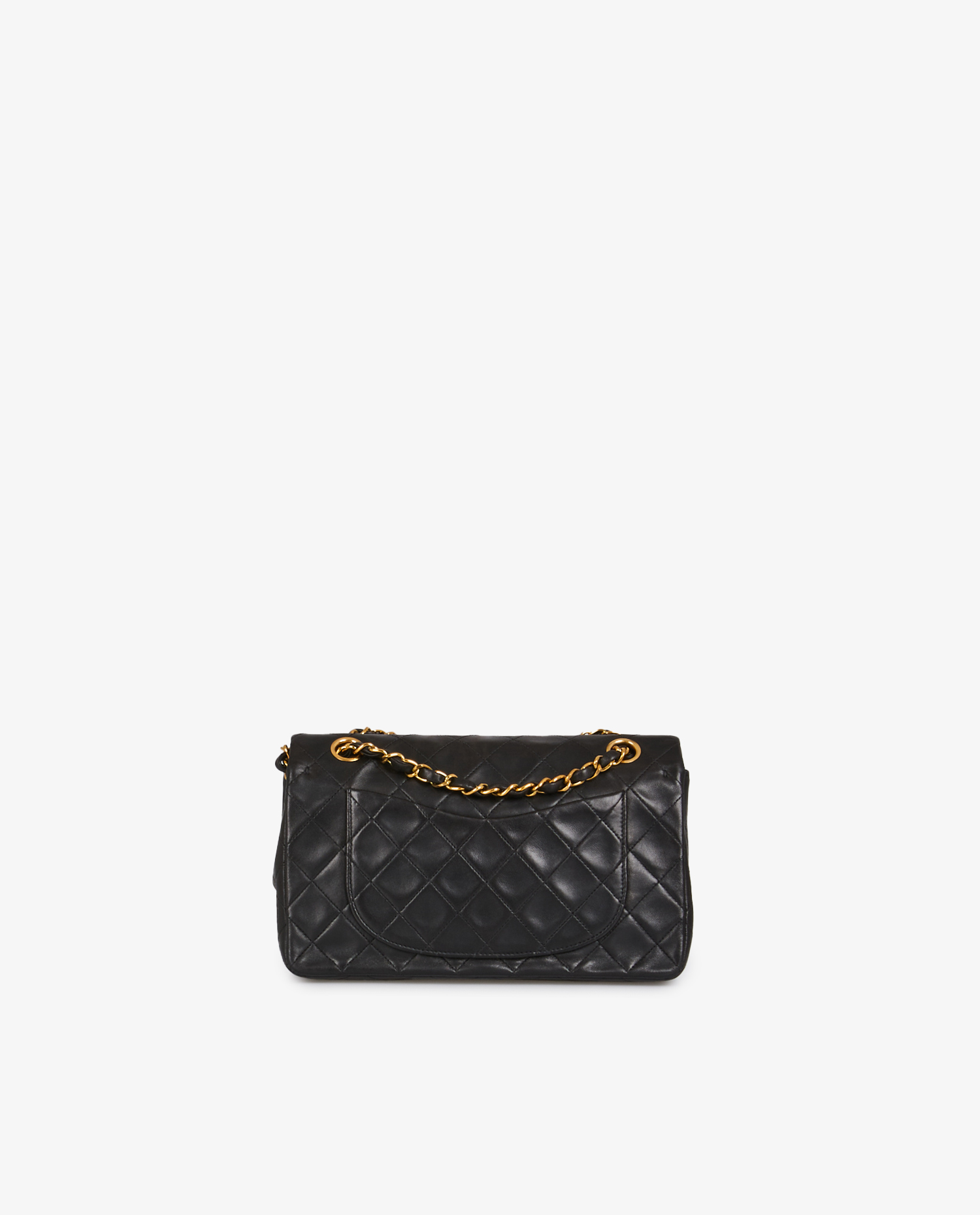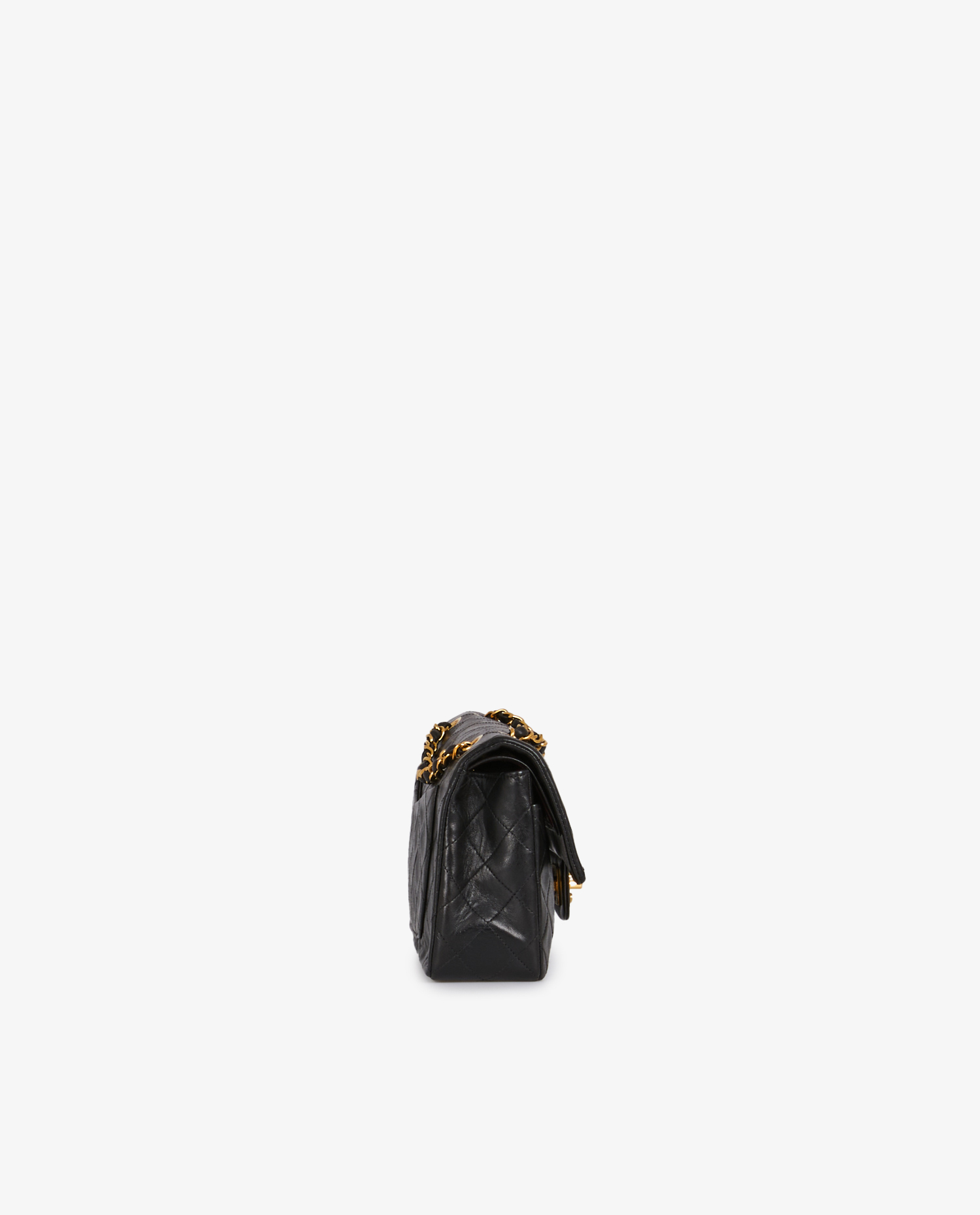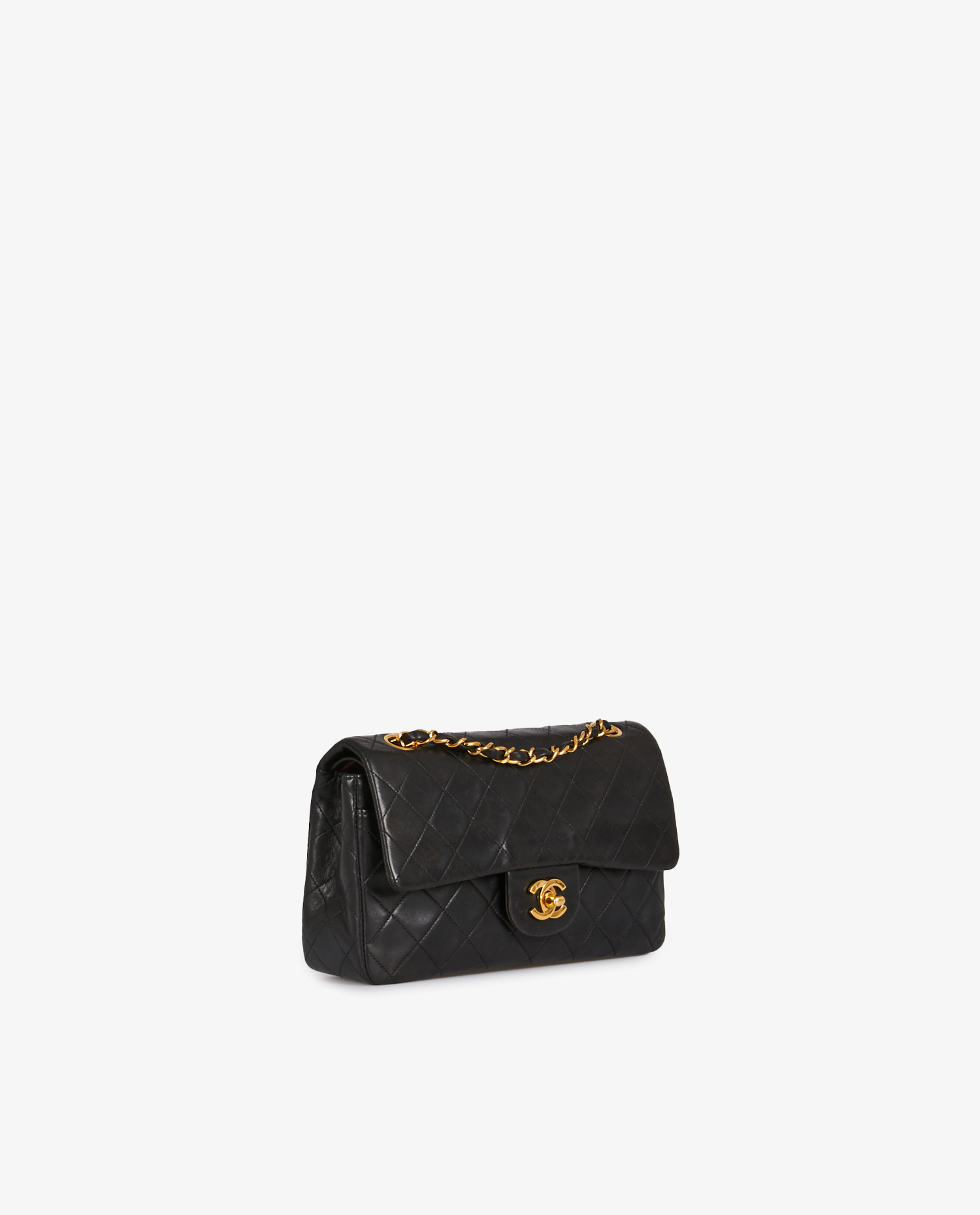 Sac Classique Chanel 23cm vintage en cuir d’agneau matelassé noir. Porté épaule (91cm). Double flap. En très bon état.