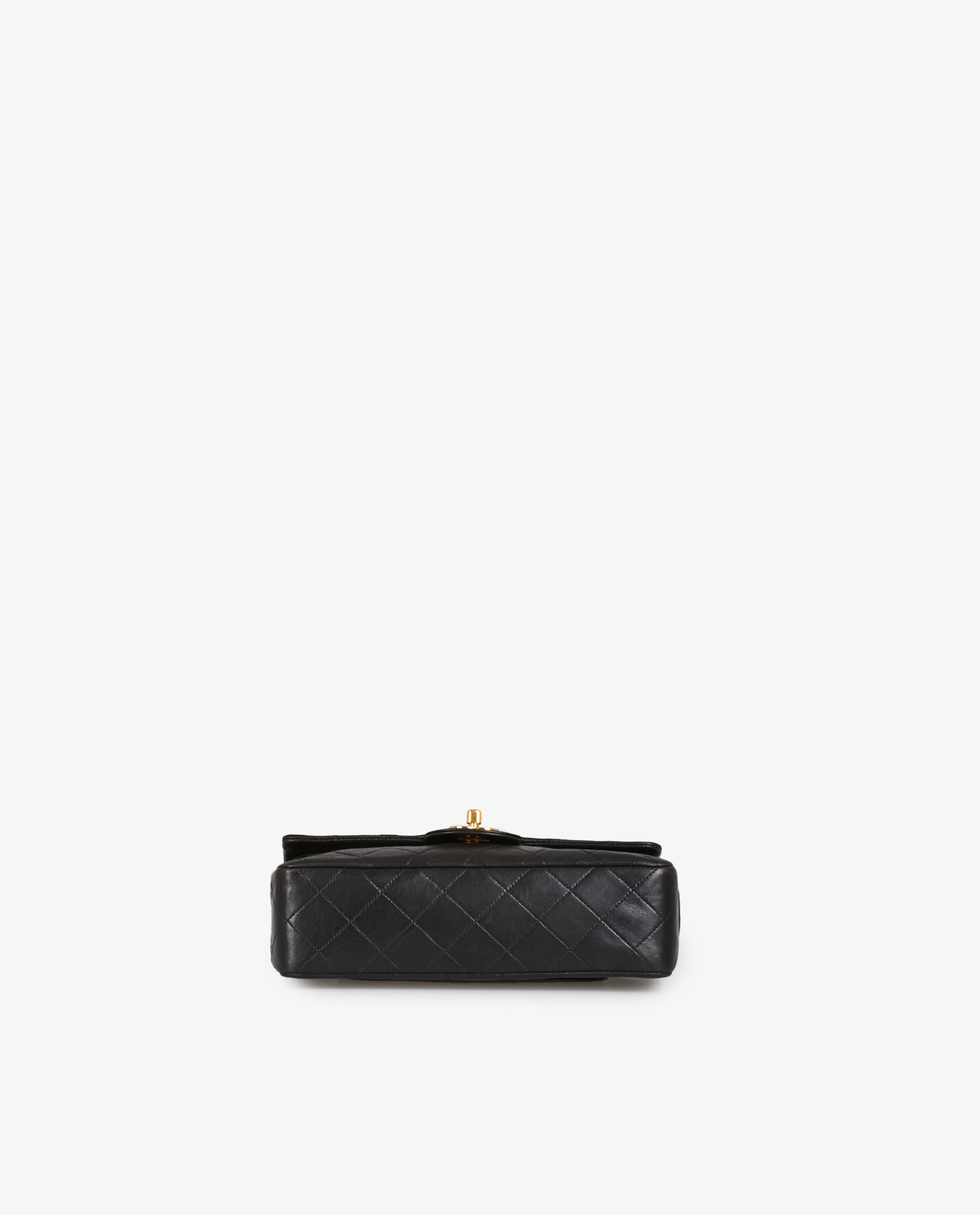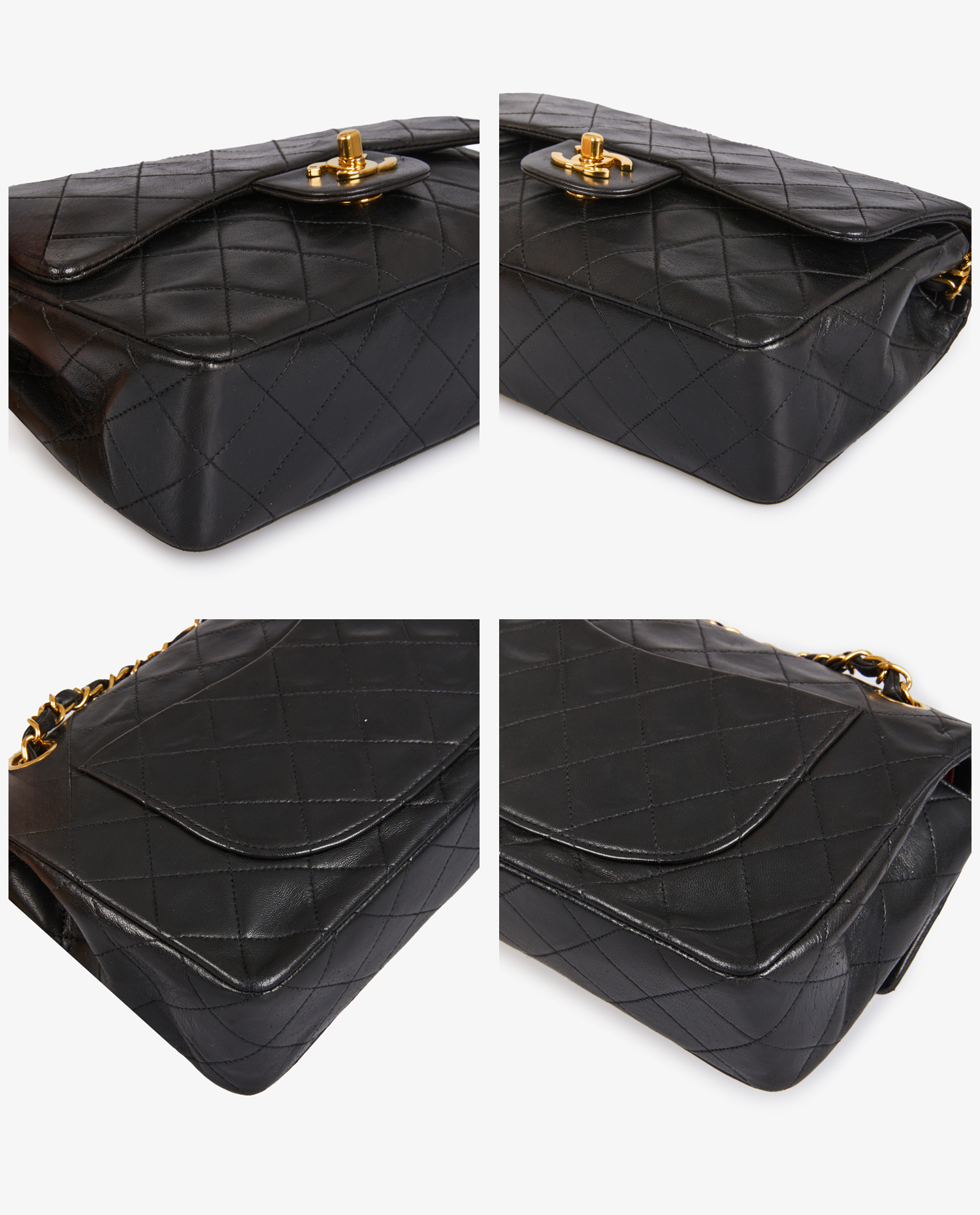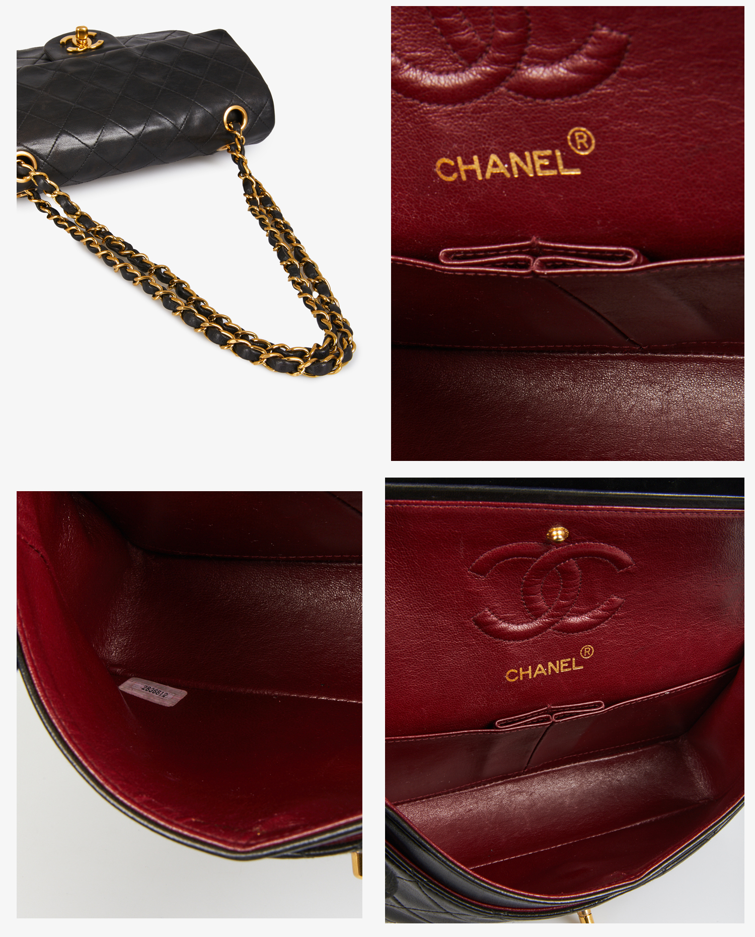 Sac Classique Chanel 23cm vintage en cuir d’agneau matelassé noir. Porté épaule (91cm). Double flap. En très bon état.