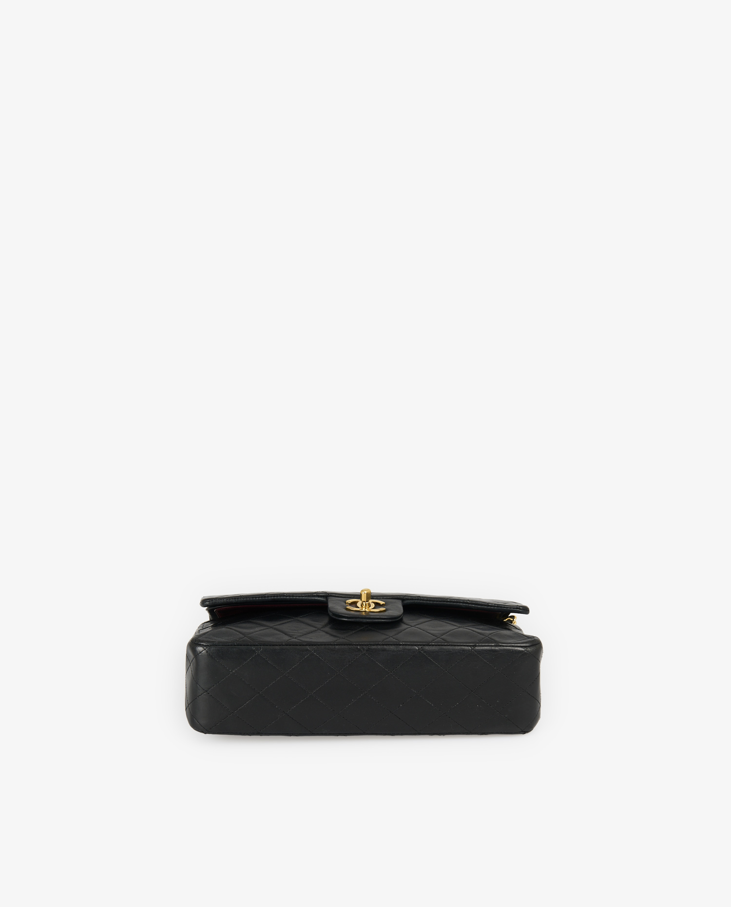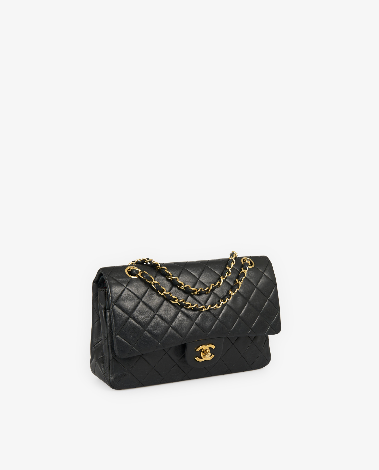 Le cuir d’agneau noir présente un matelassage en losange régulier, caractéristique du style Chanel. Le fermoir CC doré pivotant à l’avant est à la fois décoratif et fonctionnel. La chaîne en métal doré entrelacée de cuir permet un porté épaule élégant. Le sac comprend une poche plaquée au dos, pensée pour un accès rapide. Ses proportions classiques et équilibrées font de lui un format polyvalent, adapté au quotidien comme aux occasions plus habillées.