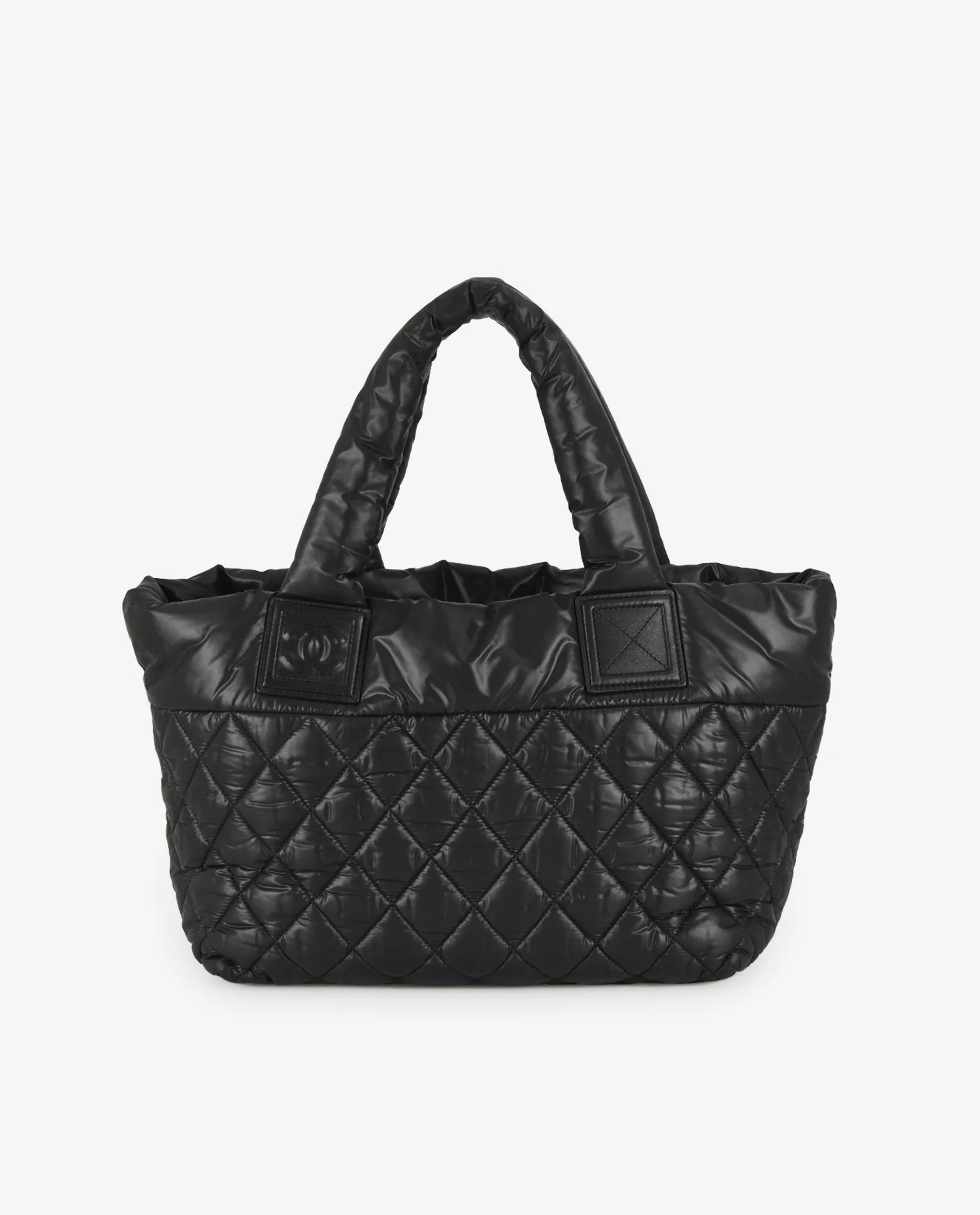 Le sac présente une texture matelassée brillante en nylon noir, avec un piquage en losange régulier. Les anses épaisses rembourrées assurent un porté main confortable. Sur la face avant, une poche zippée est rehaussée d’un empiècement en cuir embossé du logo Chanel. Le fond plat du sac est également matelassé, permettant une bonne tenue verticale. Les coins présentent un léger assouplissement et des plis, typiques de ce type de matière souple après usage.