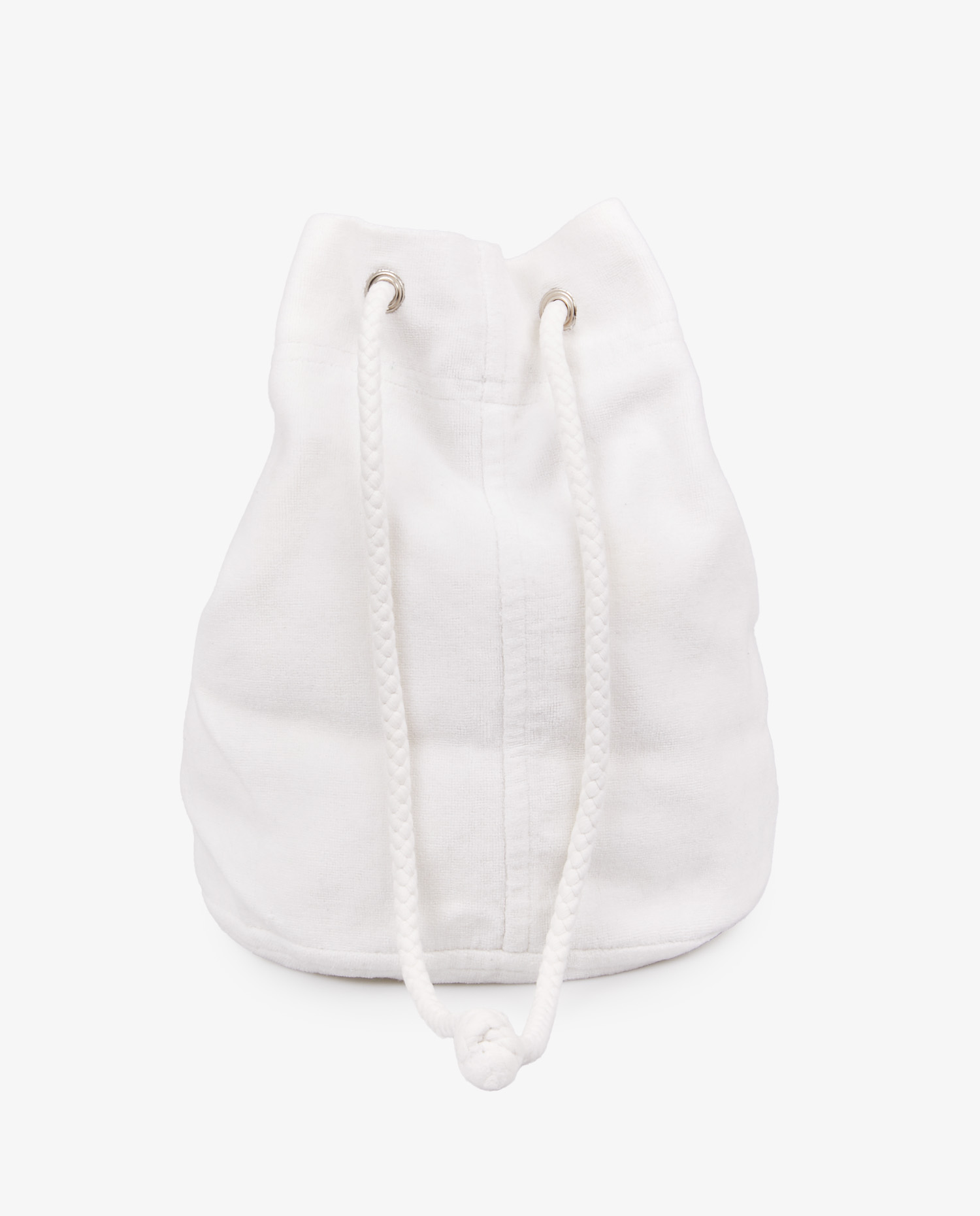L’intérieur du sac est laissé brut, dans le prolongement du tissu éponge extérieur, ce qui le rend particulièrement adapté aux objets humides ou sableux. L’absence de doublure permet un séchage rapide après utilisation. L’étiquette intérieure précise la provenance et la composition : « Hermès Paris – Made in France », 100 % coton.