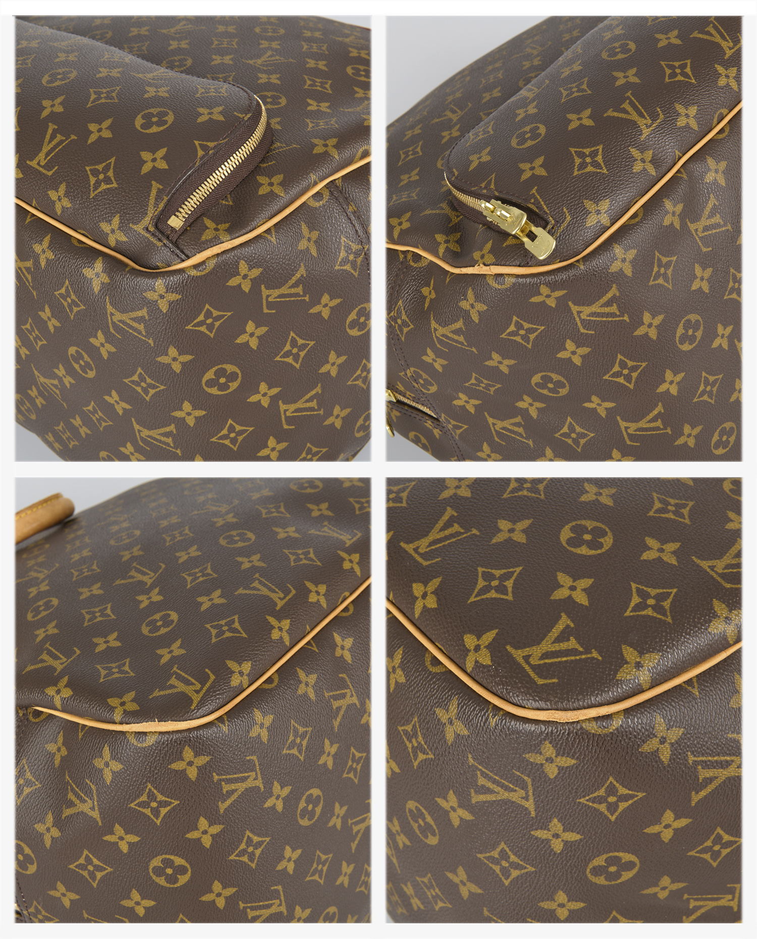 La toile Monogram marron et dorée, imperméable et résistante, recouvre l’ensemble du sac. Les coins sont soulignés par un passepoil en cuir naturel, qui a développé une patine miel caractéristique des pièces vintage Louis Vuitton. Les poignées en cuir rigide sont solidement fixées par des attaches rivetées en laiton doré. La grande poche frontale zippée épouse la forme du sac et se referme avec une double fermeture Éclair. Le dos et les côtés affichent une belle symétrie du motif Monogram, gage de qualité dans les productions anciennes.