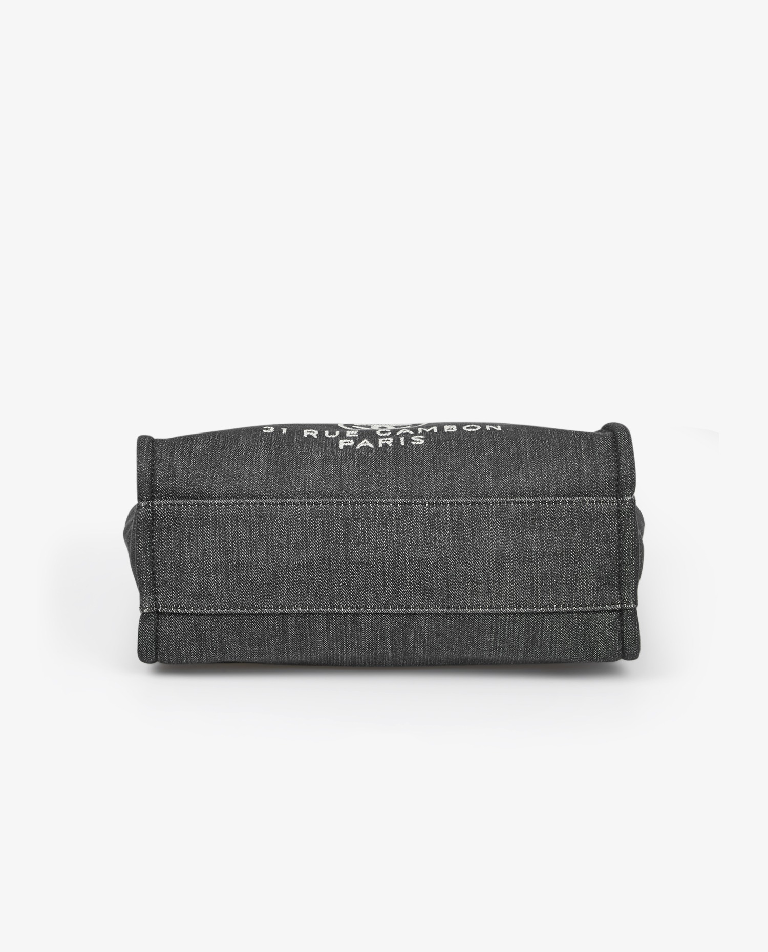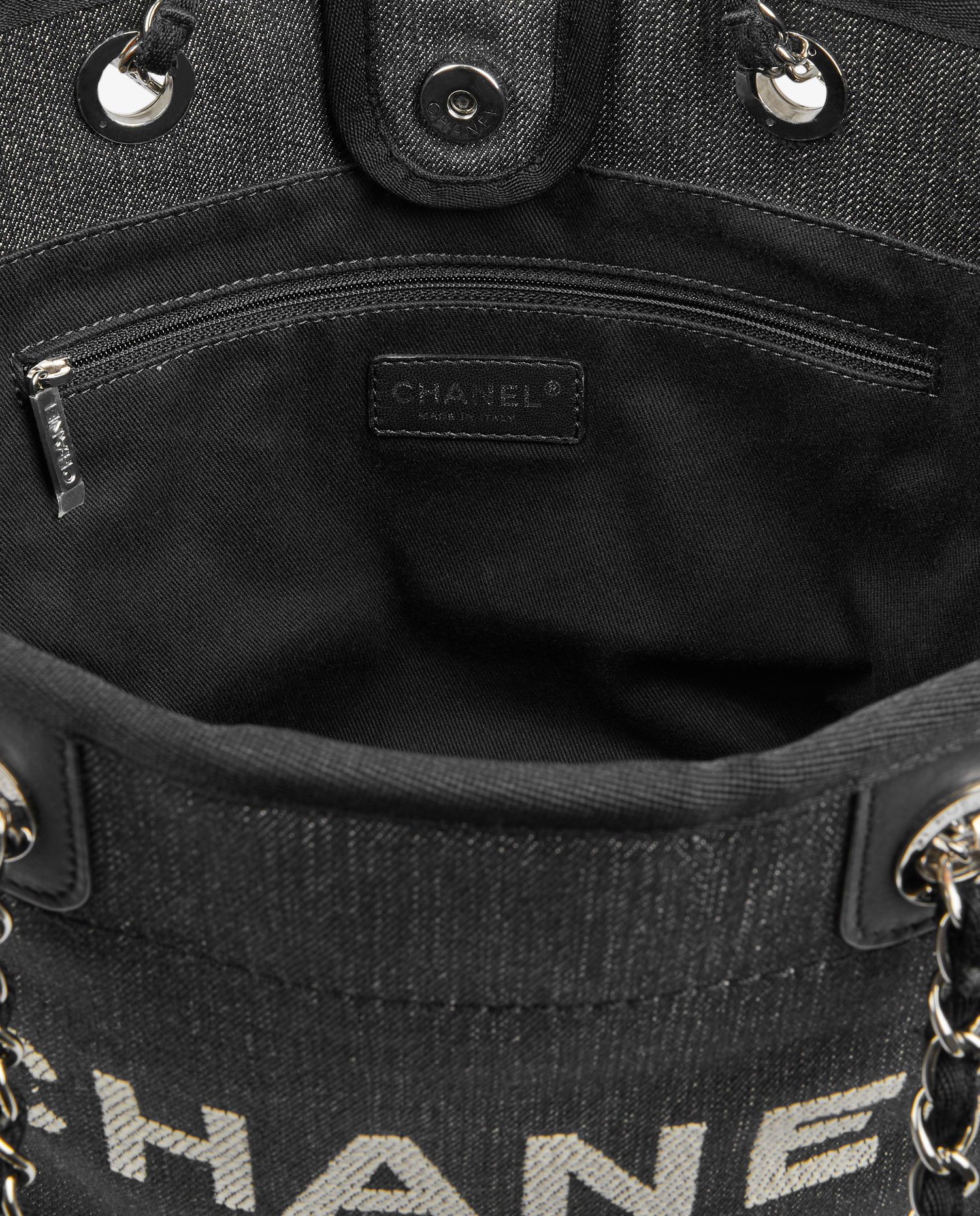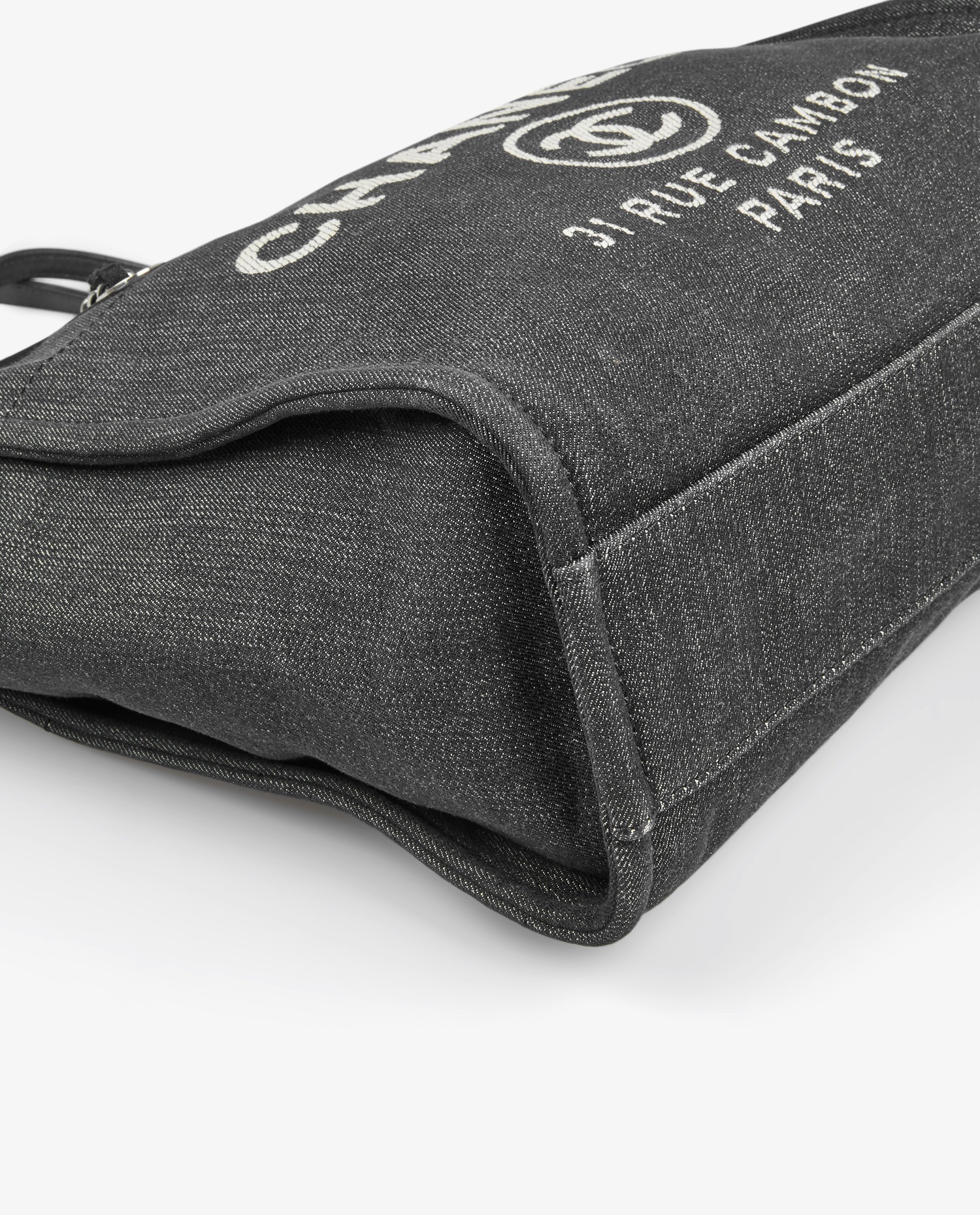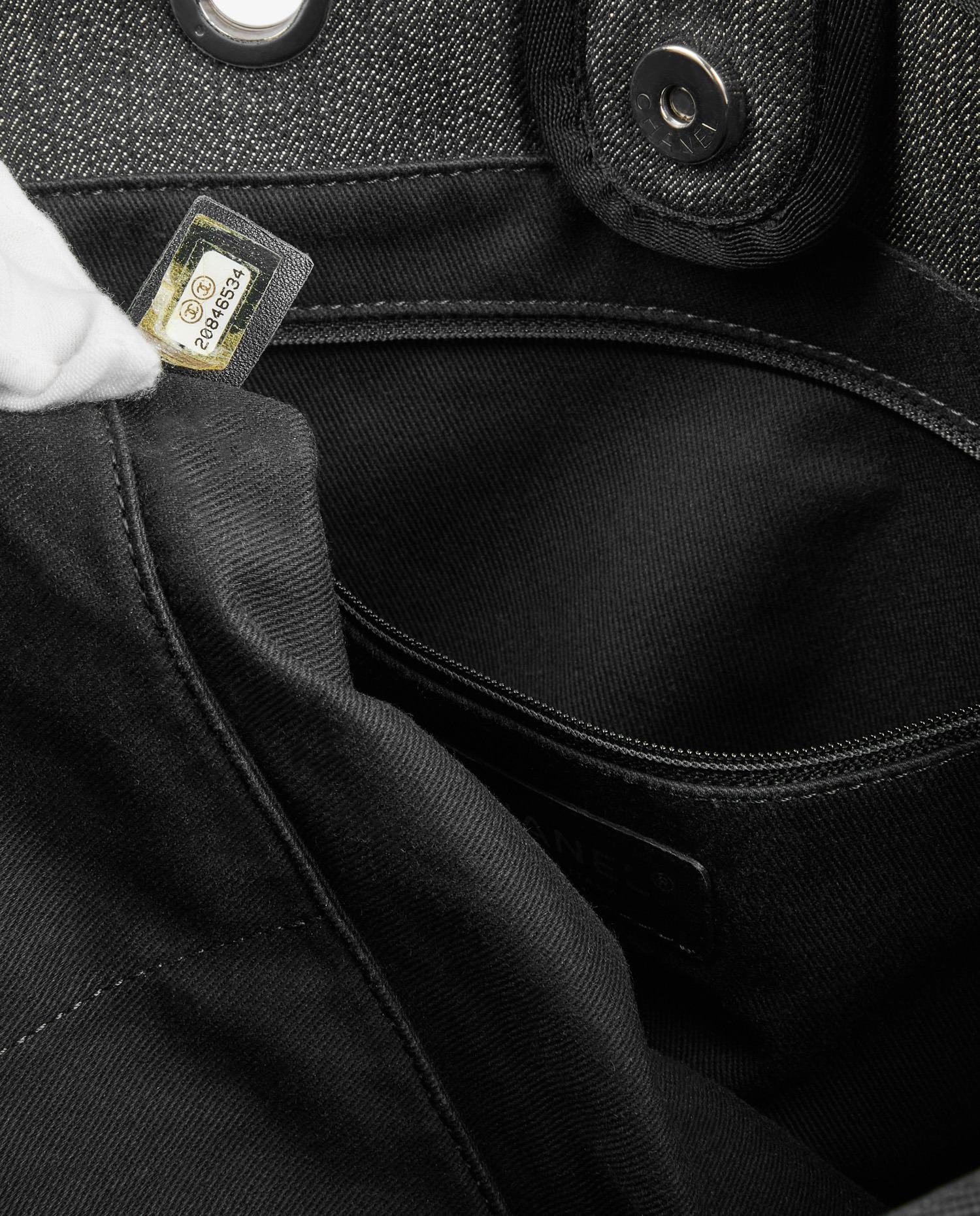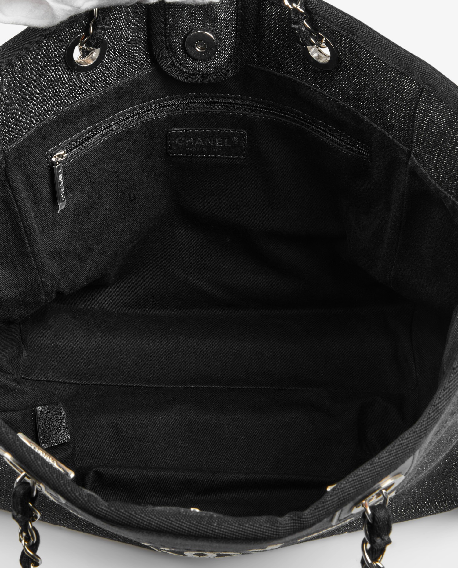 Sac Deauville Chanel en toile de denim noir. Porté épaule. L’intérieur est en tissu bleu marine avec une grande poche zippée. En très bon état. Quelques petites tâches dans le fond du sac.