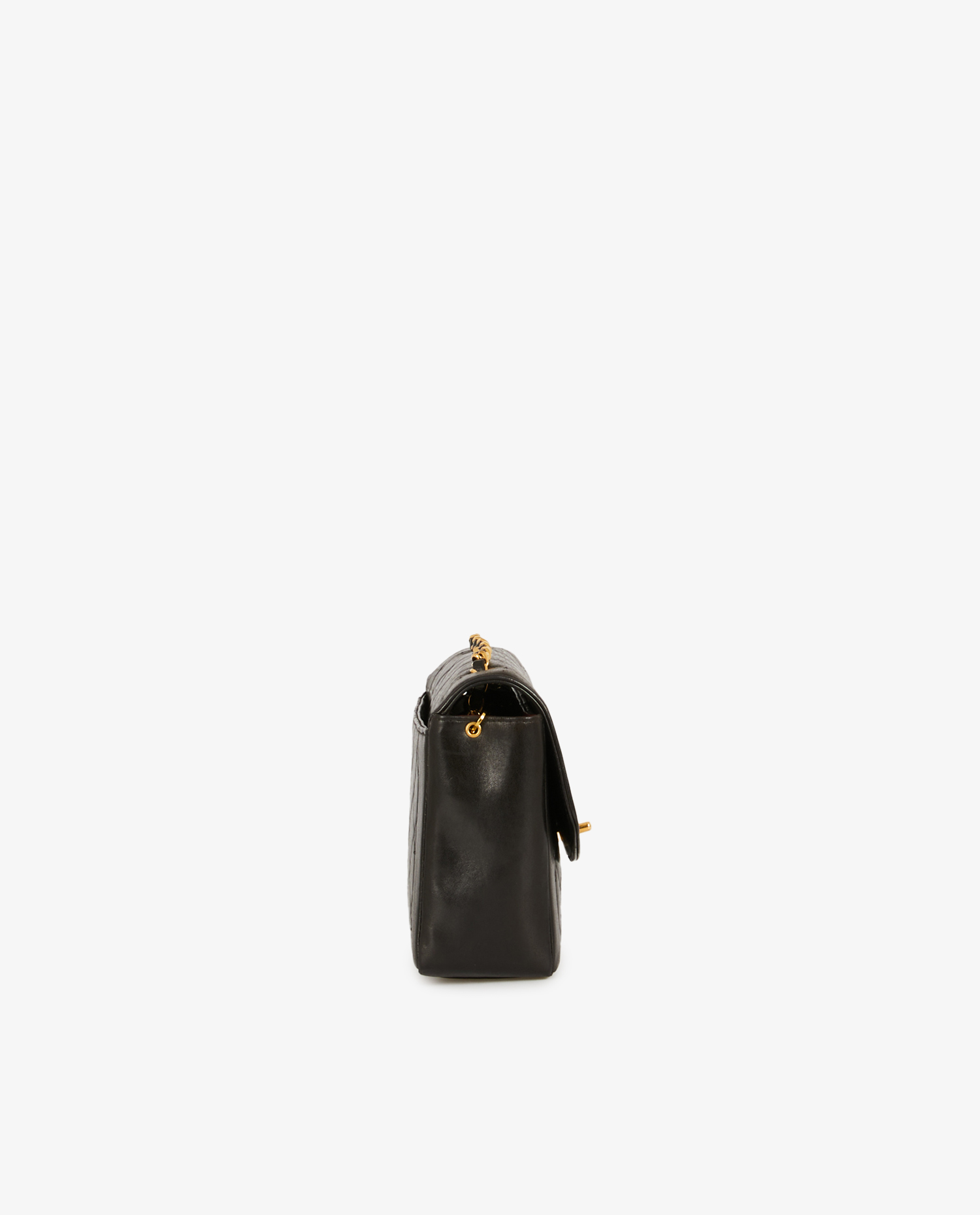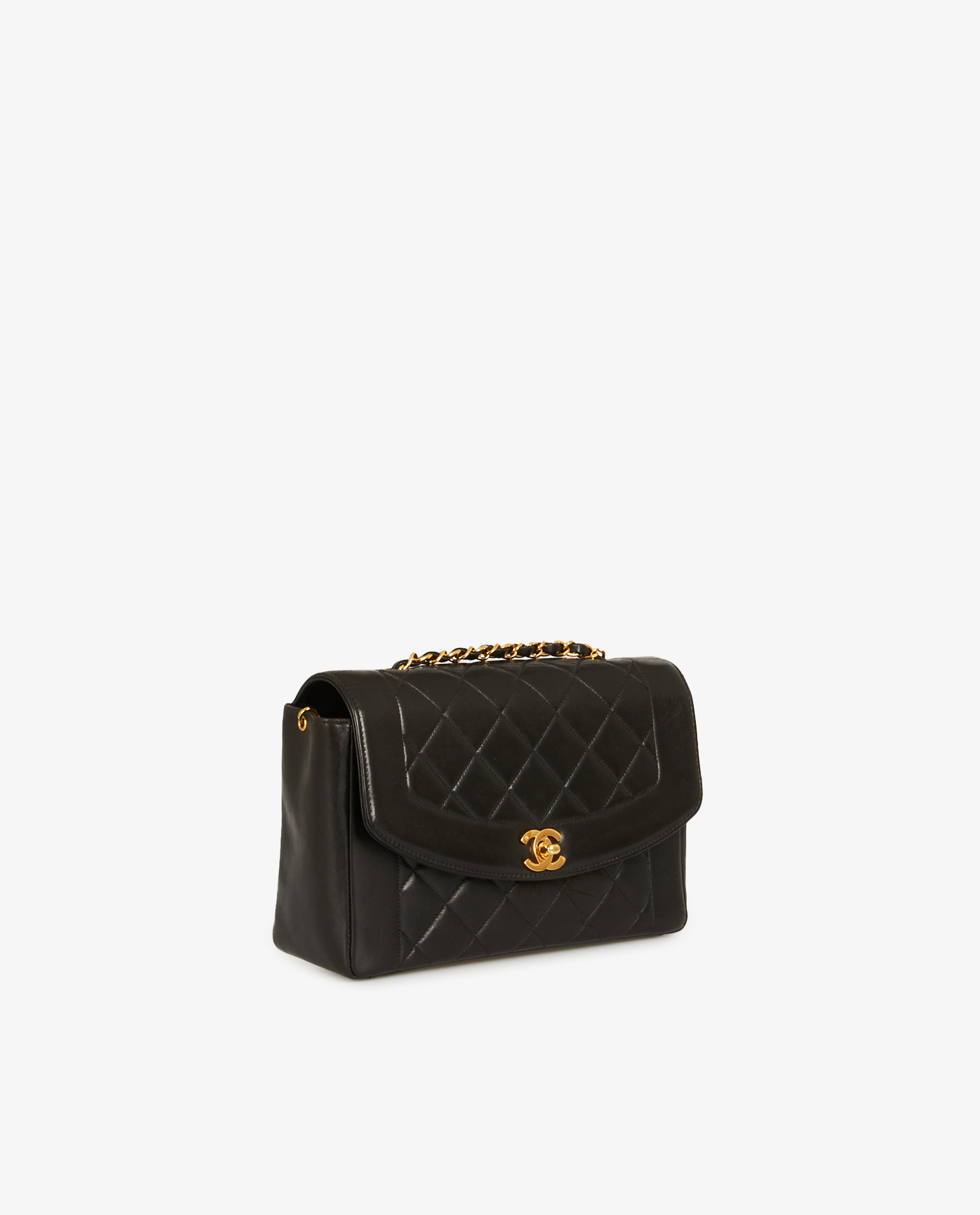 Sac Diana Chanel en cuir d’agneau noir. Porté épaule ou en bandoulière (106cm). Taille médium. En très bon état.