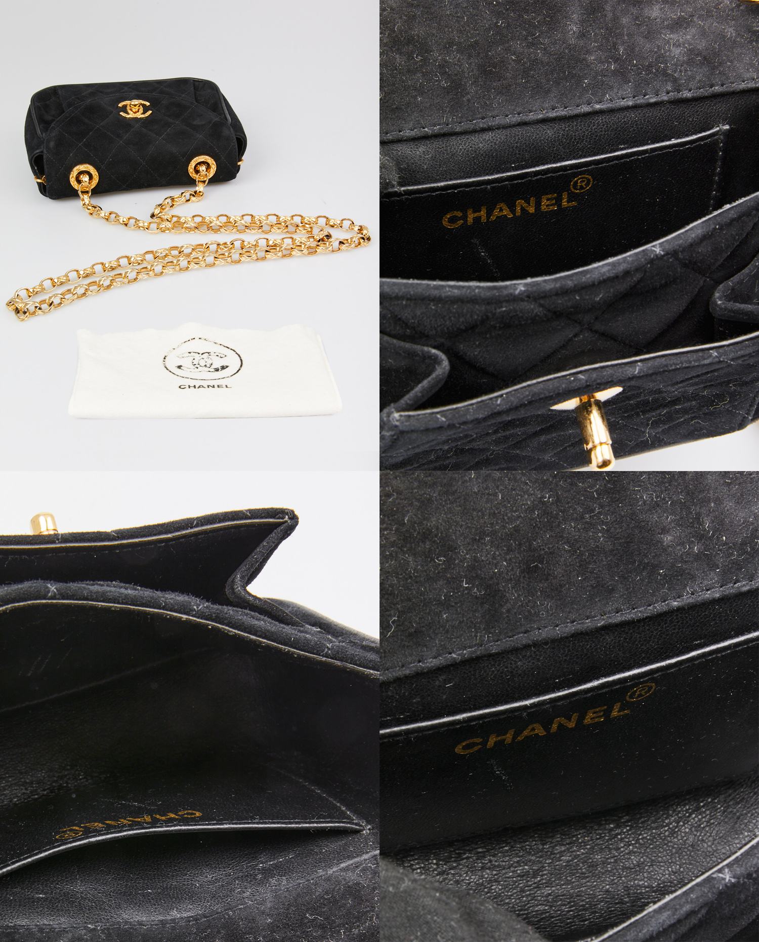 Mini sac du soir Chanel vintage en veau velours noir. Bijouterie dorée matelassé. Porté à l’épaule ou en bandoulière (104cm). L’intérieur est en cuir noir. En très bon état.