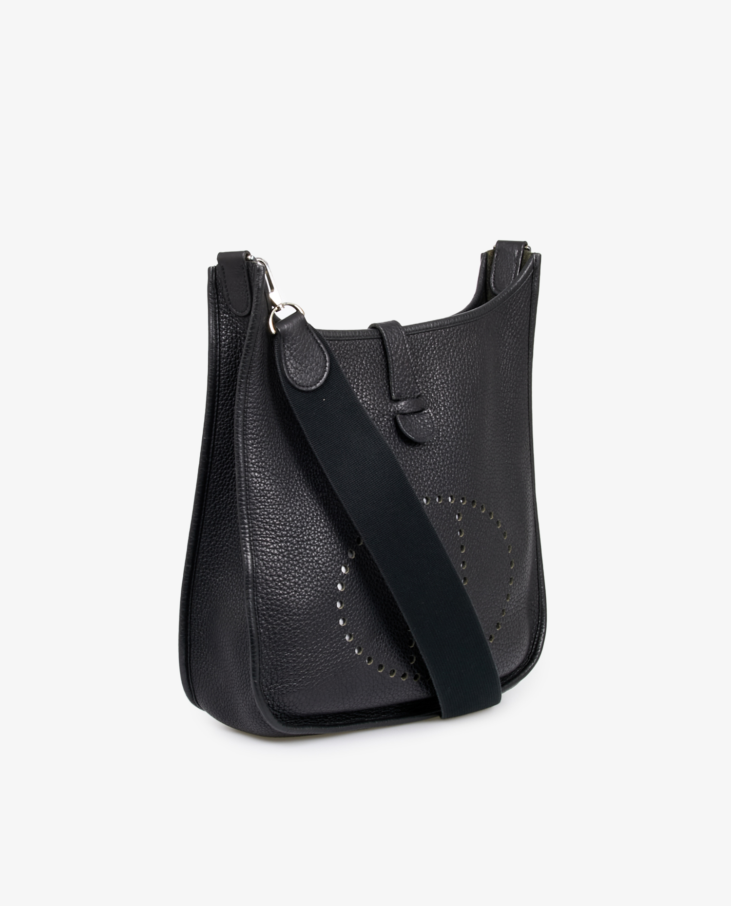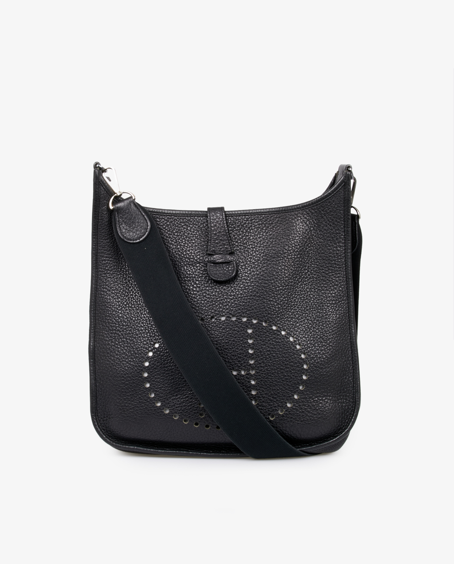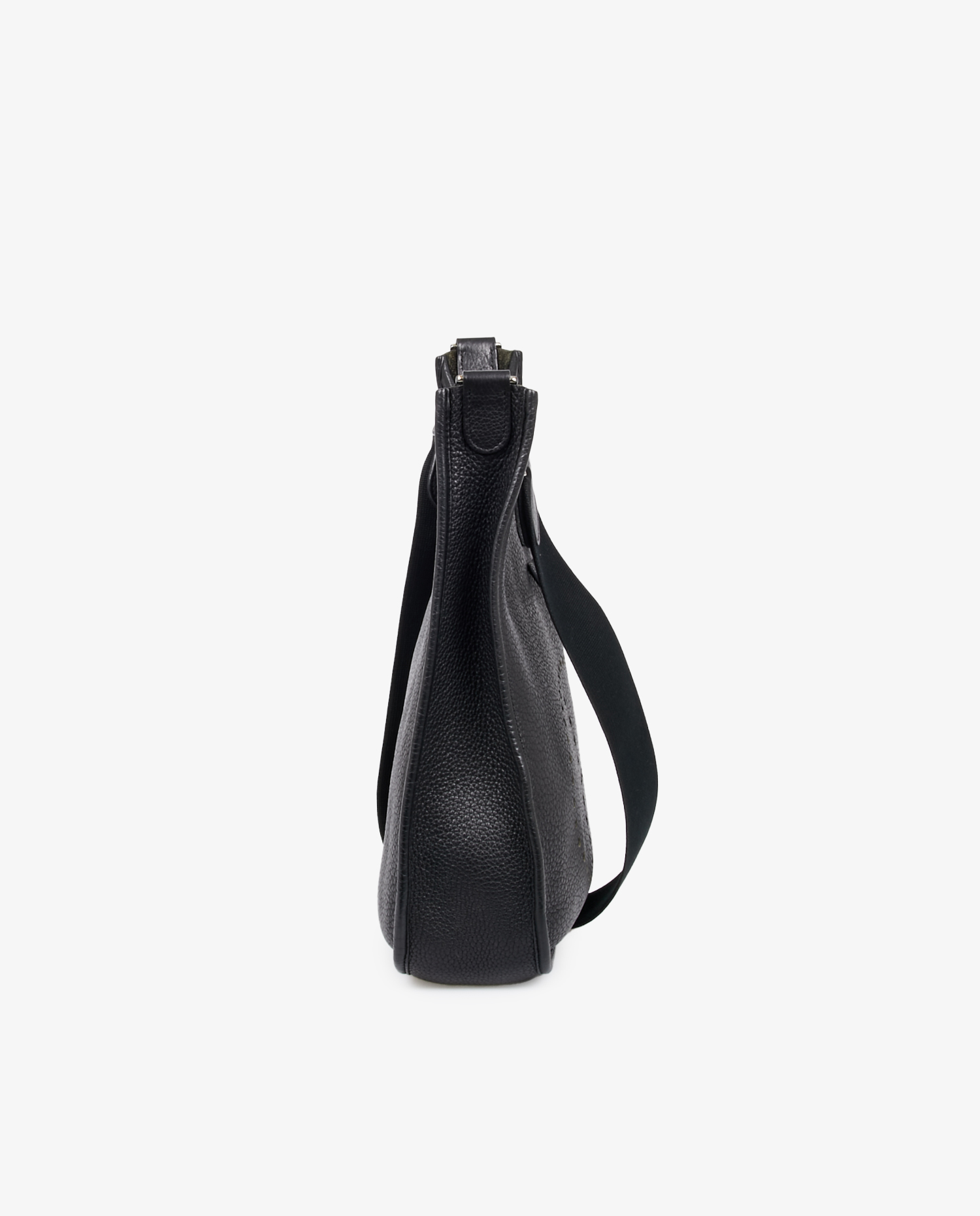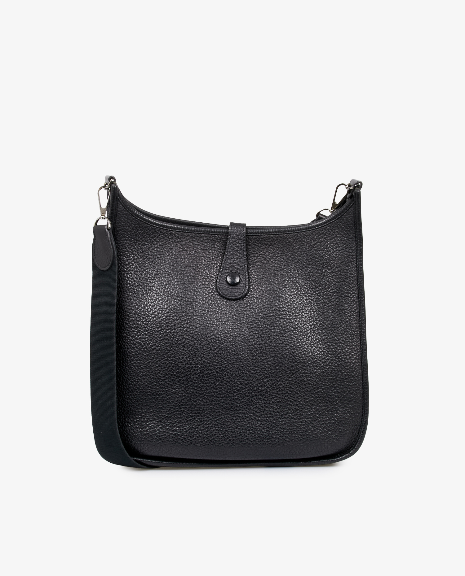 Sac Evelyne Hermès vintage en togo noir. Bijouterie argent. Porté épaule à l’aide d’une bandoulière amovible en nylon. En très bon état.