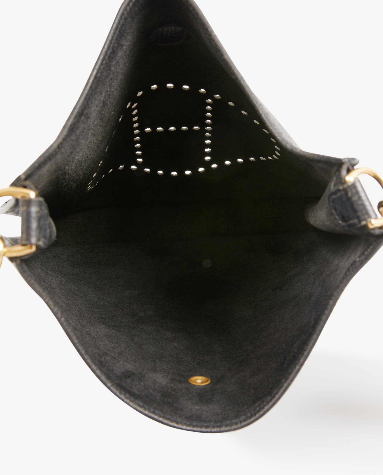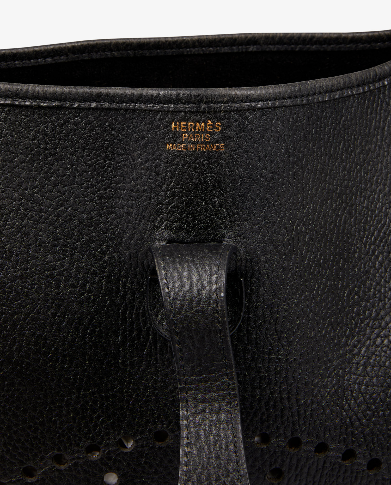 Sac Evelyne Hermès en cuir togo noir. Bijouterie dorée. Porté en bandoulière. Possibilité d’y glisser un ordinateur. La longueur de la bandoulière est ajustable. En très bon état.