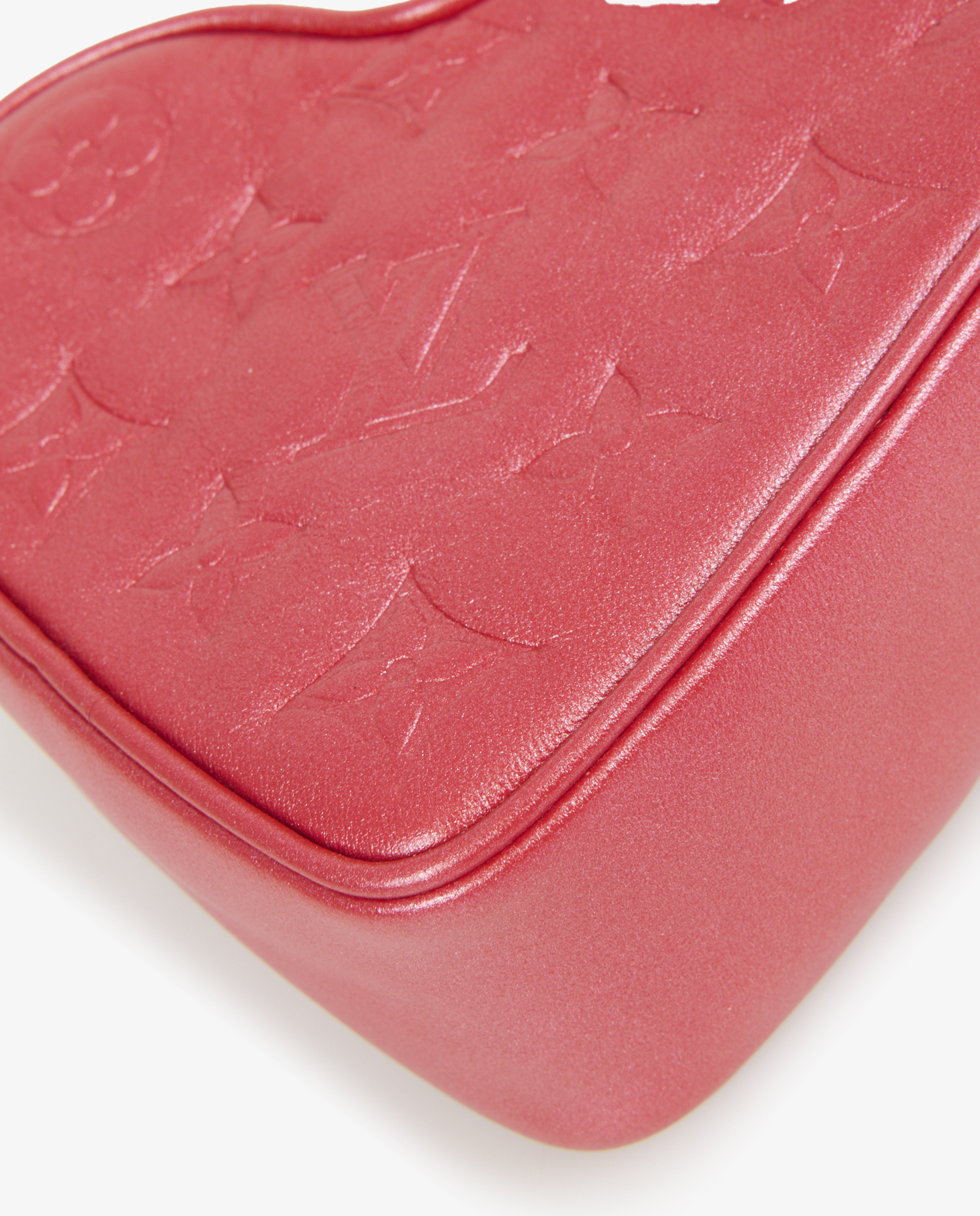 L’intérieur est doublé en microfibre douce de couleur beige rosé, qui contraste avec l’extérieur rouge. Sobre et fonctionnel, il propose un compartiment unique adapté pour contenir de petits essentiels comme cartes, rouge à lèvres ou écouteurs. L’étiquette en cuir estampillée « Louis Vuitton Paris – Made in Italy » confirme l’authenticité et la provenance du sac.
