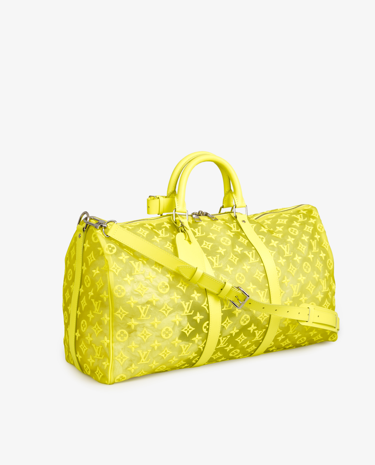 Sac Keepall 50 bandoulière Mesh Louis Vuitton en toile jaune fluo et finitions en cuir de vache. L’accastillage est en métal argent. Il se porte à la main ainsi qu’à l’épaule à l’aide d’une bandoulière amovible. En très bon état.