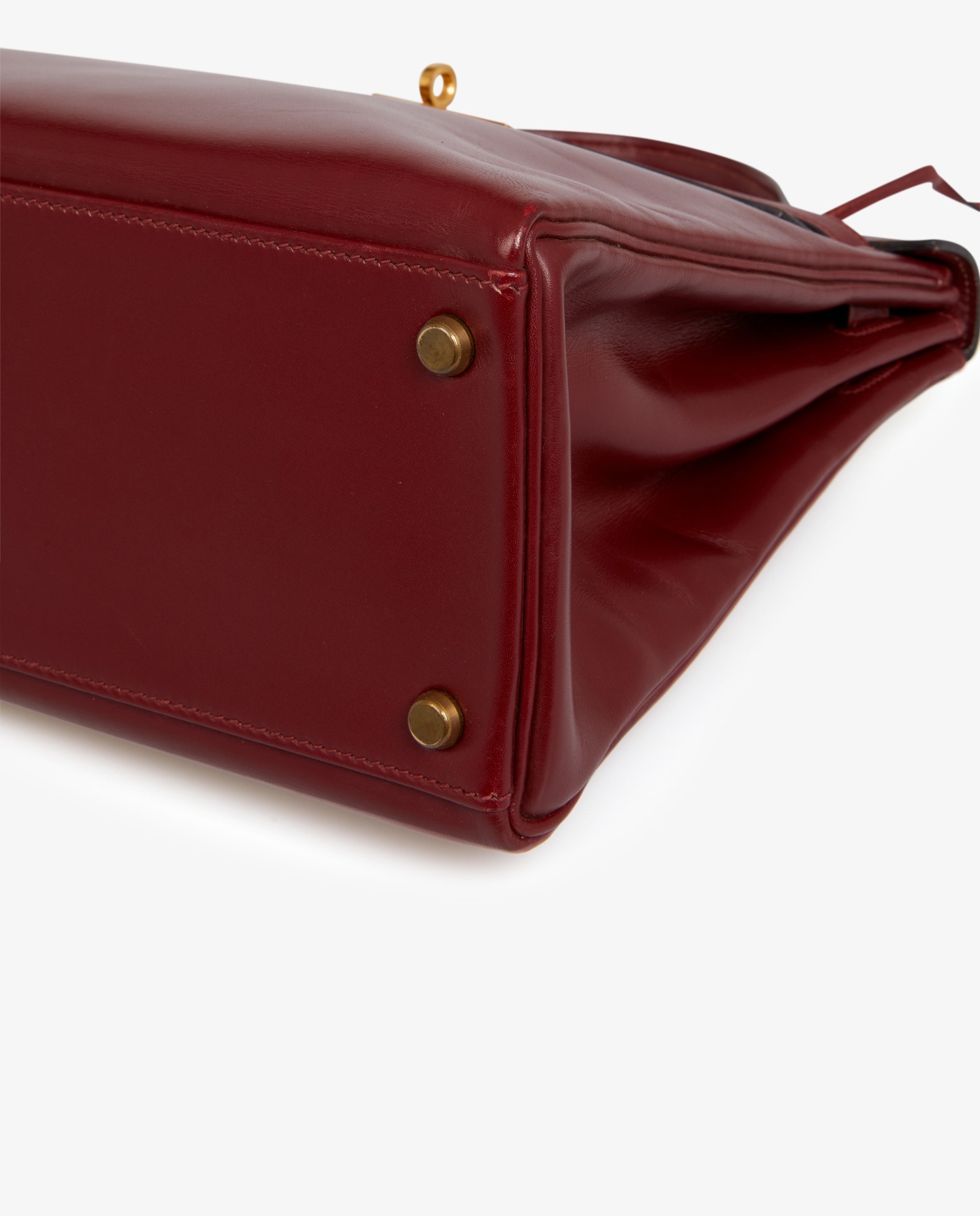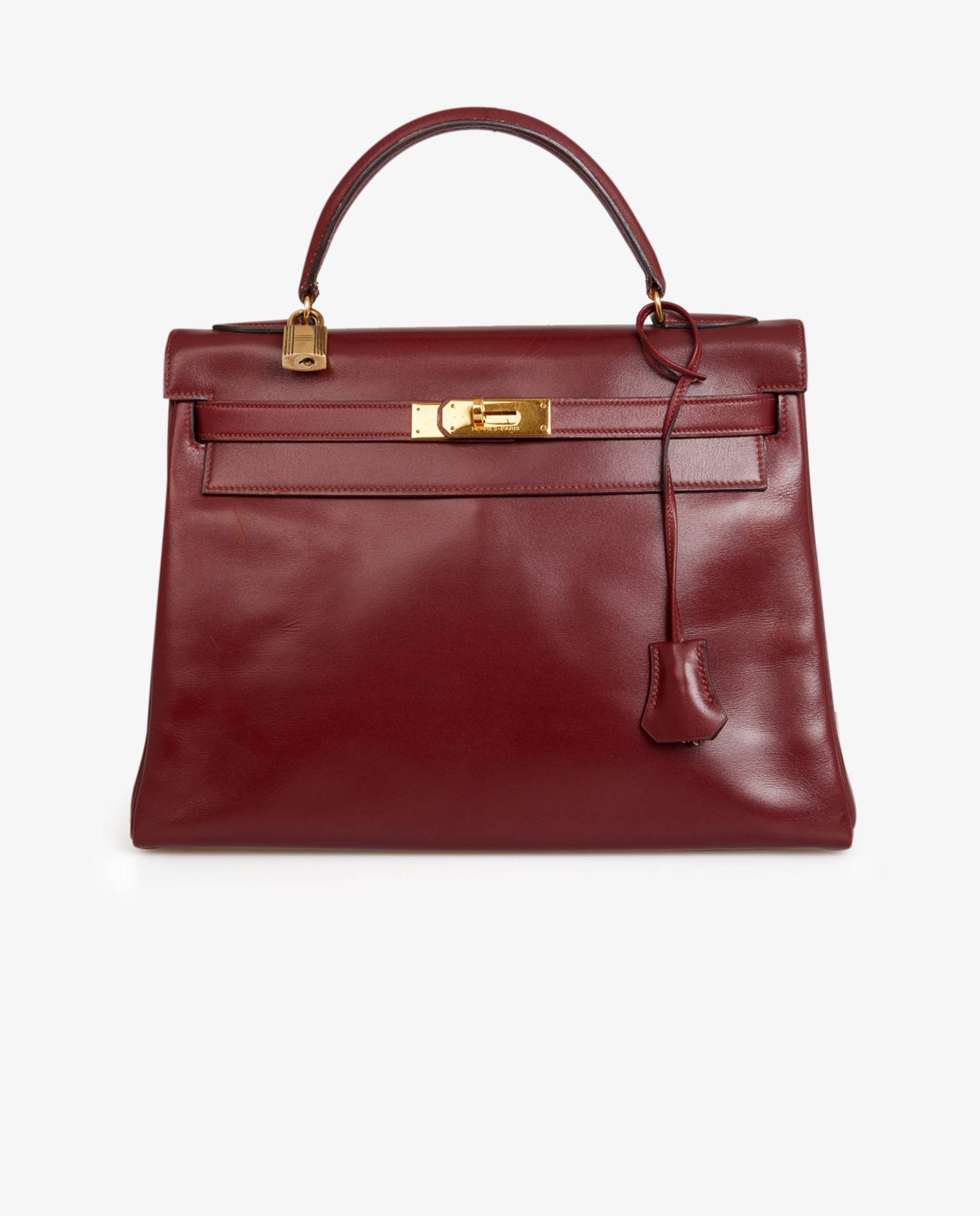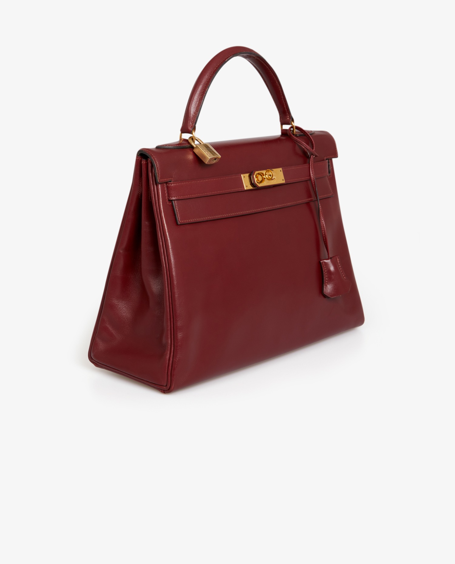 Sac Kelly 32 cuir box rouge H Hermès. Lettre O dans un rond, année 1985. Tirette, clochette, clefs et cadenas. Il se porte à la main, possibilité de rajouter une bandoulière chez Hermès. En très bon état. Quelques rayures d’usure. Voir photos.