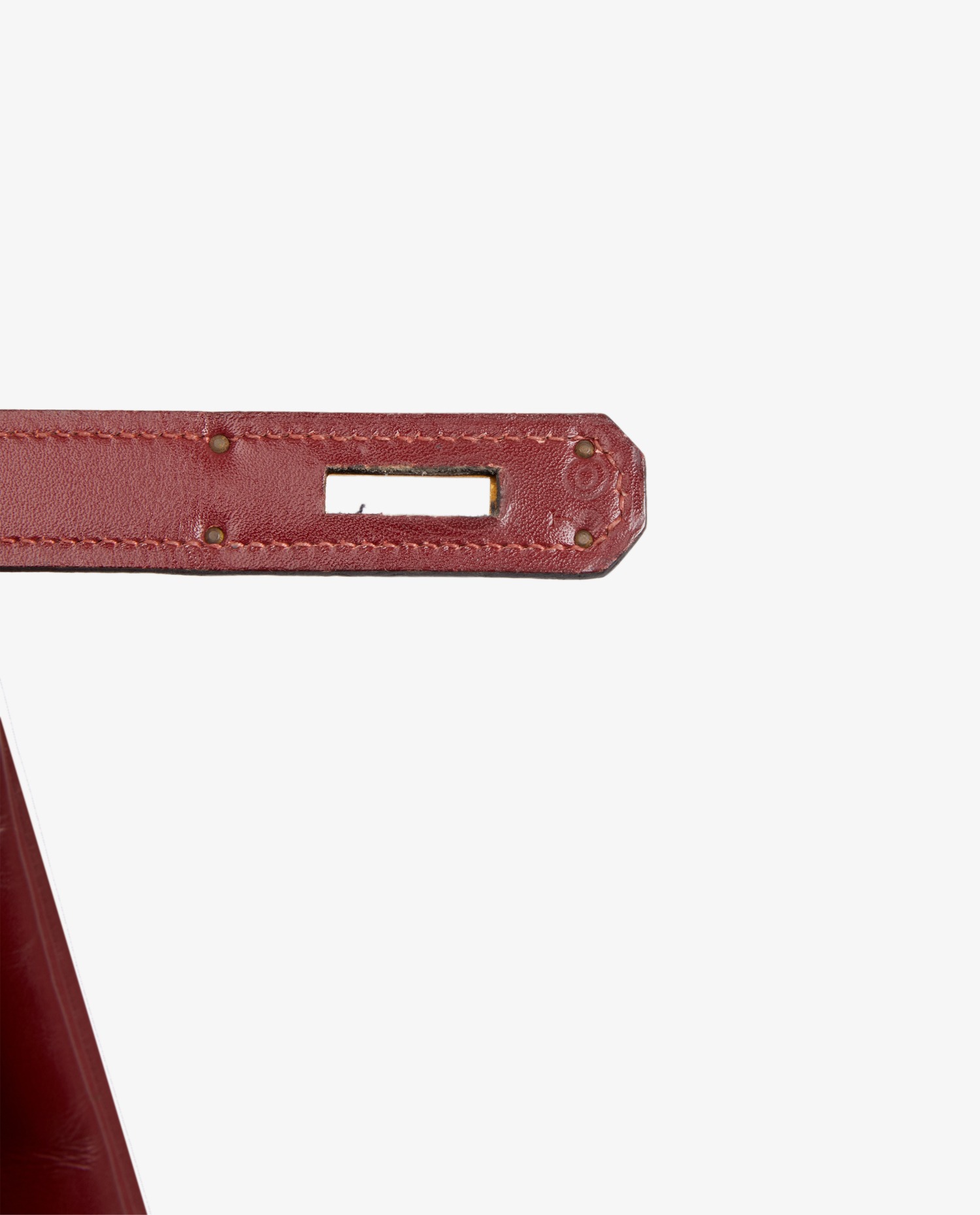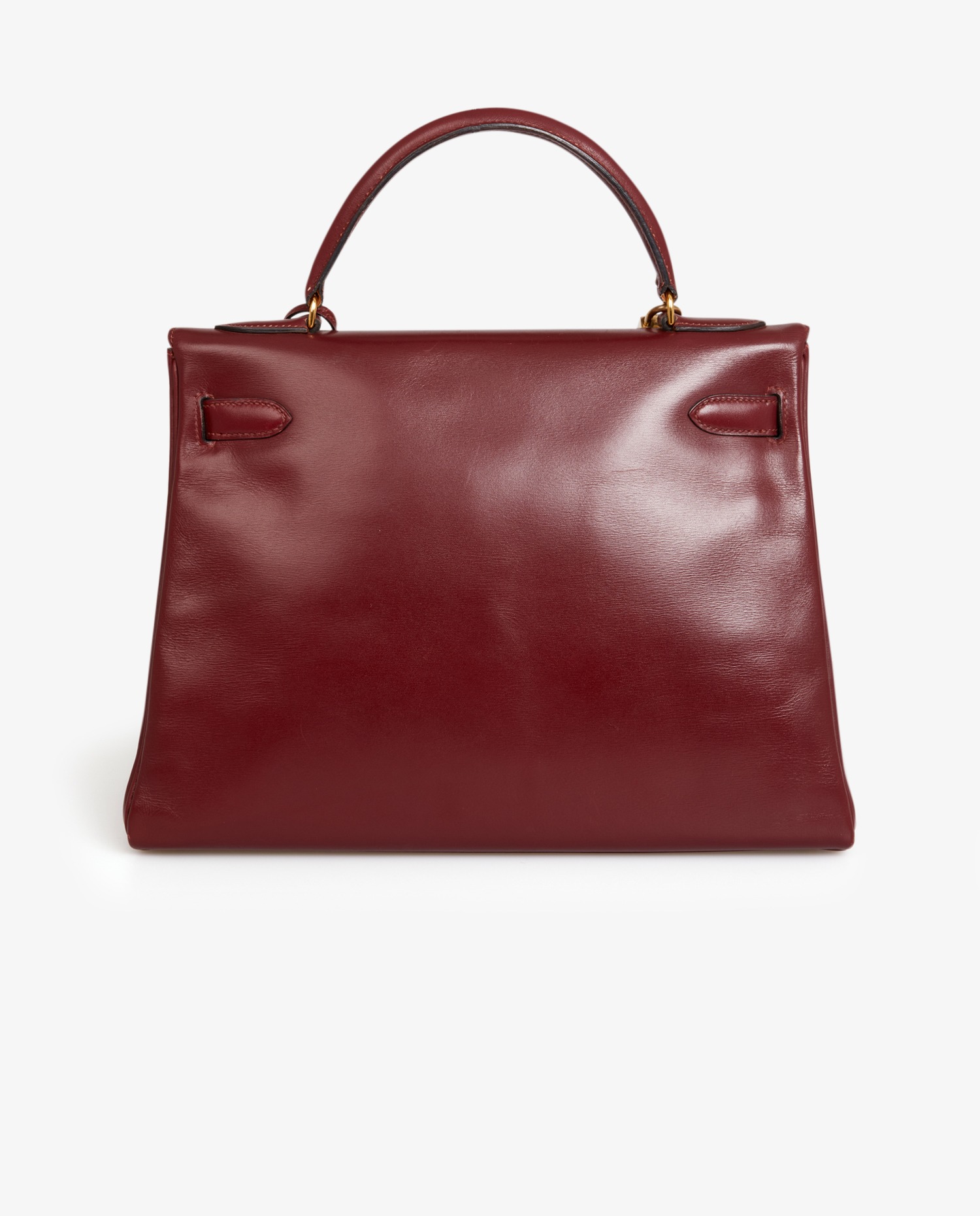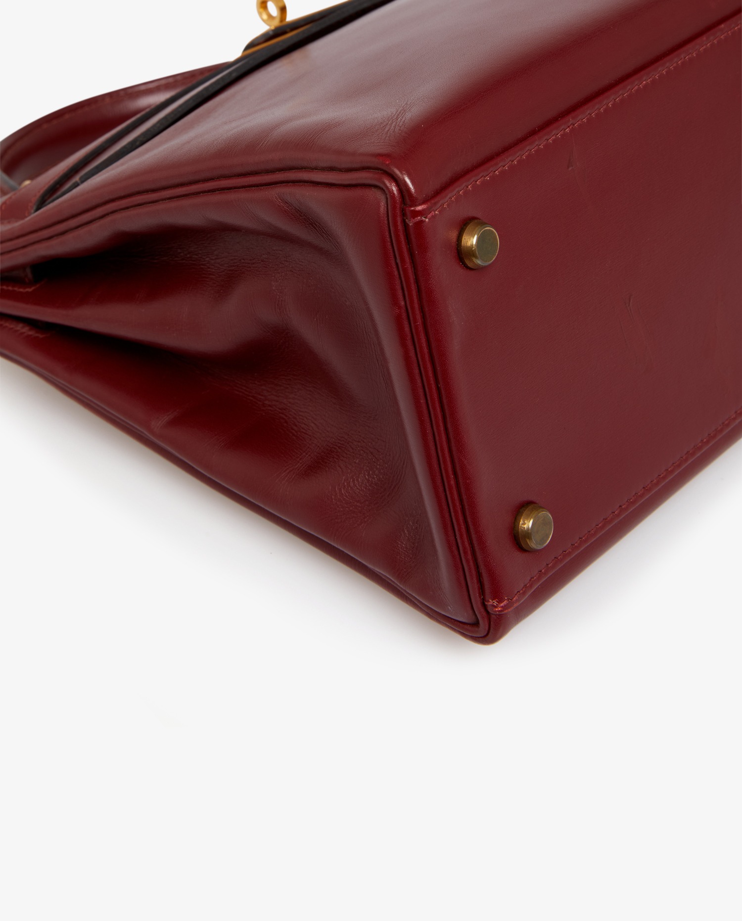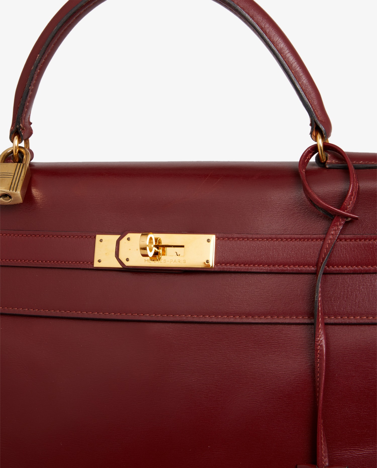 Sac Kelly 32 cuir box rouge H Hermès. Lettre O dans un rond, année 1985. Tirette, clochette, clefs et cadenas. Il se porte à la main, possibilité de rajouter une bandoulière chez Hermès. En très bon état. Quelques rayures d’usure. Voir photos.