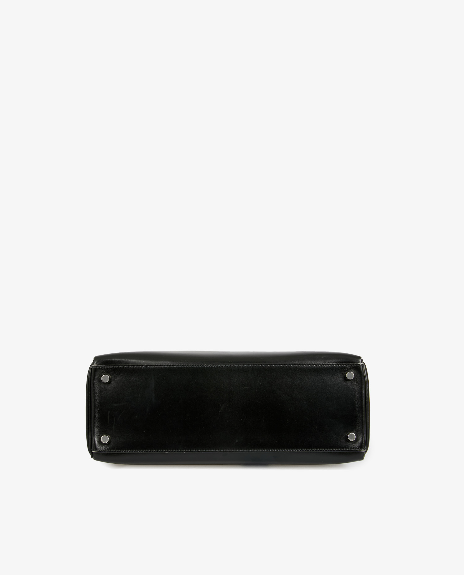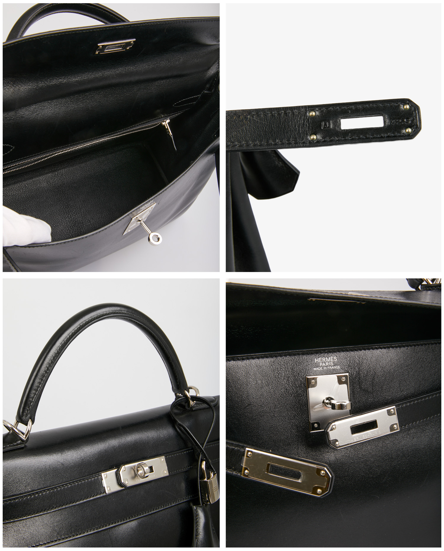Sac Kelly II 32cm Hermès en cuir box noir. Bijouterie argent. Porté main ou à l’épaule à l’aide de sa bandoulière amovible. Tirette, clochette, cadenas et clefs. En très bon état. Les plastiques sont toujours présents sur l’accastillage. Livré dans son dustbag d’origine.