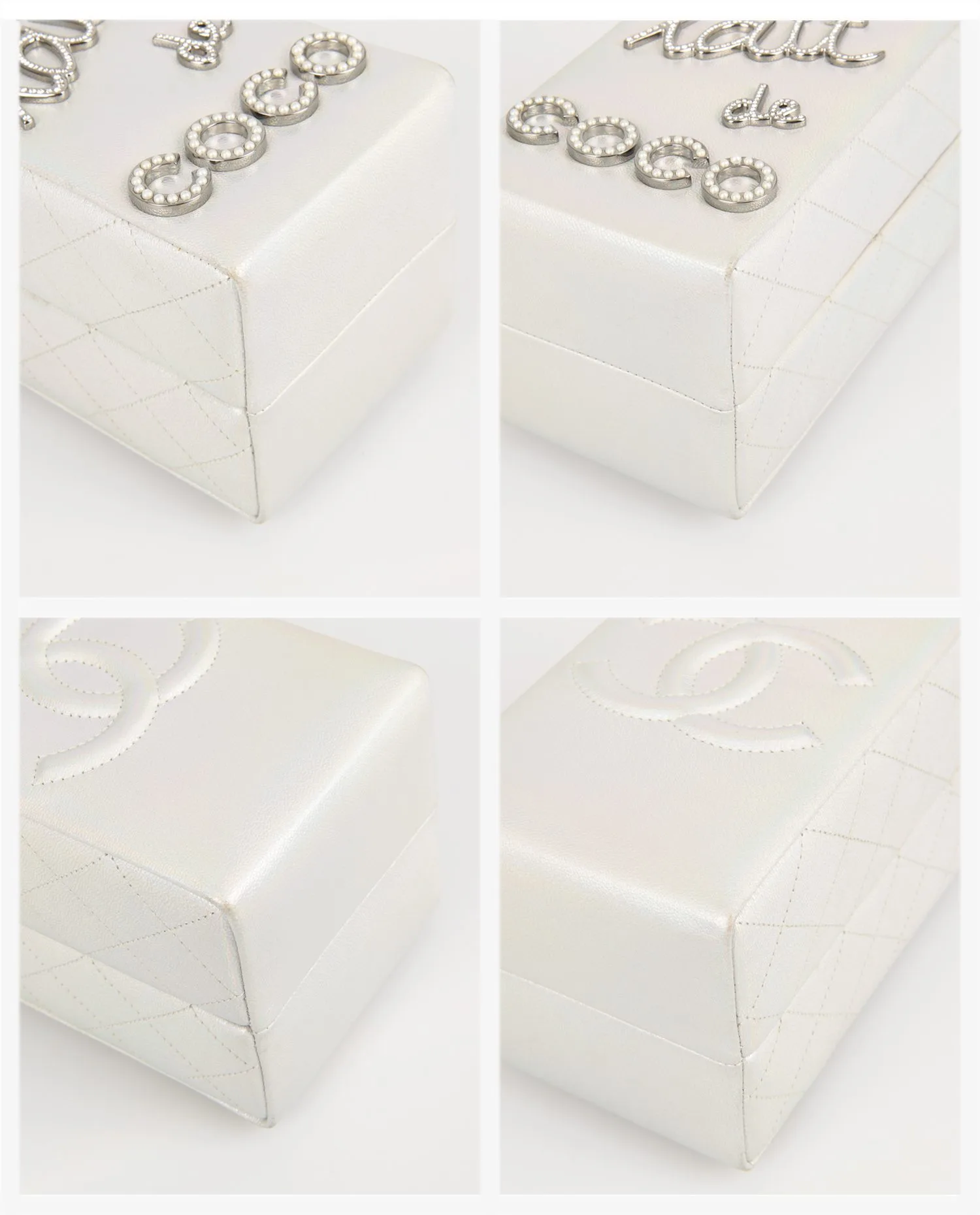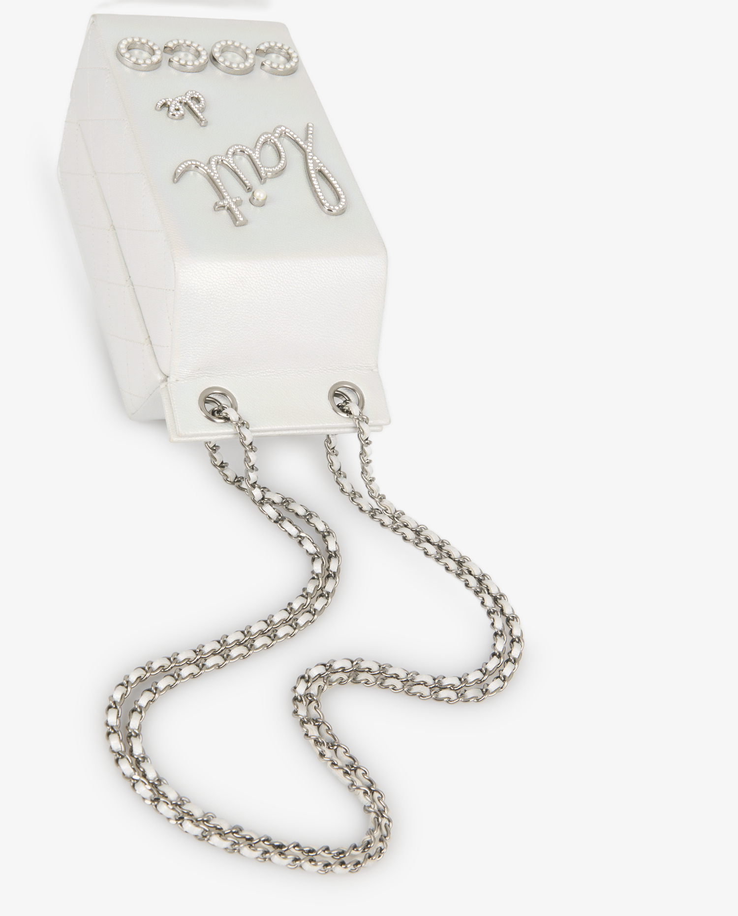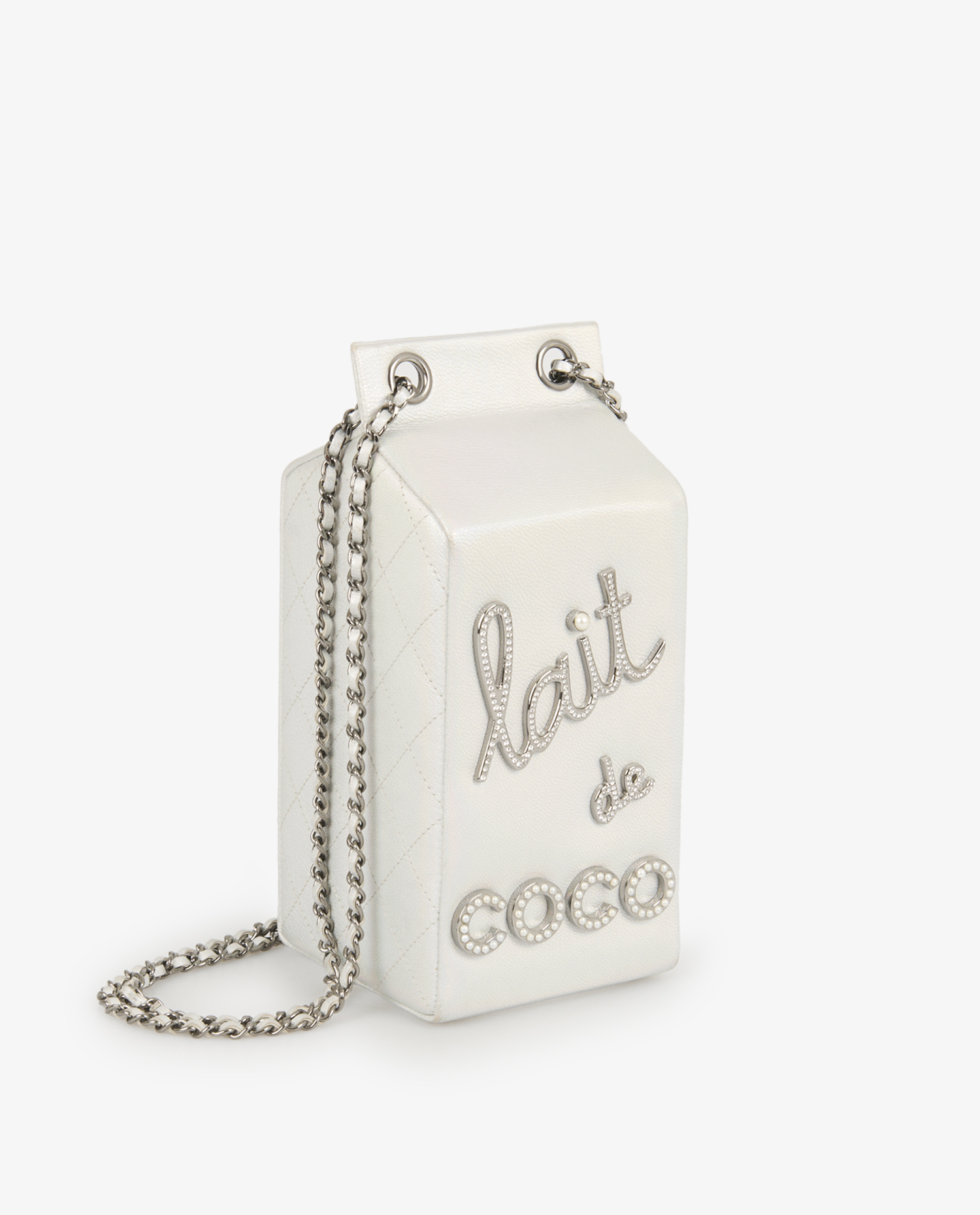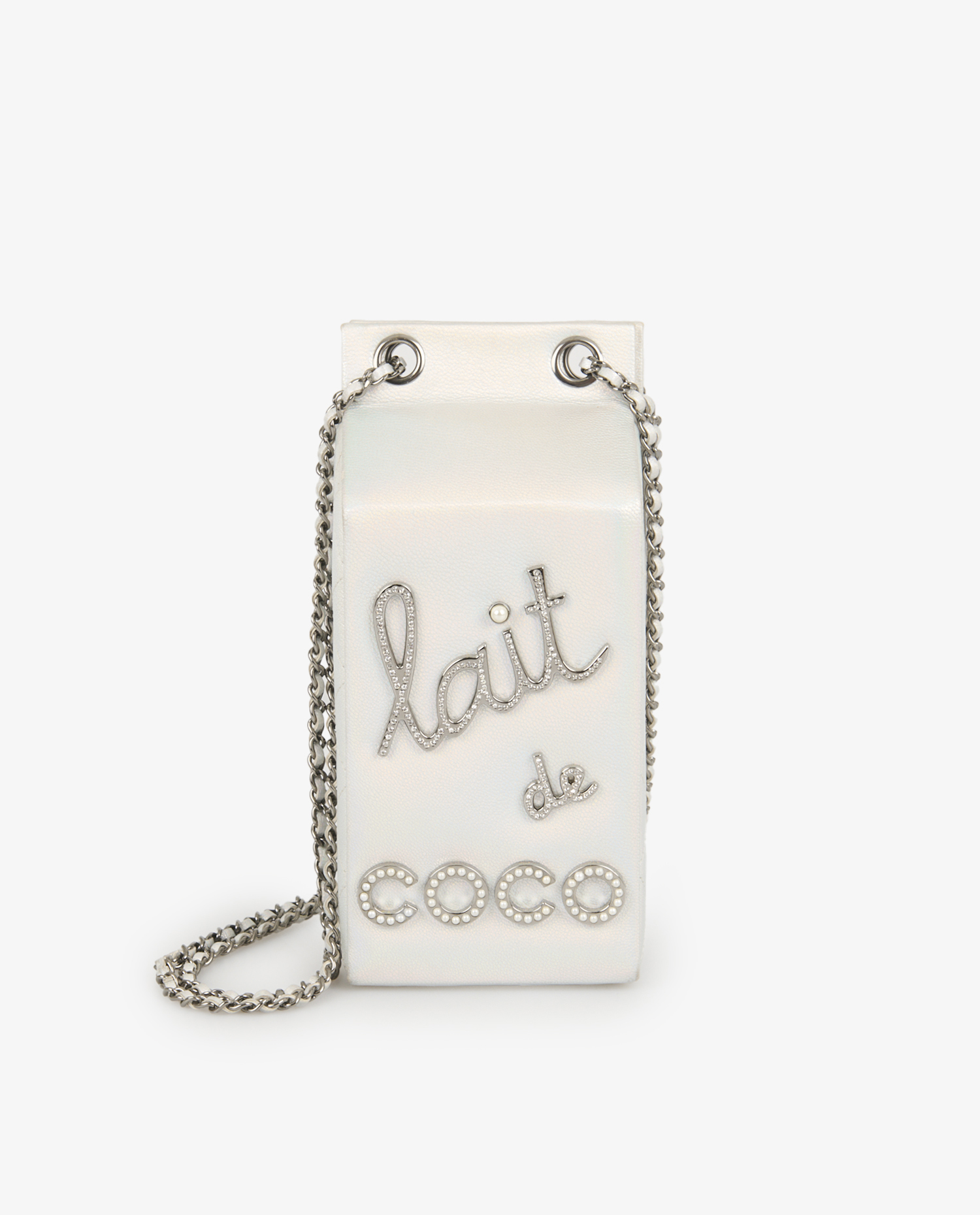 Le sac est confectionné en cuir blanc nacré à reflets irisés, avec des côtés matelassés en losanges et le logo CC embossé à l’arrière. L’avant arbore l’inscription « lait de coco » en lettres argentées serties de strass et de perles imitation, ajoutant éclat et originalité. La bandoulière est constituée d’une chaîne en métal argenté vieilli entrelacée de cuir blanc, signature de la maison. Sa forme rectangulaire, allongée et rigide, évoque une brique de lait, mesurant environ 20 x 11 x 9 cm.