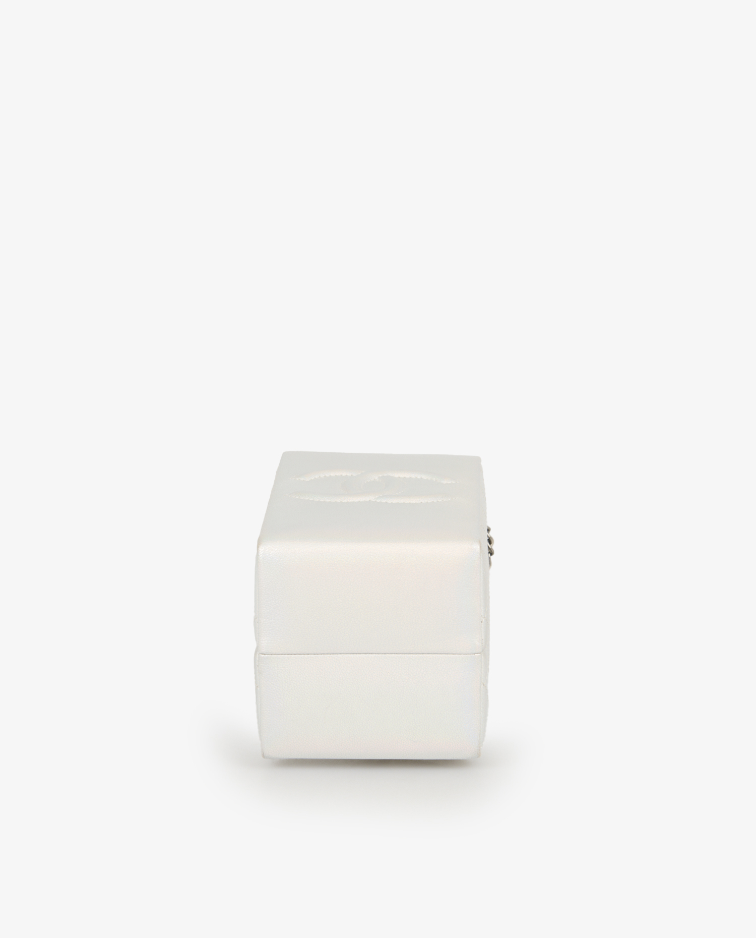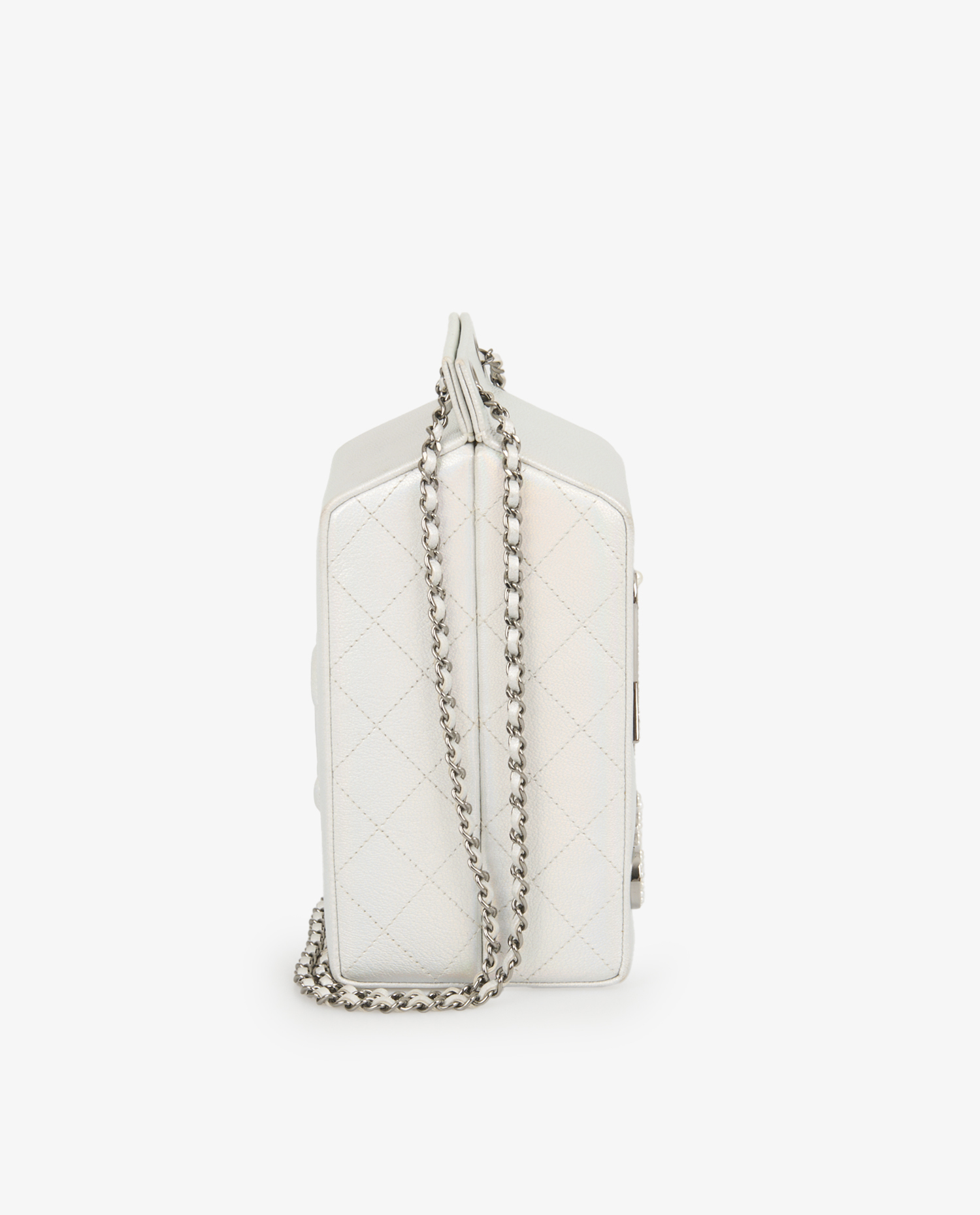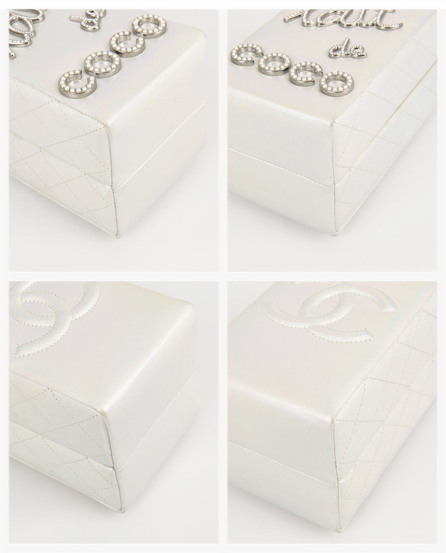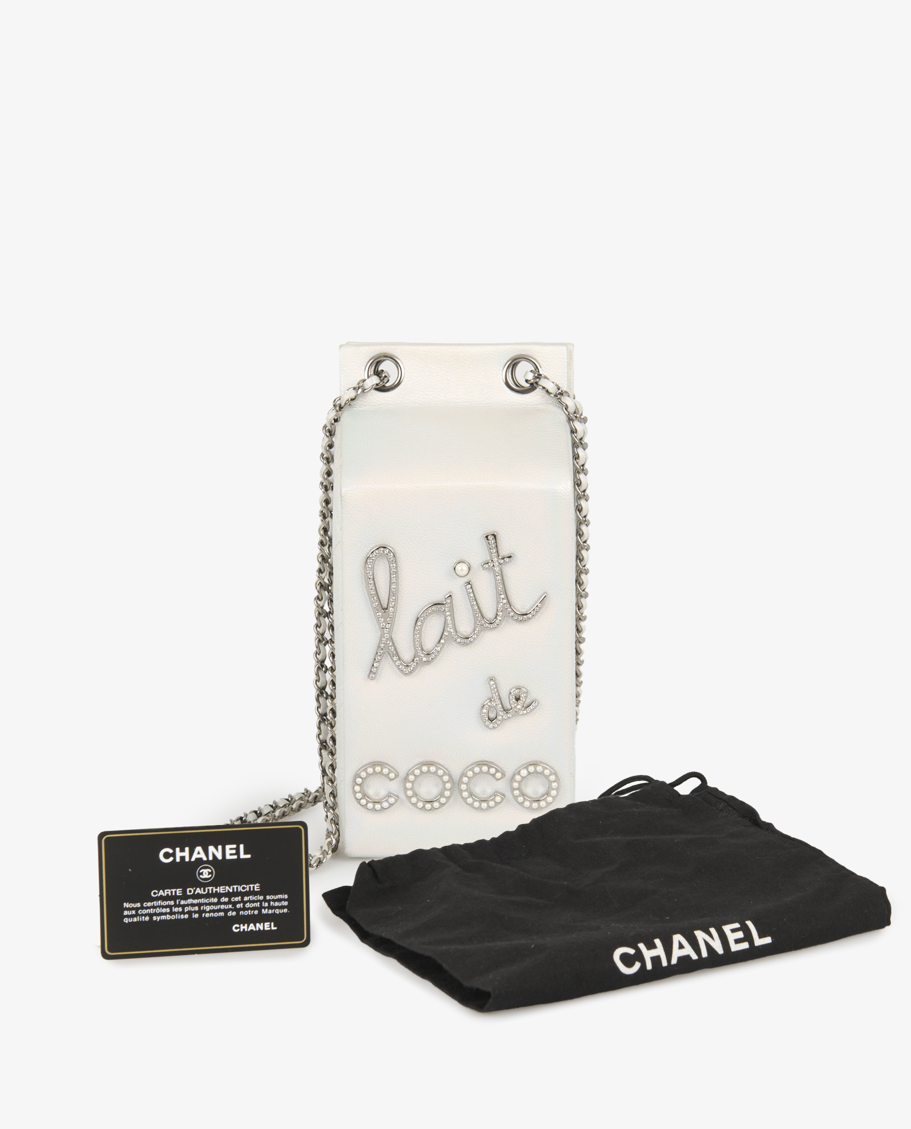 Le sac est confectionné en cuir blanc nacré à reflets irisés, avec des côtés matelassés en losanges et le logo CC embossé à l’arrière. L’avant arbore l’inscription « lait de coco » en lettres argentées serties de strass et de perles imitation, ajoutant éclat et originalité. La bandoulière est constituée d’une chaîne en métal argenté vieilli entrelacée de cuir blanc, signature de la maison. Sa forme rectangulaire, allongée et rigide, évoque une brique de lait, mesurant environ 20 x 11 x 9 cm.
