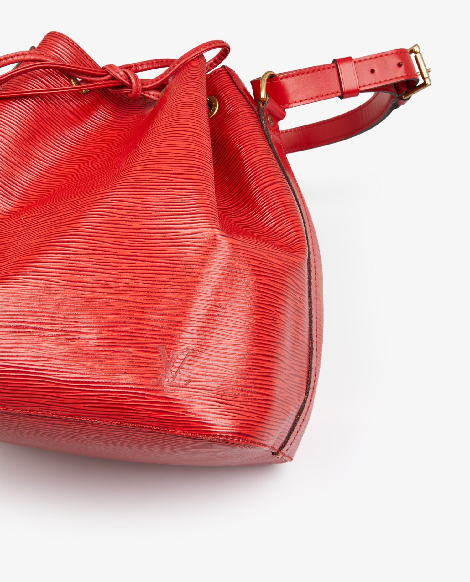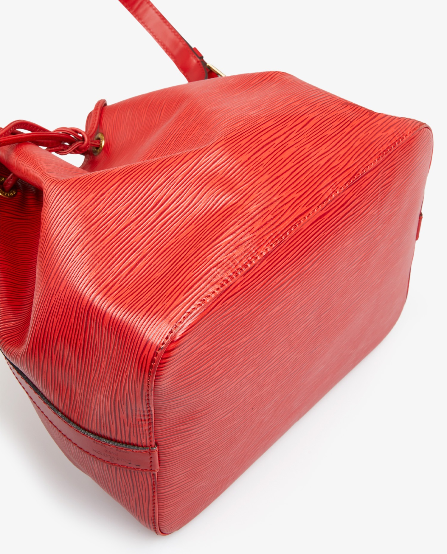 Sac Noé Louis Vuitton cuir épi rouge. Porté épaule et crossbody. Un lien vient fermer les sac. En très bon état.