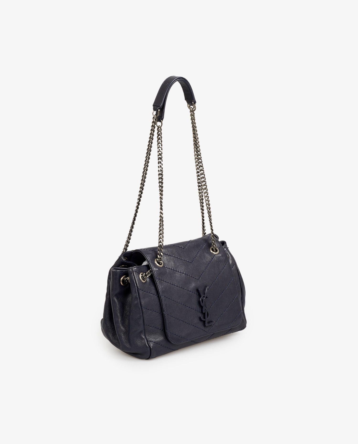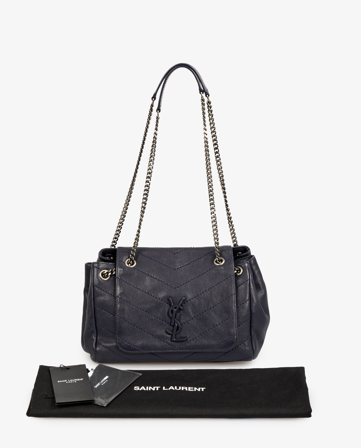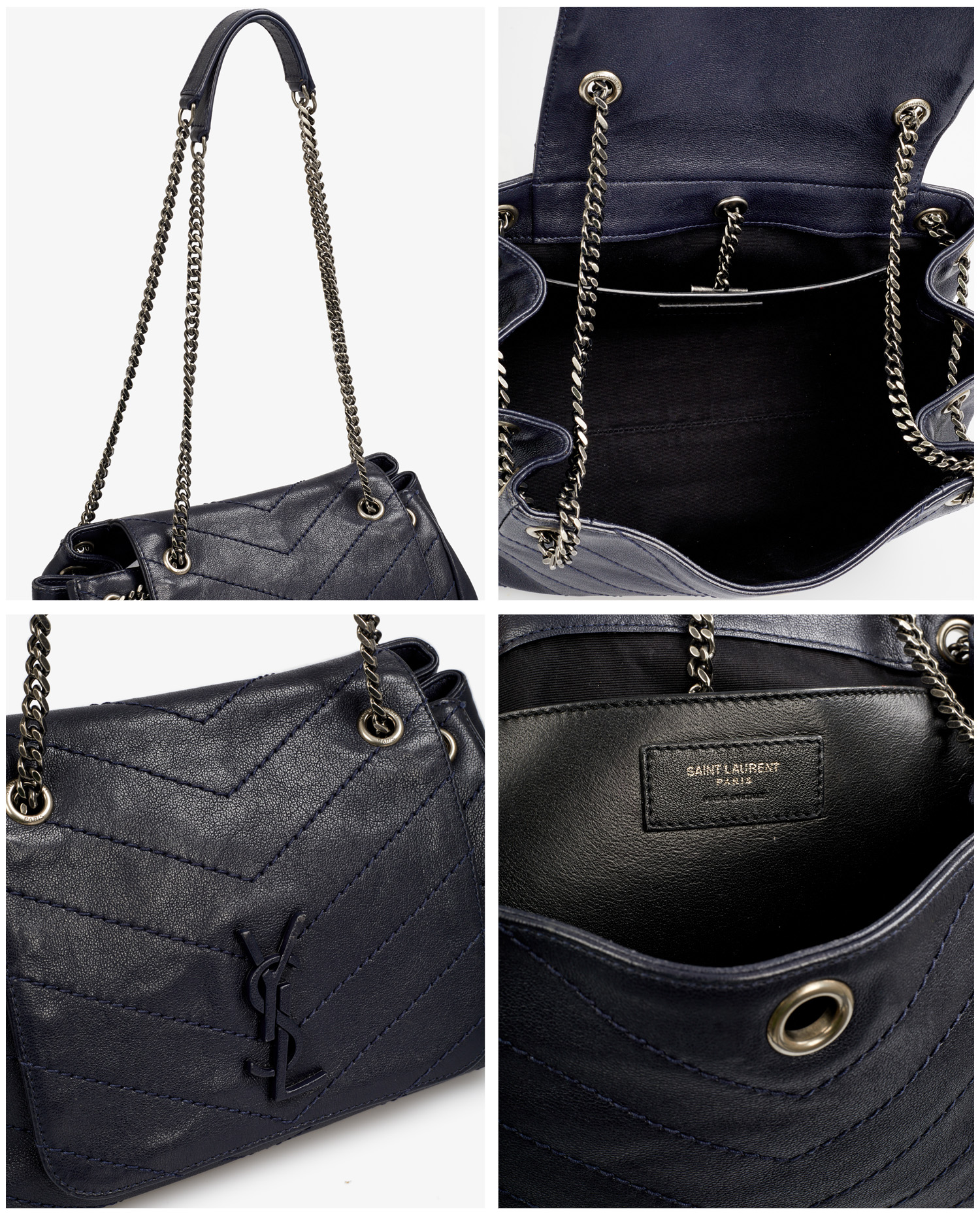 Sac Nolita Yves Saint Laurent en cuir bleu marine. Porté épaule ou croisé à l’aide d’une bandoulière coulissante en chaine argent et renforcement en cuir. En très bon état.