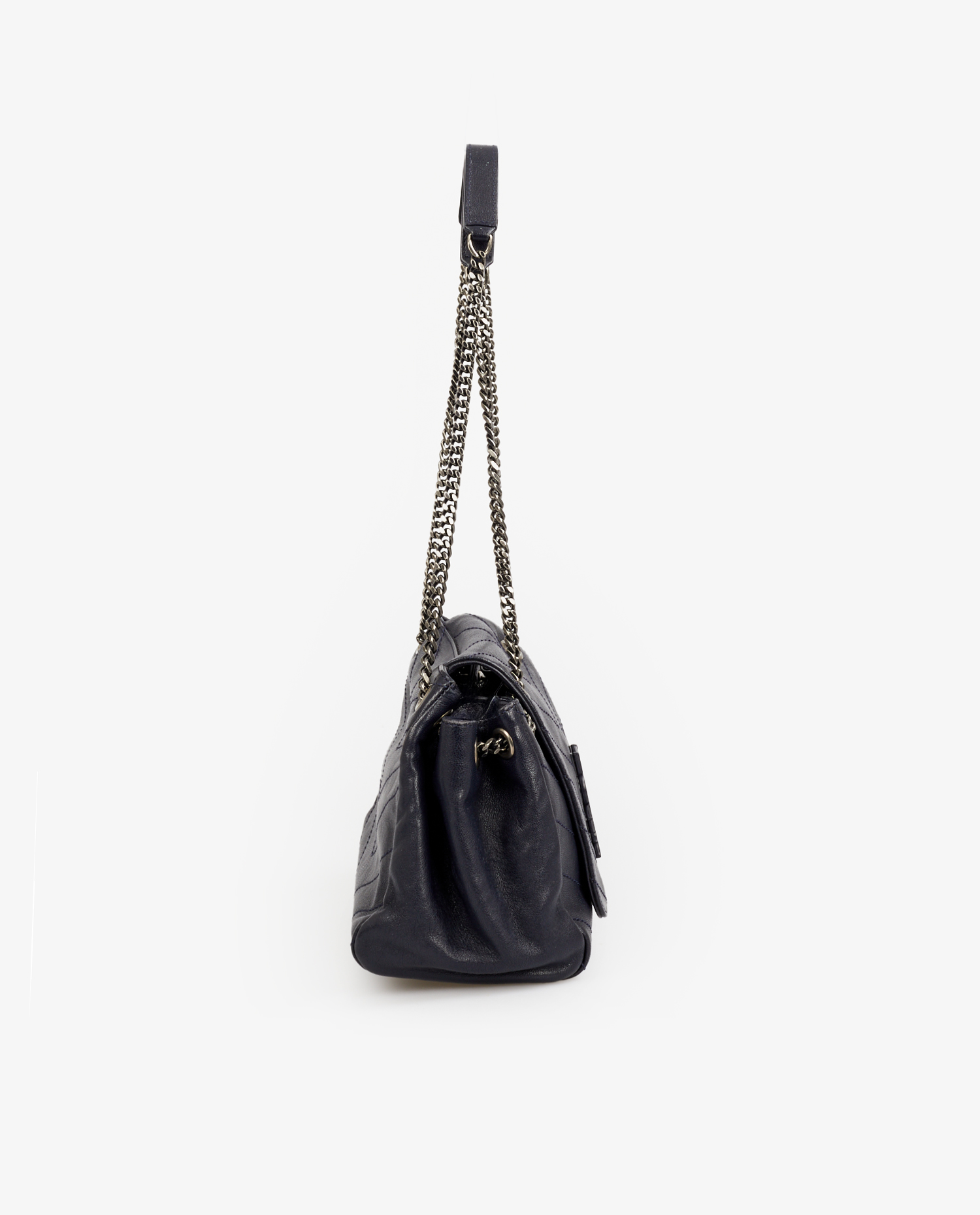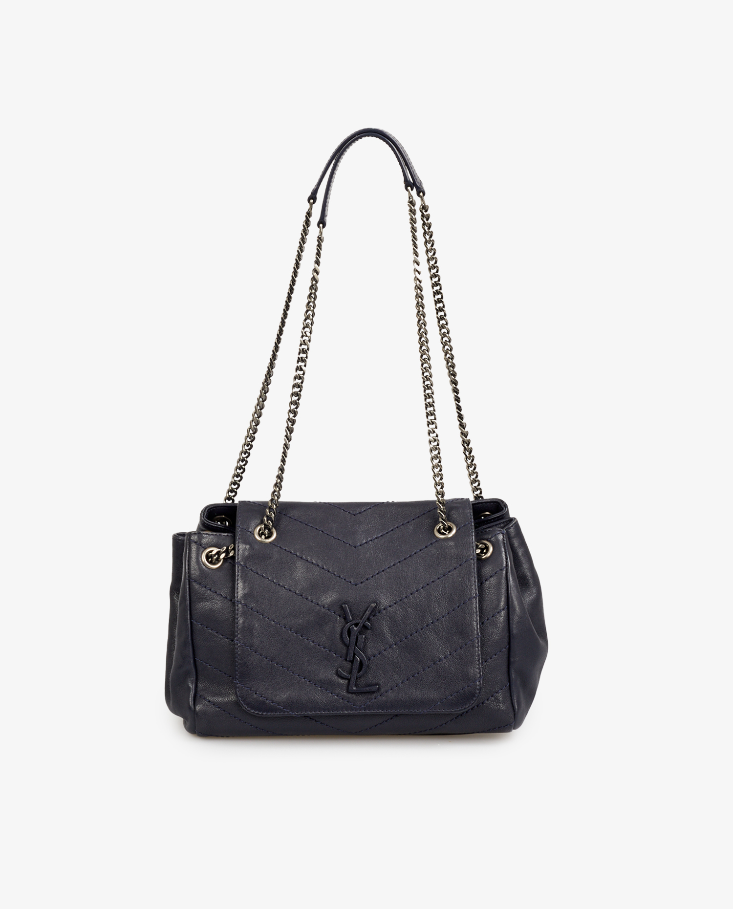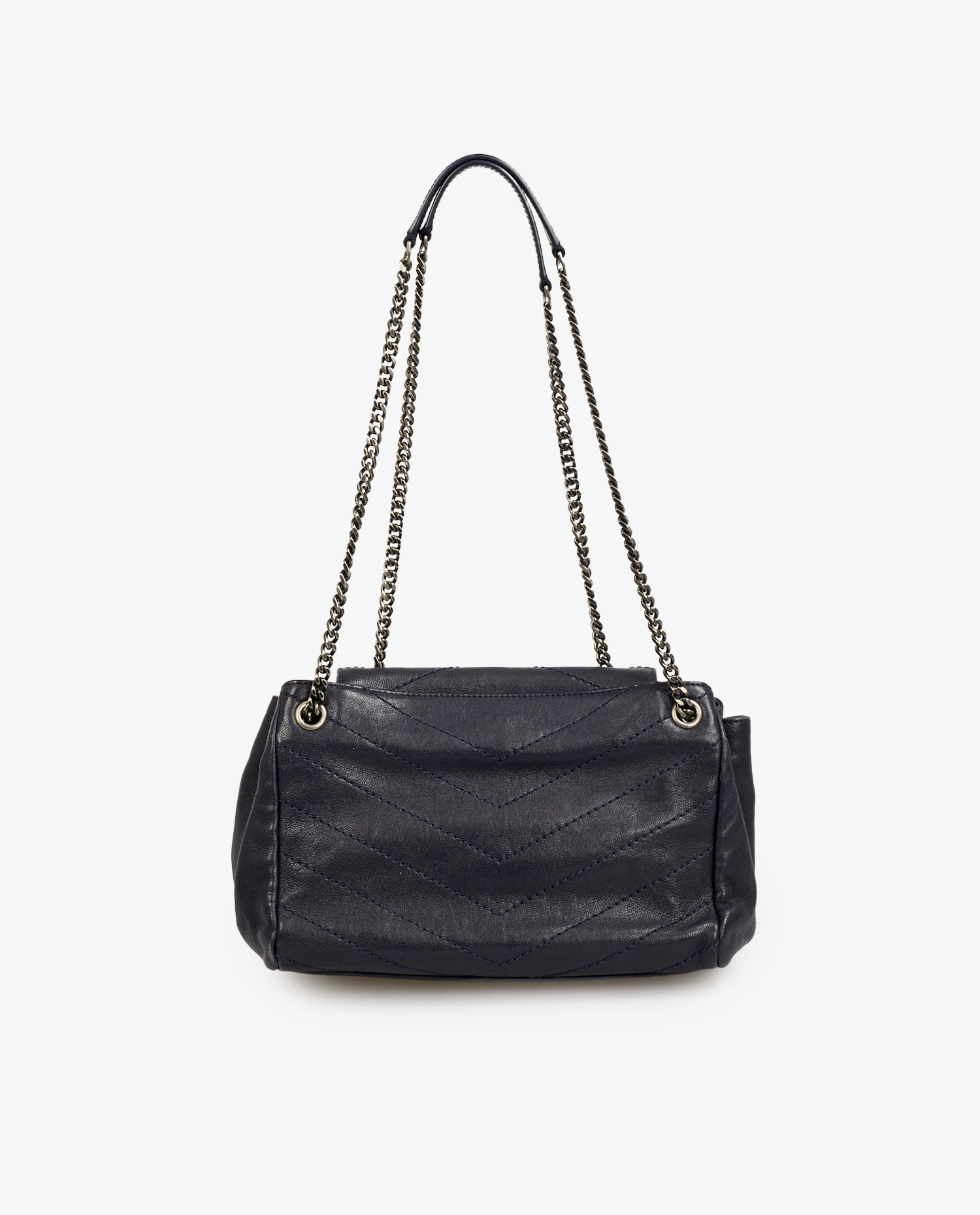 Sac Nolita Yves Saint Laurent en cuir bleu marine. Porté épaule ou croisé à l’aide d’une bandoulière coulissante en chaine argent et renforcement en cuir. En très bon état.