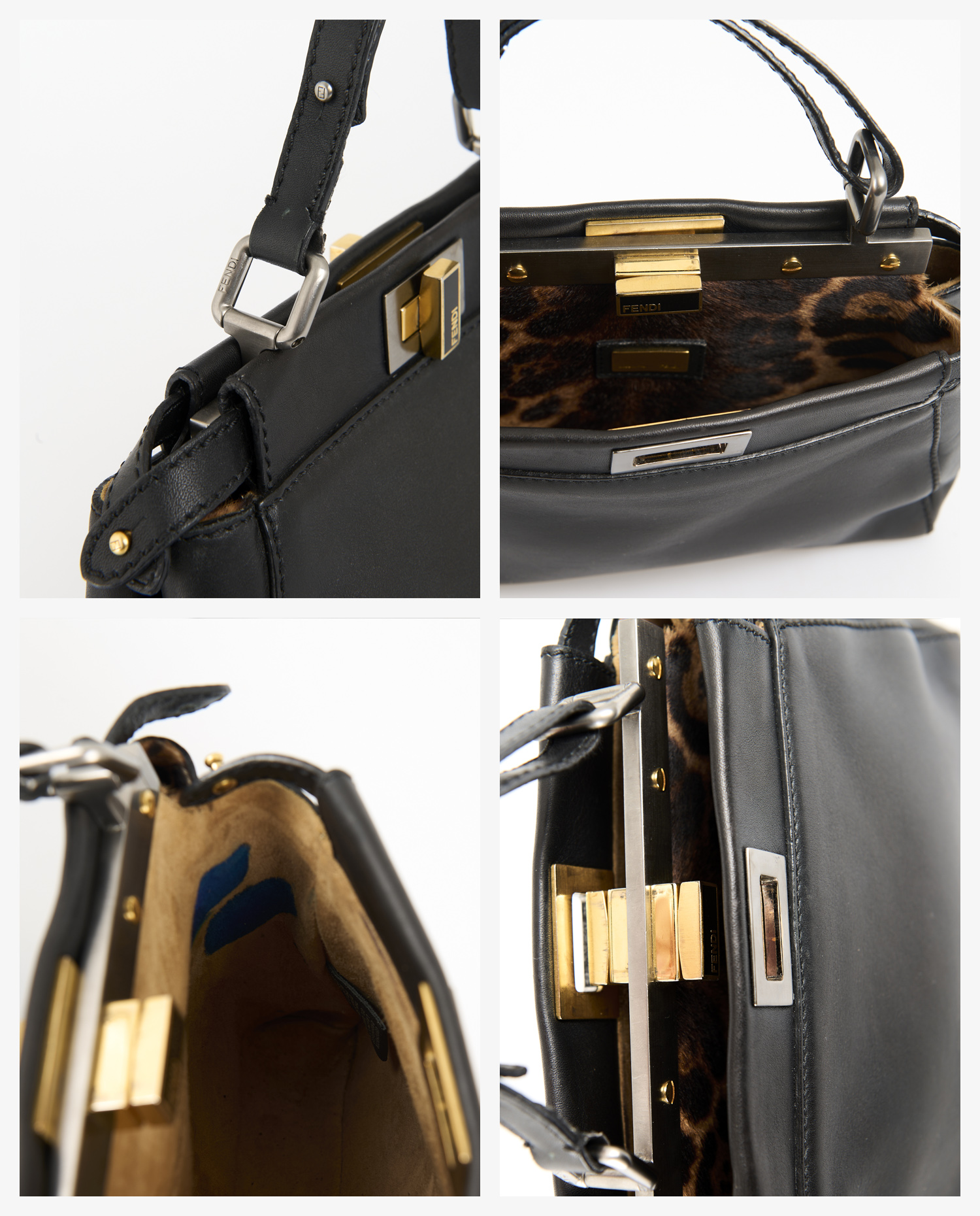 Le Peekaboo s’ouvre en deux compartiments distincts, séparés par une paroi rigide. L’un est doublé de suédine beige, l’autre d’un tissu à imprimé léopard, emblématique des finitions inattendues propres à Fendi. Chaque compartiment dispose d’une fermeture à tourniquet indépendante, maintenant les effets personnels en sécurité. Ce contraste intérieur reflète la dualité du modèle : sobre à l’extérieur, audacieux à l’intérieur.