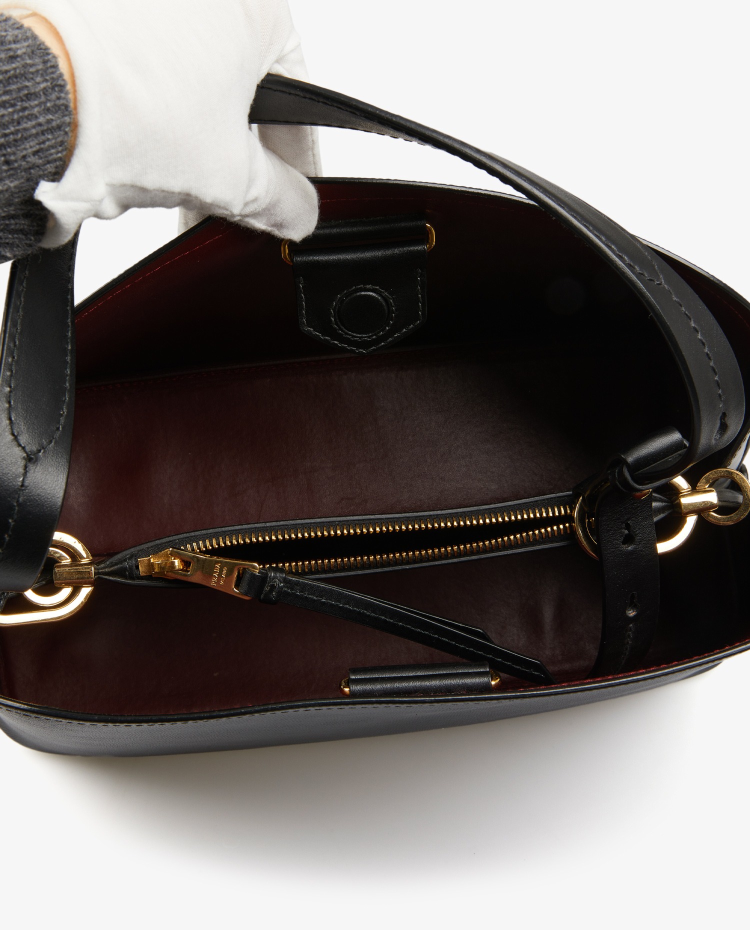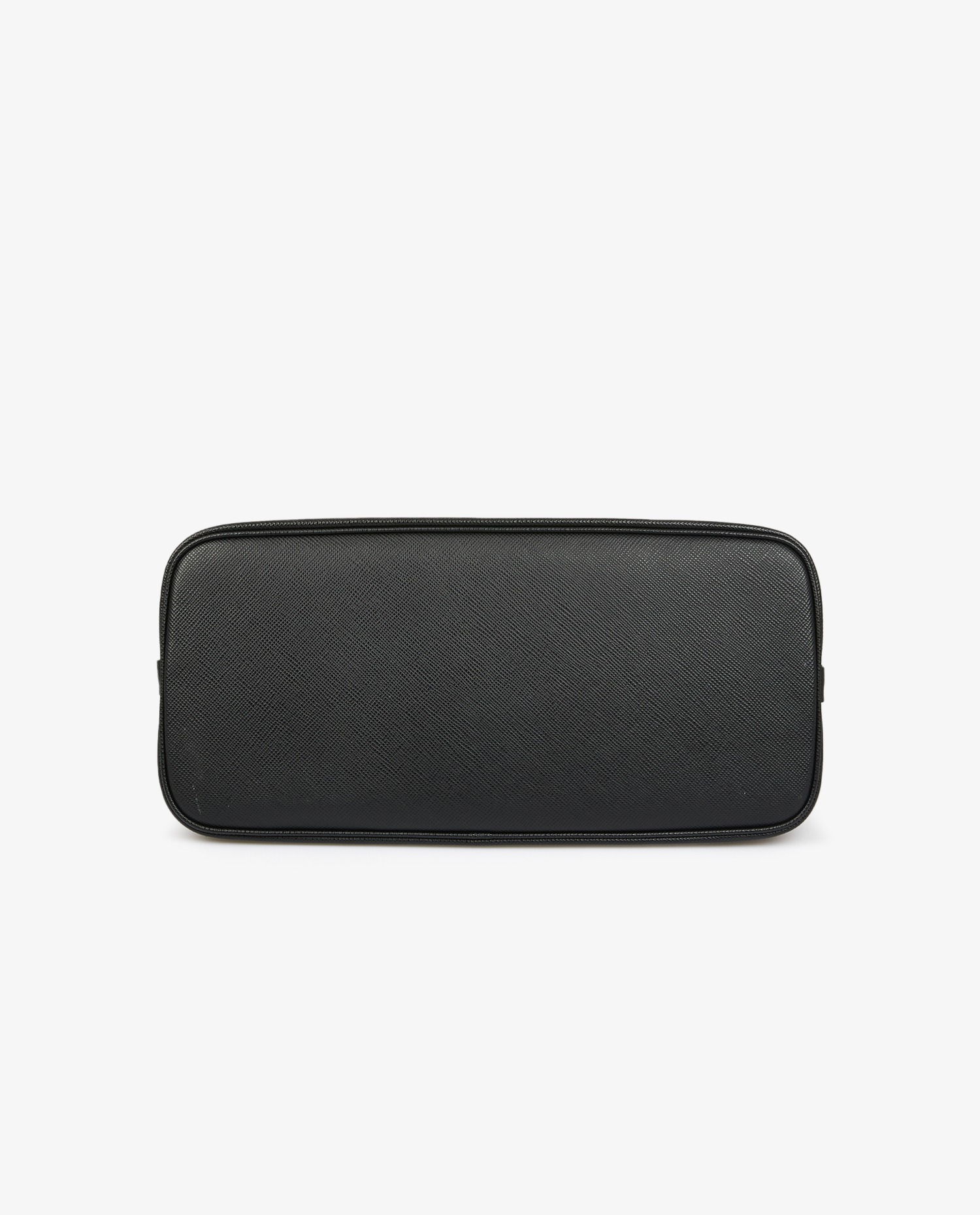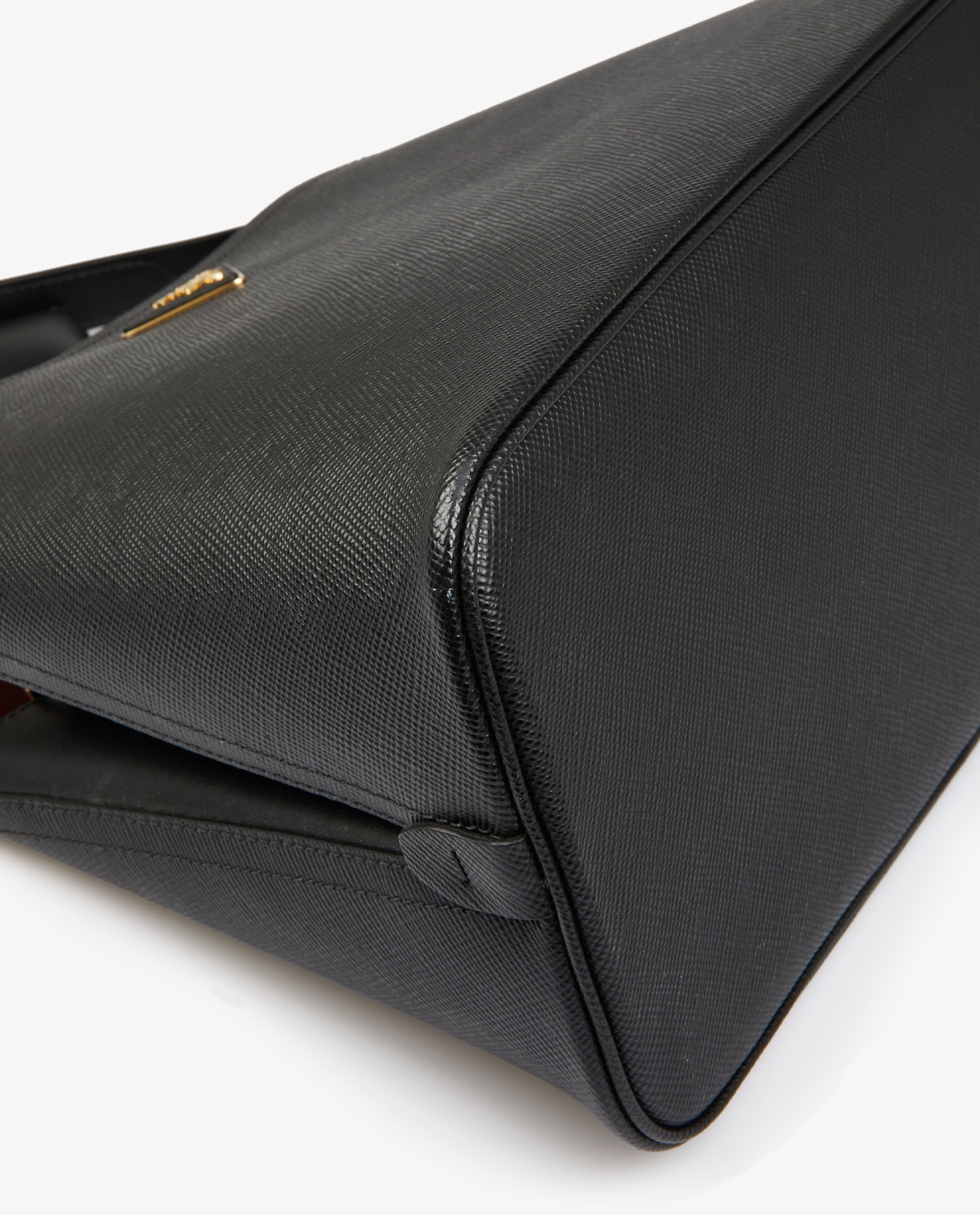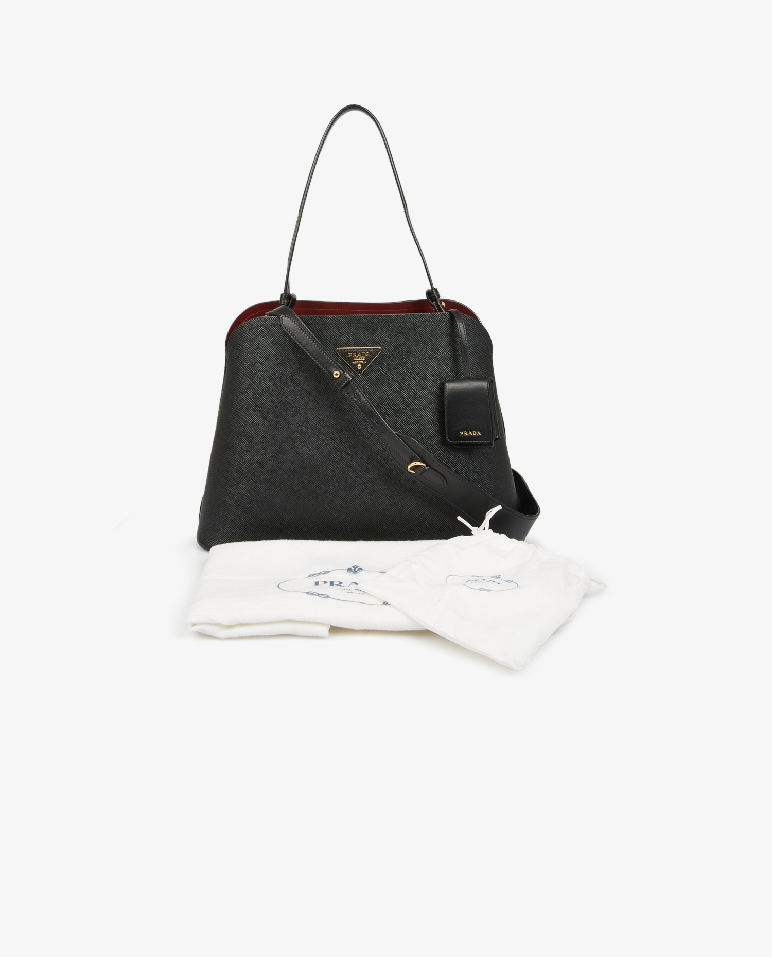 Grand sac Prada “Matinée” en cuir Saffiano noir. L’intérieur est en nappa bordeaux avec deux compartiments intérieurs. Porté à l’épaule à l’aide d’une anse amovible et crossbody avec une bandoulière amovible également. Jamais porté.