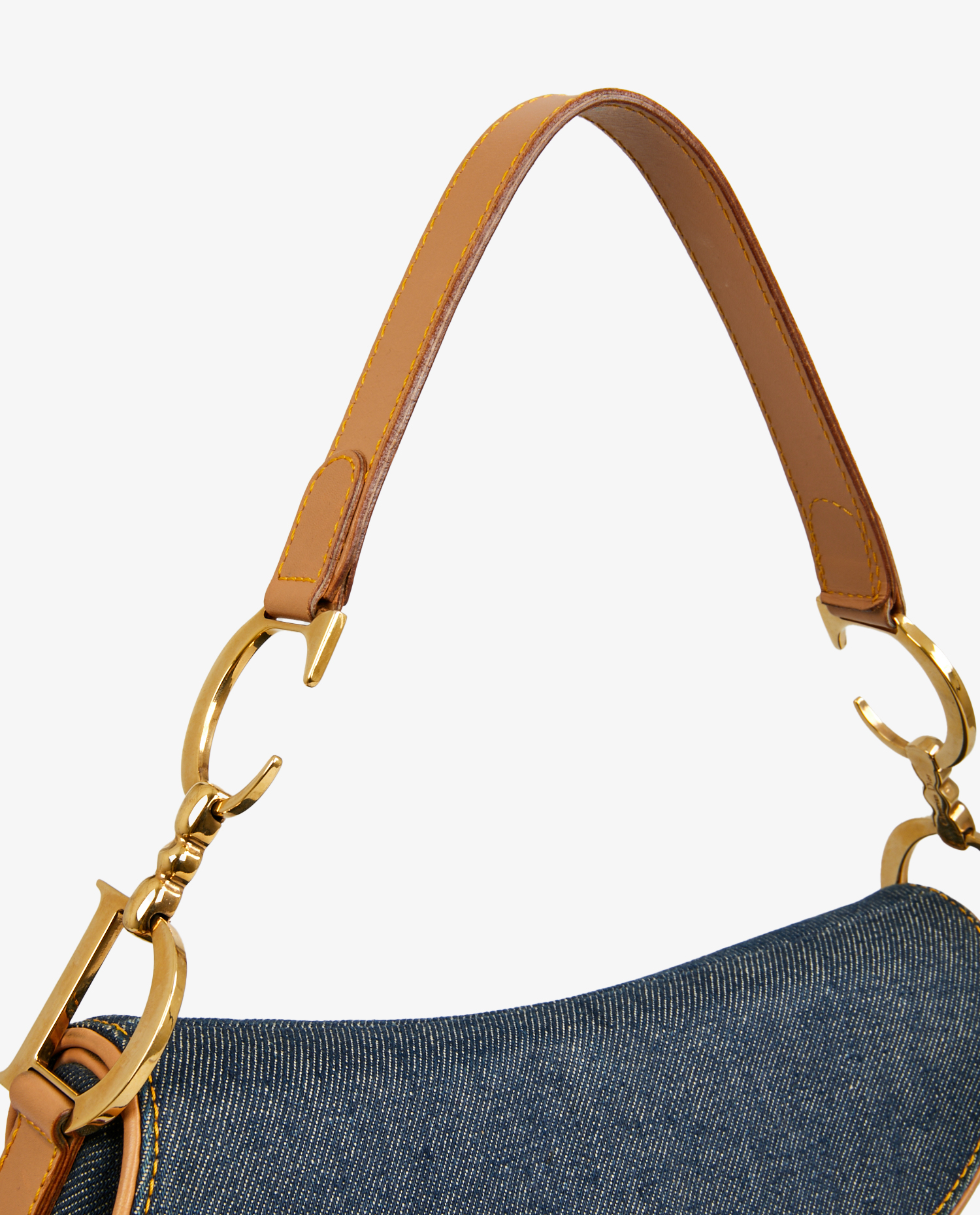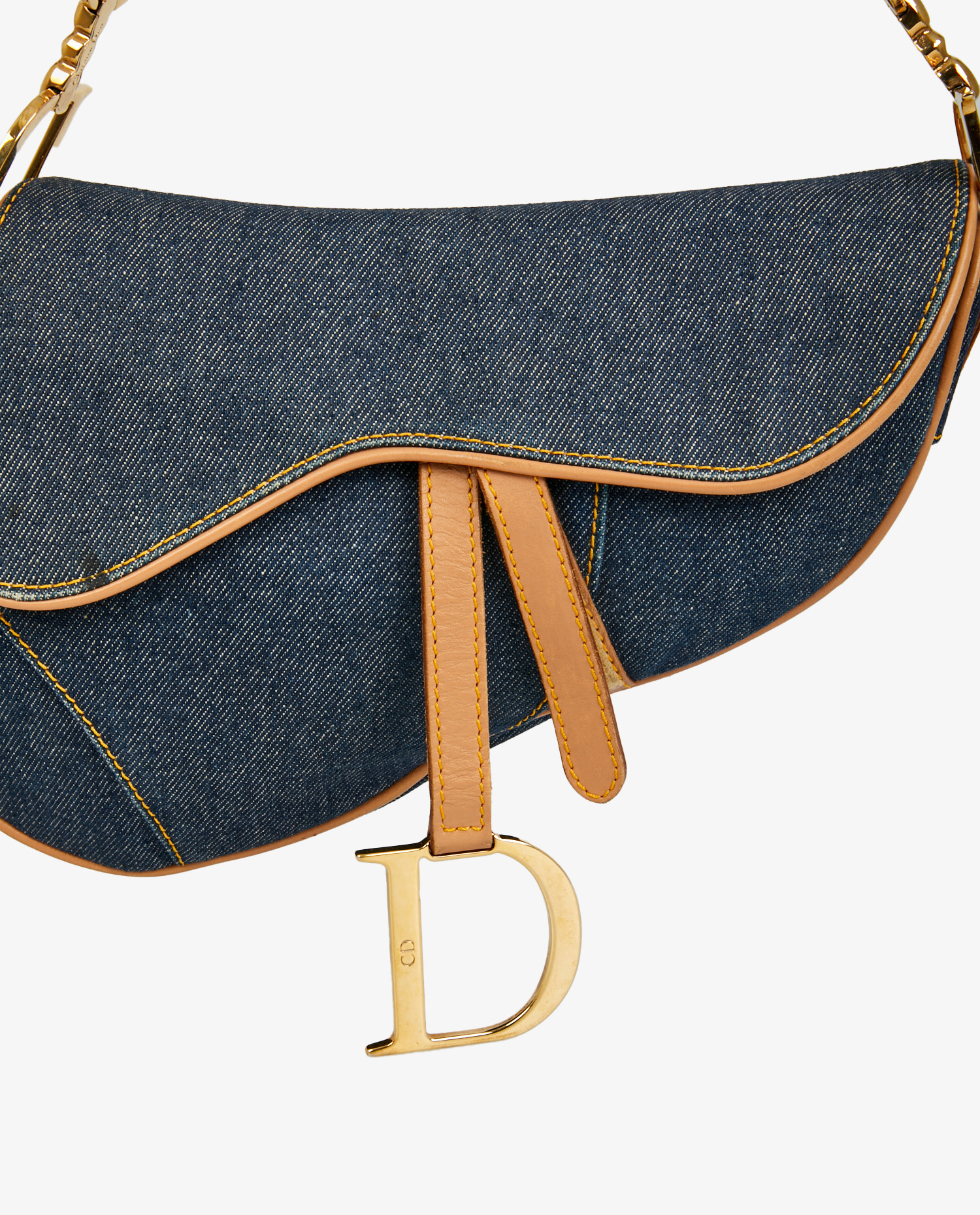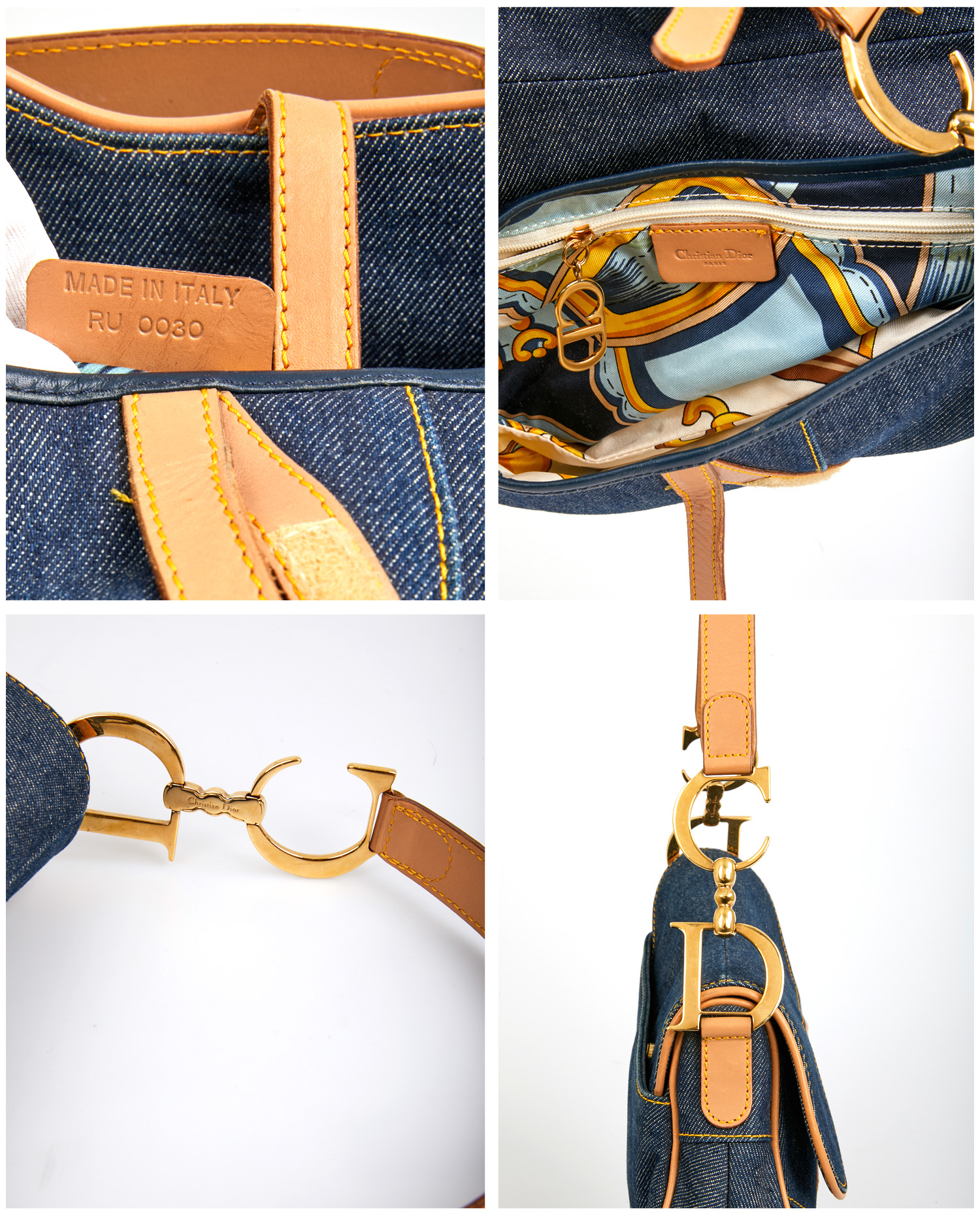 Sac Saddle Christian Dior vintage en toile denim bleu. Bijouterie en métal doré. Finitions en cuir de veau gold. Porté épaule. L’intérieur est en toile multicolore. En très bon état. Une tâche est visible sur le rabat ainsi que quelques rayures sur la bijouterie. Voir photos.