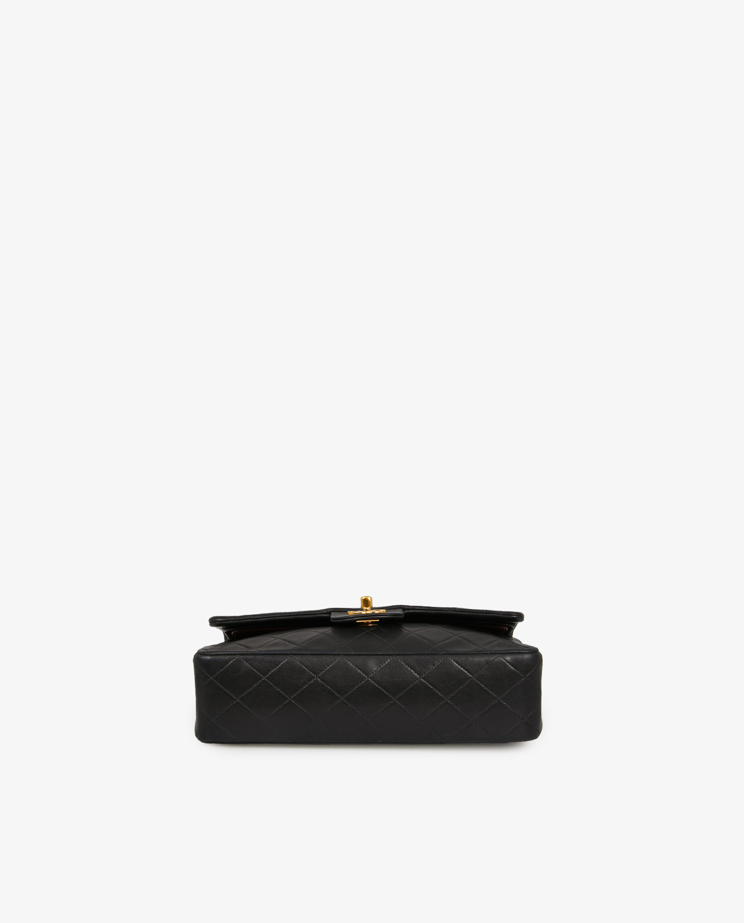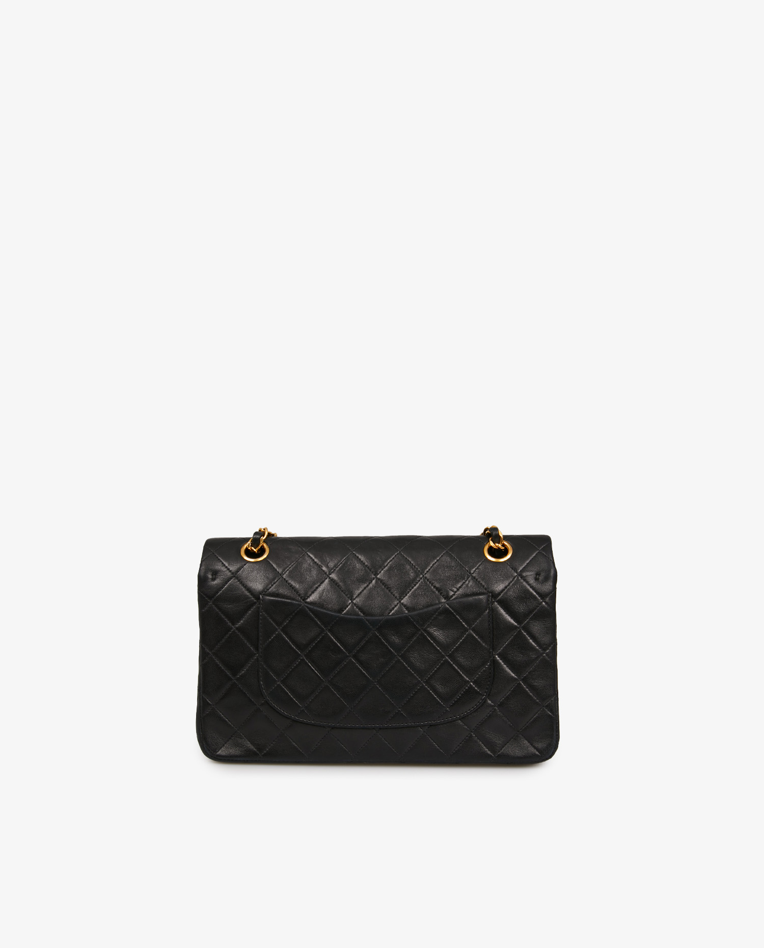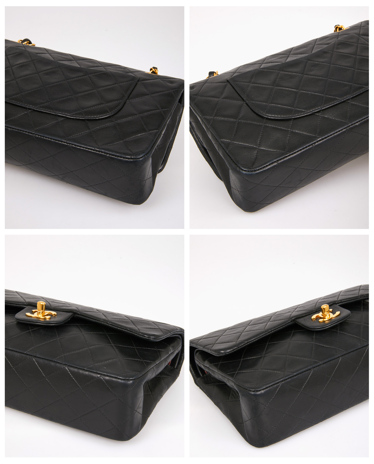 Le cuir d’agneau noir présente un matelassage losangé précis, offrant une texture lisse et légèrement brillante. Le sac est orné du fermoir emblématique CC en métal doré 24 carats, ainsi que d’une bandoulière chaîne en métal doré entrelacée de cuir noir, typique des sacs Chanel classiques. Au dos, une poche plaquée à courbe signature ajoute une touche fonctionnelle sans nuire à l’harmonie des lignes. Les coins sont bien conservés et les surpiqûres nettes.
