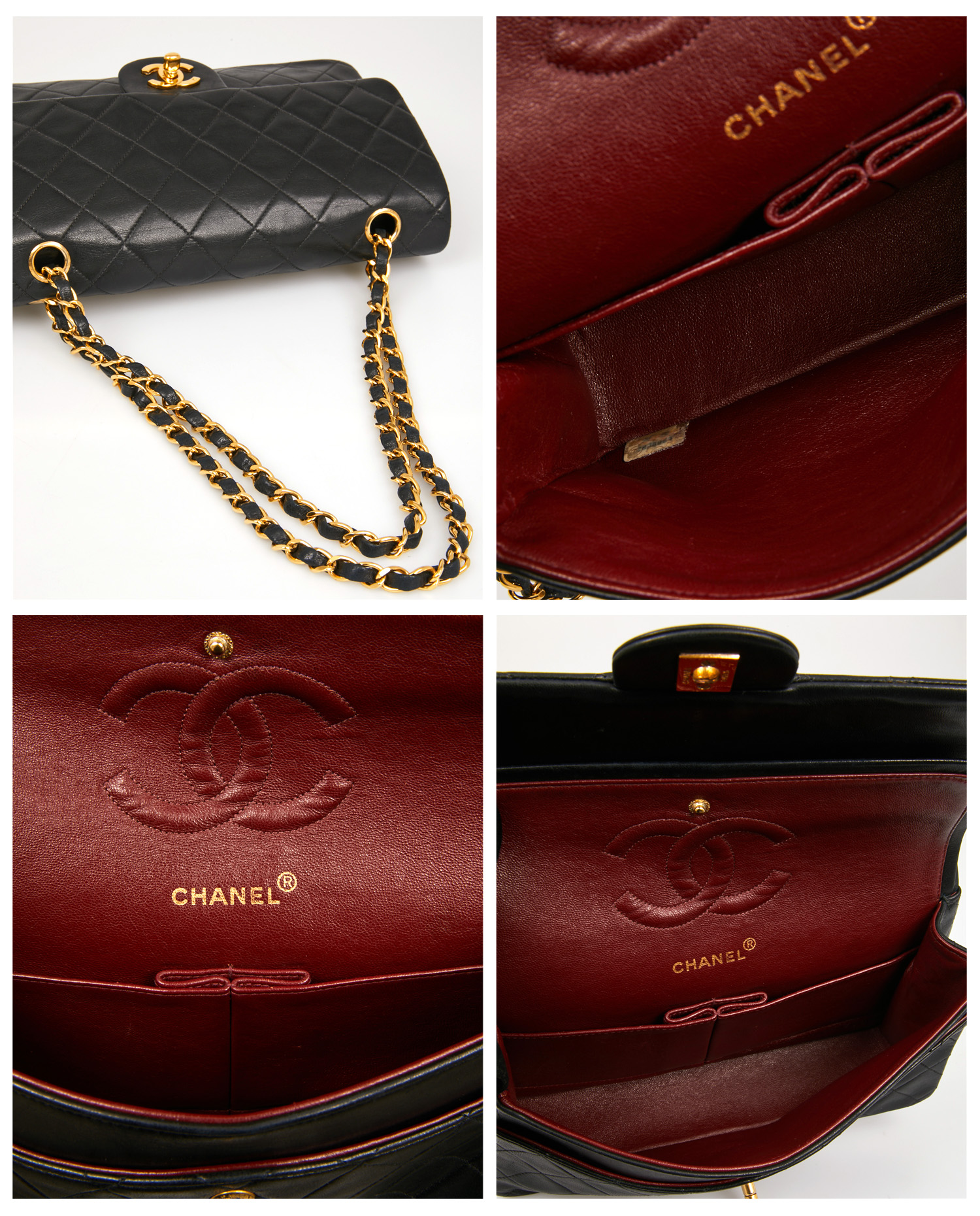 L’intérieur, entièrement doublé de cuir bordeaux, est composé d’un premier rabat avec bouton pression doré, puis d’un second rabat à fermoir CC. Il contient plusieurs compartiments : une poche zippée sous le rabat, deux poches plaquées ainsi qu’un compartiment central. Le logo CHANEL® doré et le double C embossé sont présents à l’intérieur, et l’hologramme d’origine est toujours visible, indiquant une production entre 1991 et 1994 (série 2XXXXXX).