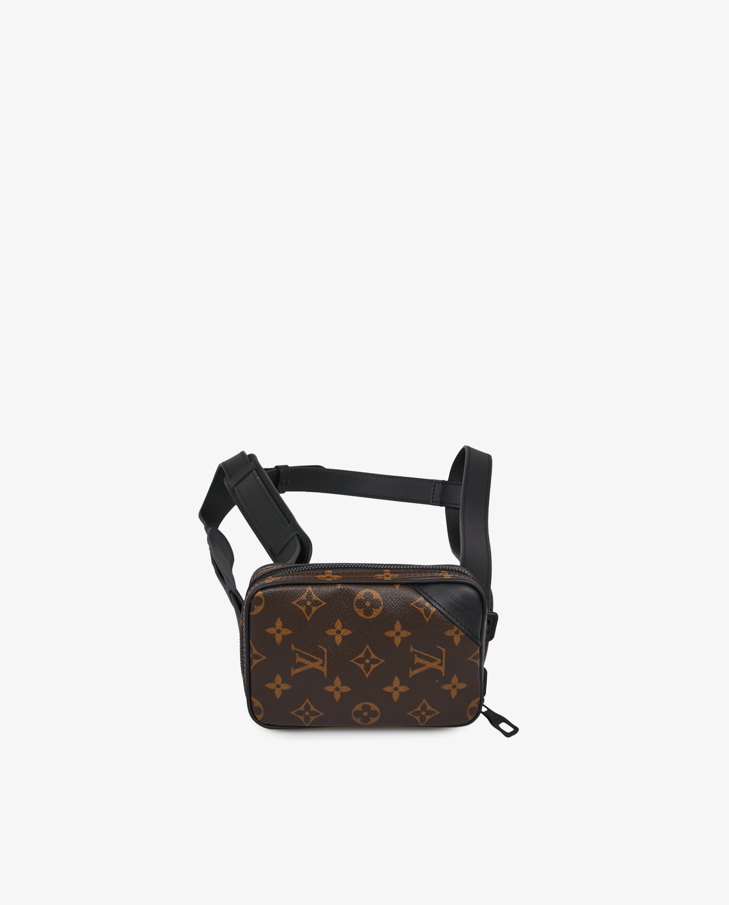 La toile Monogram marron est rehaussée de détails en cuir noir lisse sur les coins et les finitions, créant un contraste subtil et graphique. Le format compact et structuré rappelle les malles emblématiques de la maison, tandis que le système de port harnais en cuir et textile technique noir permet un porté ajusté au corps, pensé pour un look mode et fonctionnel. Les fermetures zippées noires mates soulignent l’esprit contemporain de l’ensemble.