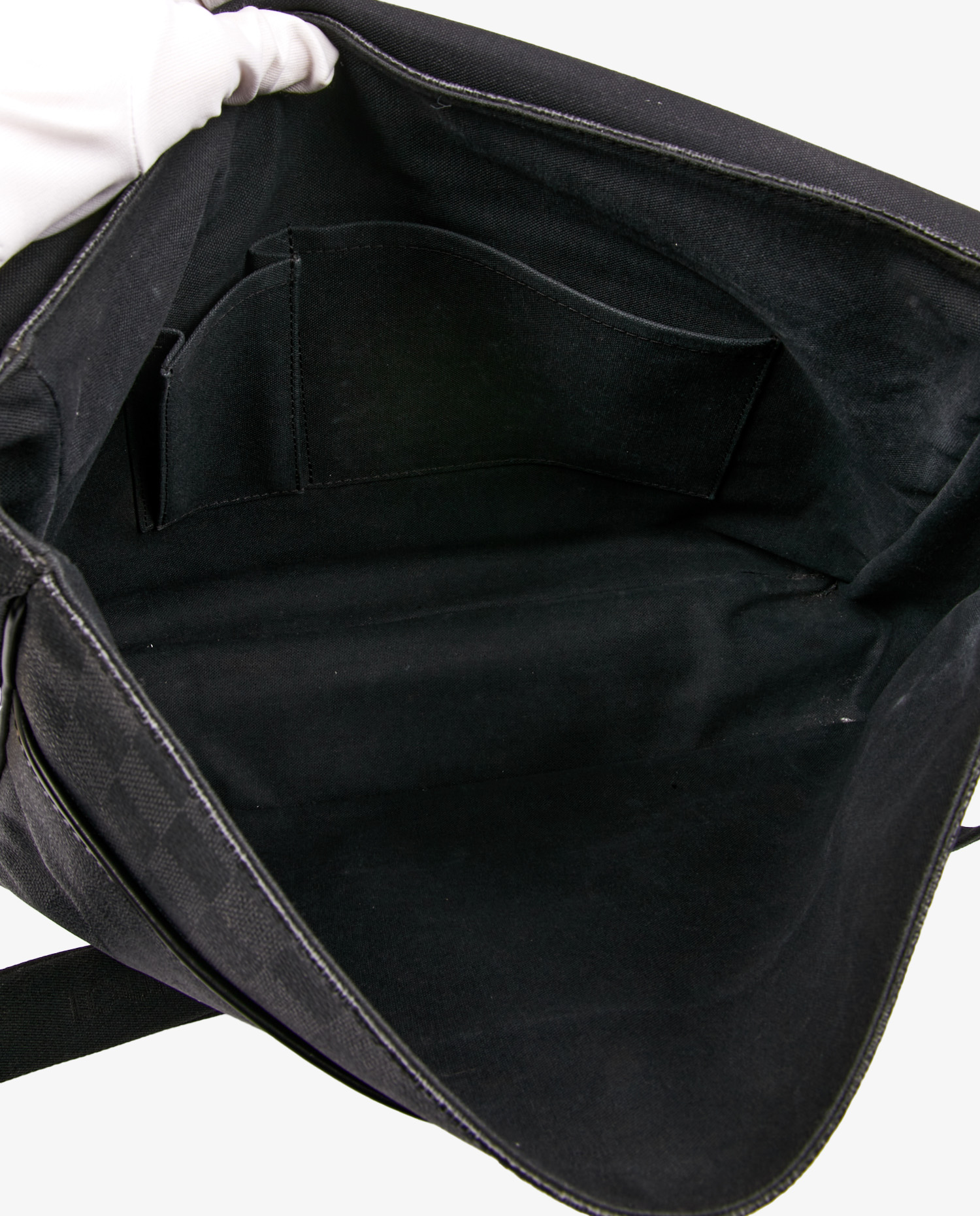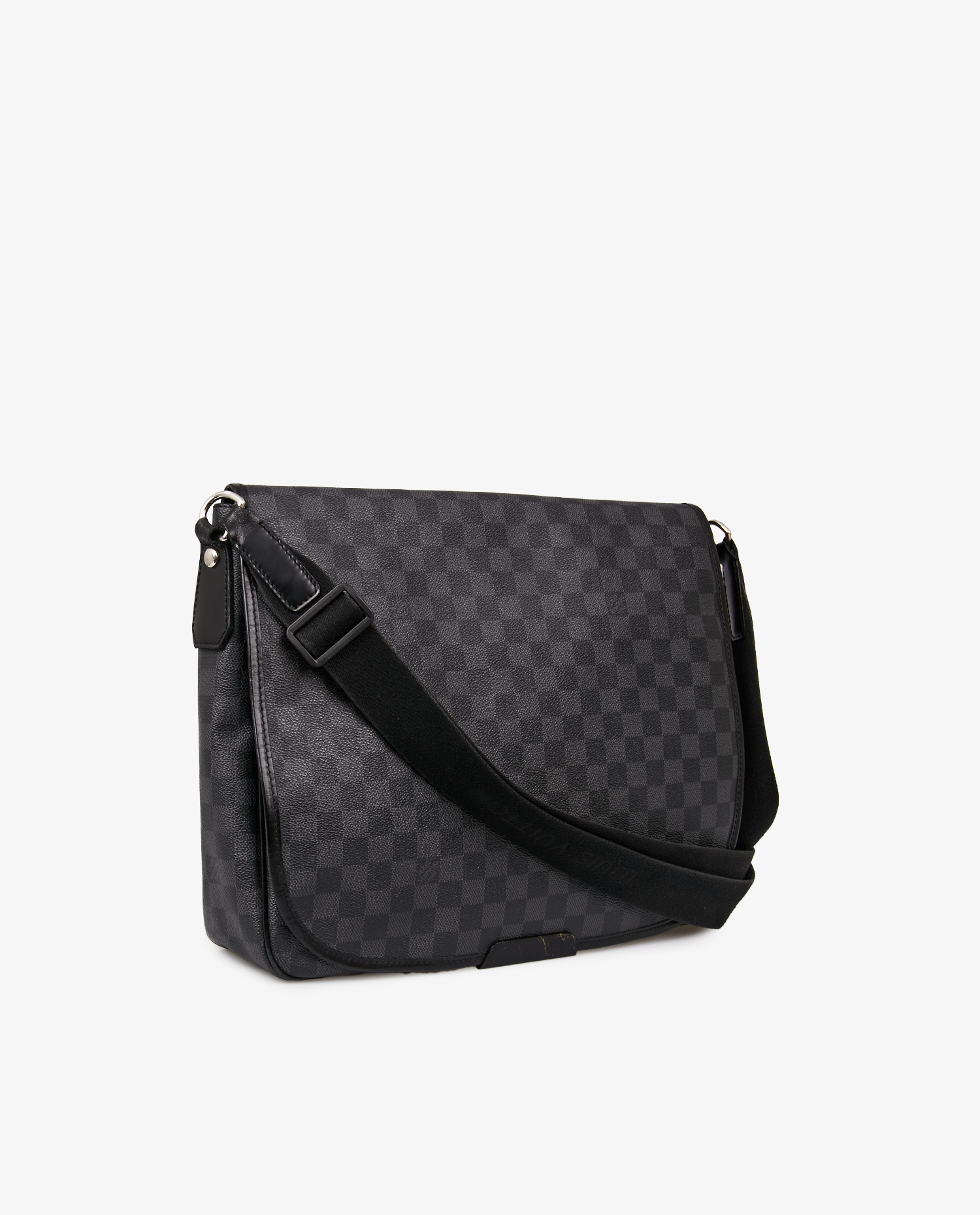 La toile Damier Graphite, reconnaissable à son motif quadrillé noir et gris anthracite, confère au sac une allure contemporaine tout en restant discrète. Le rabat se ferme par un système aimanté parfaitement intégré. Une large poche plaquée se trouve sous ce rabat, tandis qu’une poche zippée est positionnée à l’arrière, où l’on retrouve également le numéro de série du sac. La bandoulière ajustable en toile noire est brodée ton sur ton du nom “Louis Vuitton”, renforçant la signature visuelle du modèle tout en assurant un confort au porté.